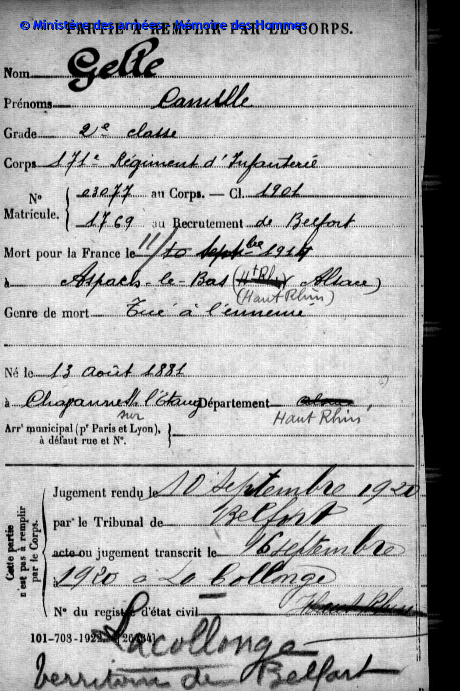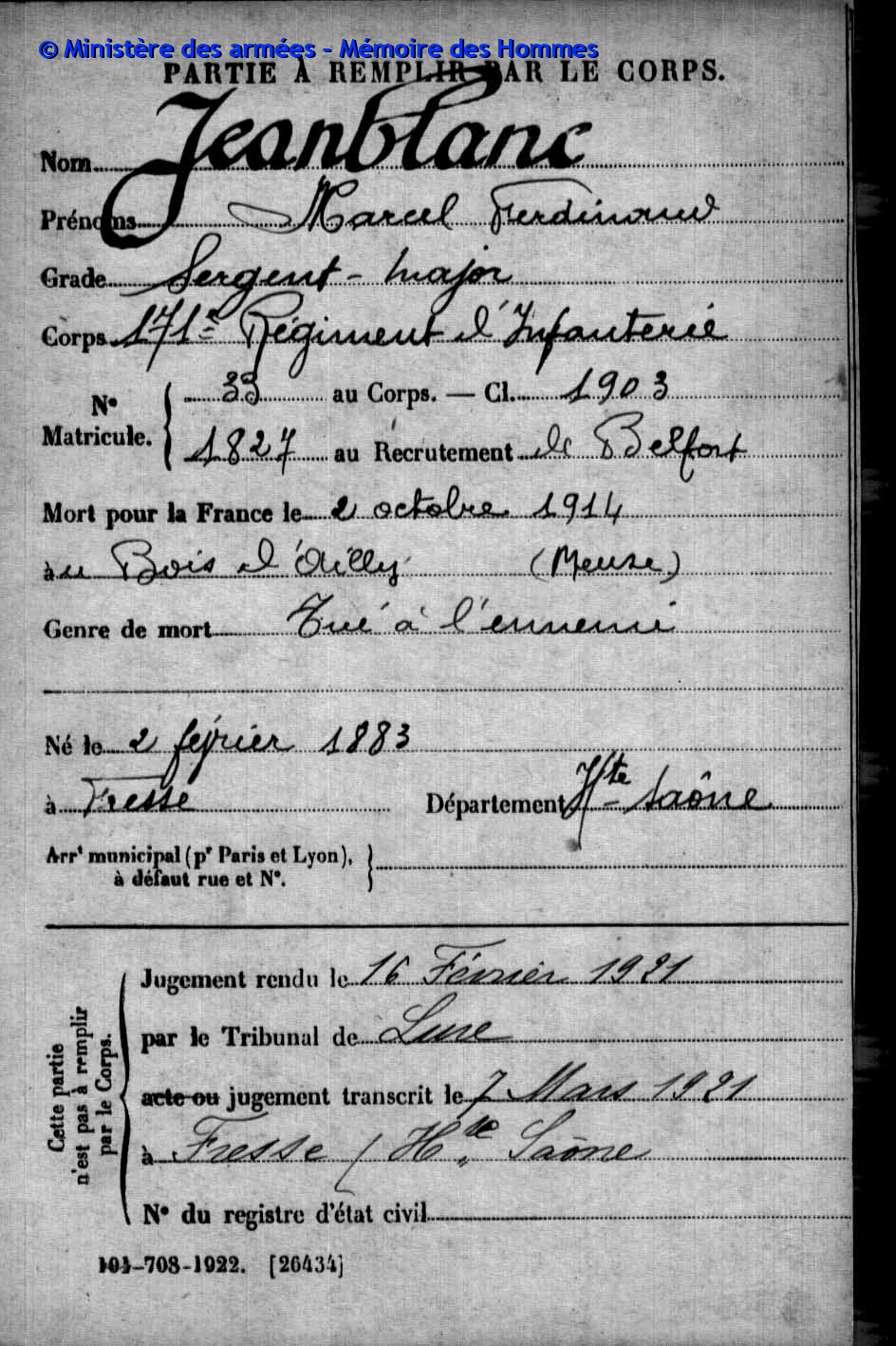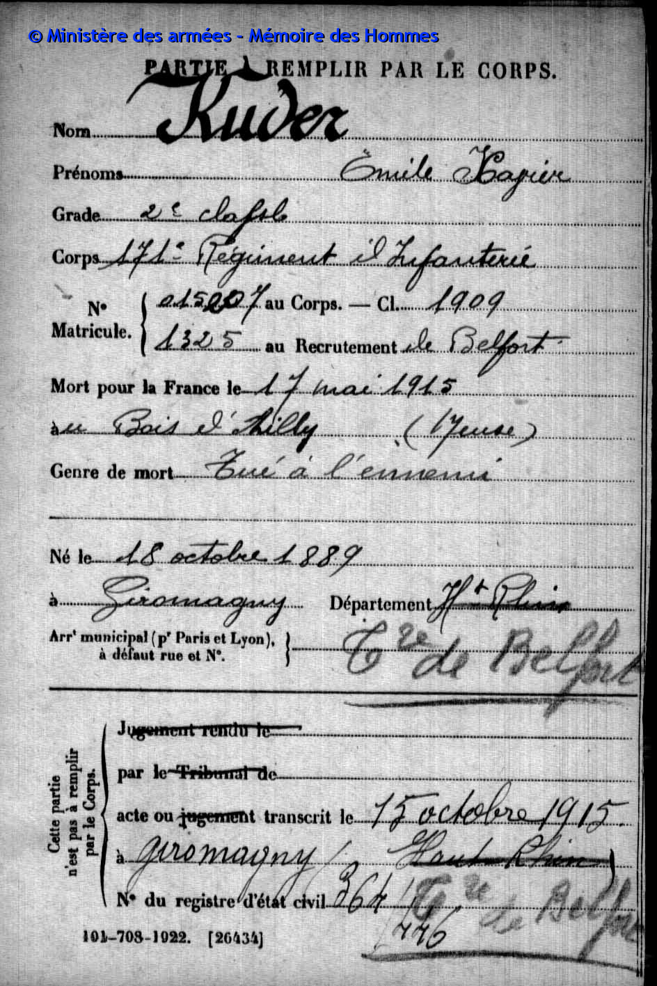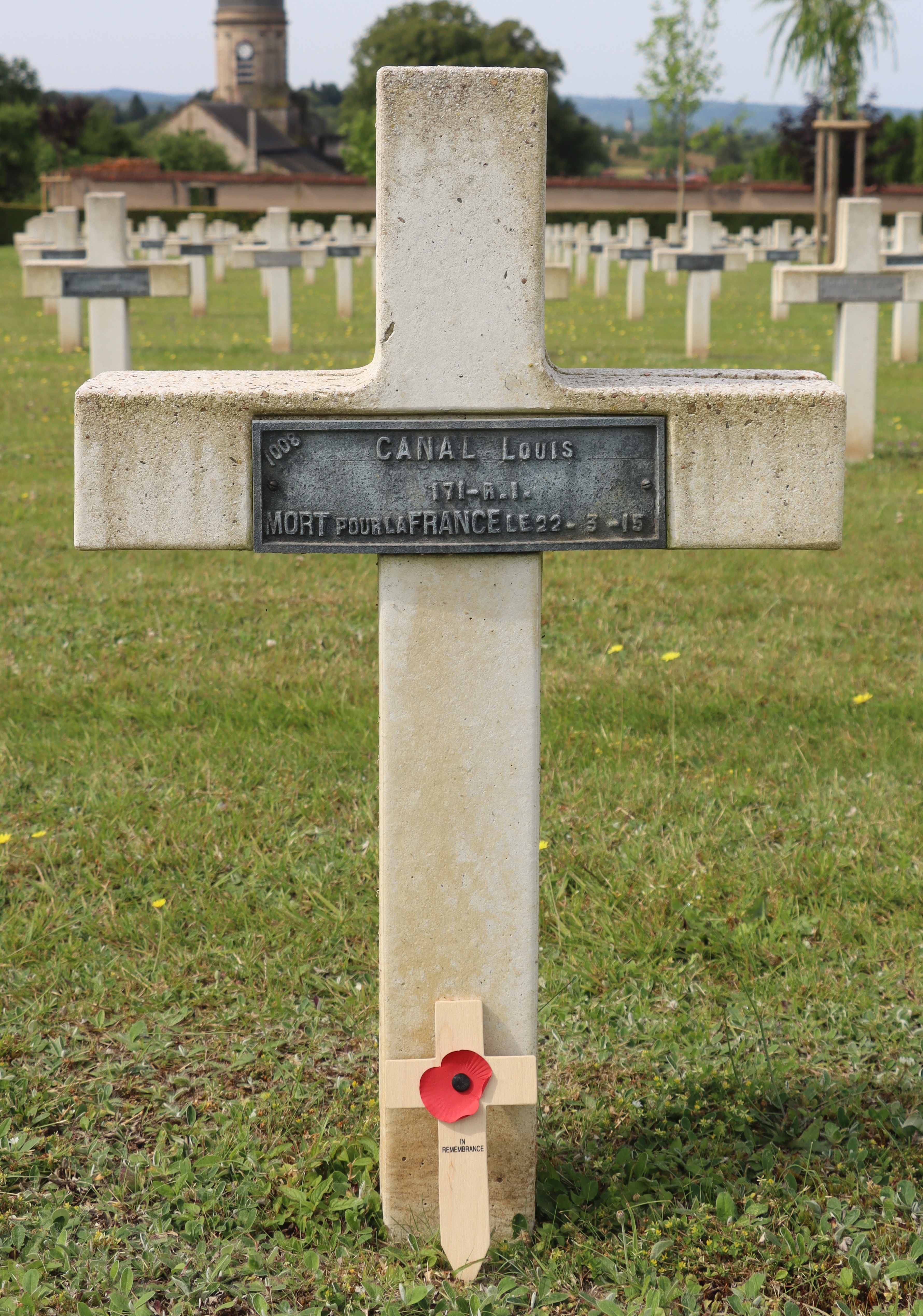 2ème classe CANAL Charles Joseph 31.07.1888 - 10.12.1914 171ème Régiment d'Infanterie Gefallen in Apremont - Meuse (F) |