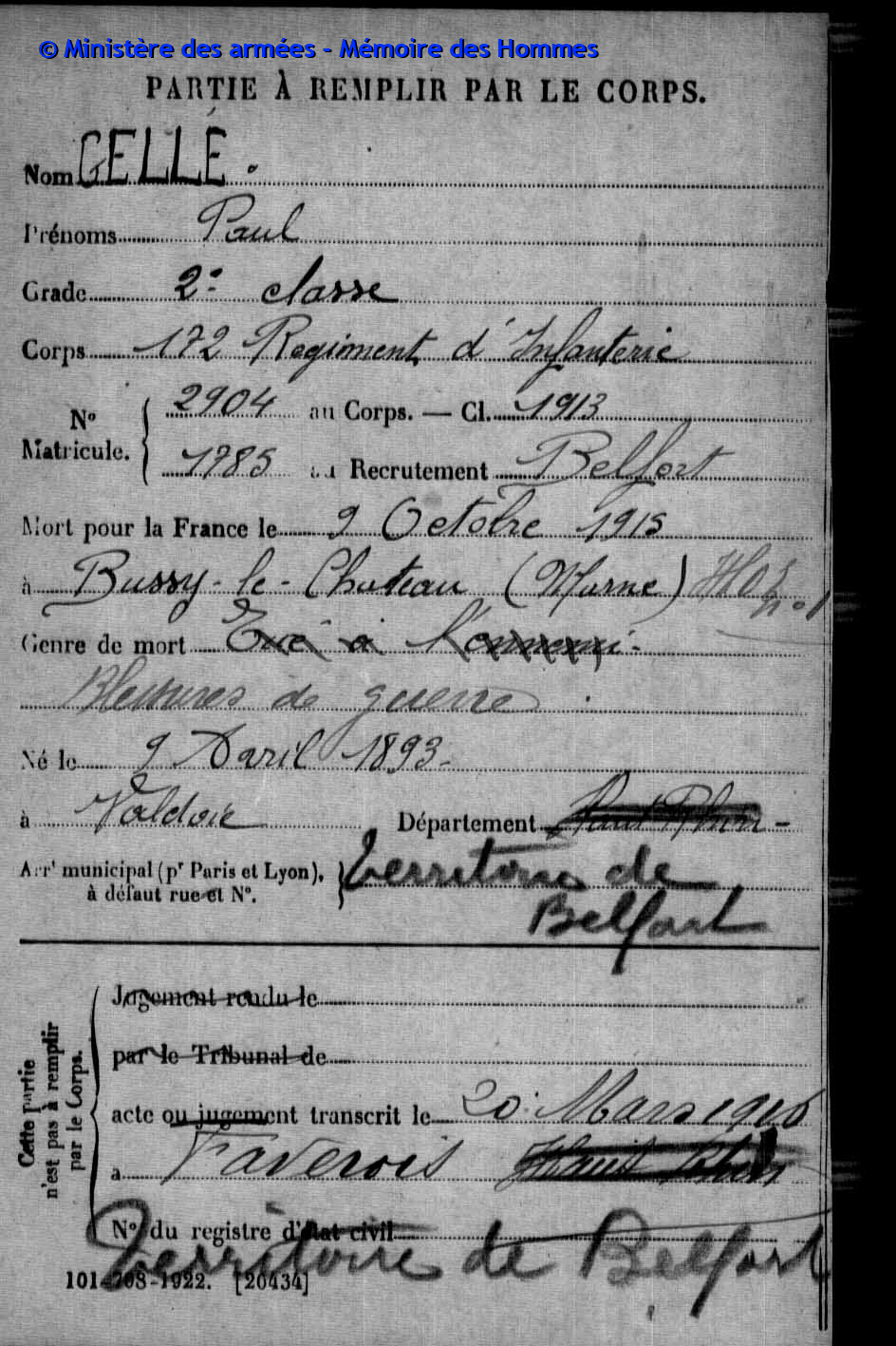 2ème classe GELLE Paul 09.04.1893 - 09.10.15 172ème Régiment d'Infanterie Gefallen in Bussy-le-Chateau - Marne (F) |