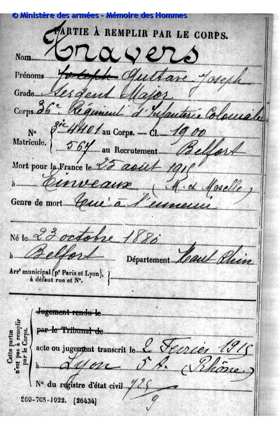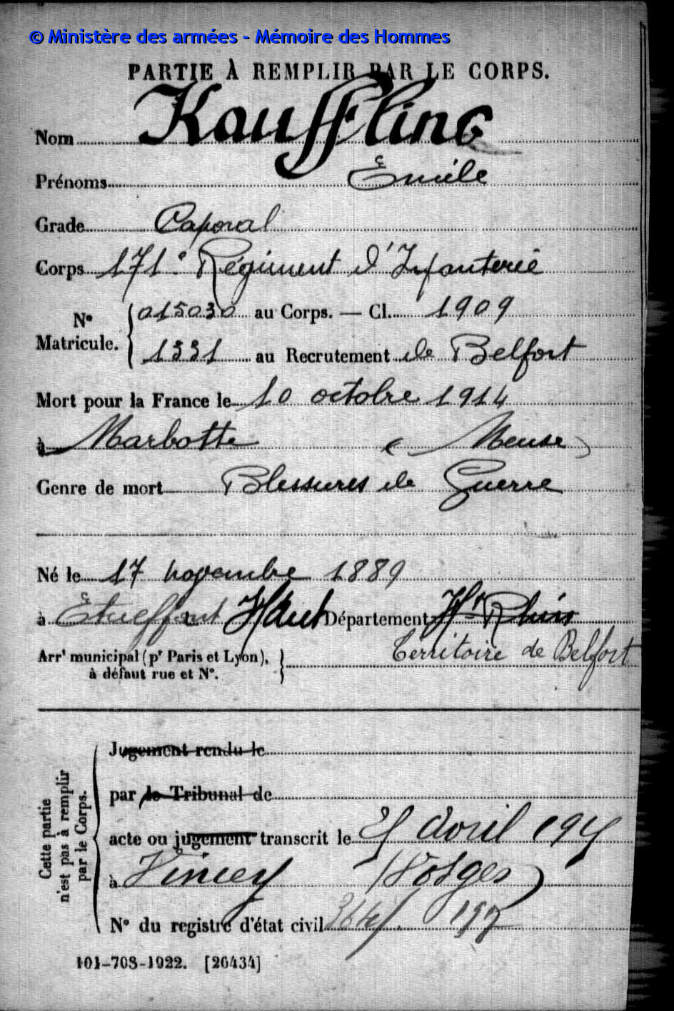 | Soldat KAUFFLING Xavier Joseph 15.10.1883 - 18.09.1914 42ème Régiment d'Infanterie Gilt als vermisst in Autreches - Oise (F) |
