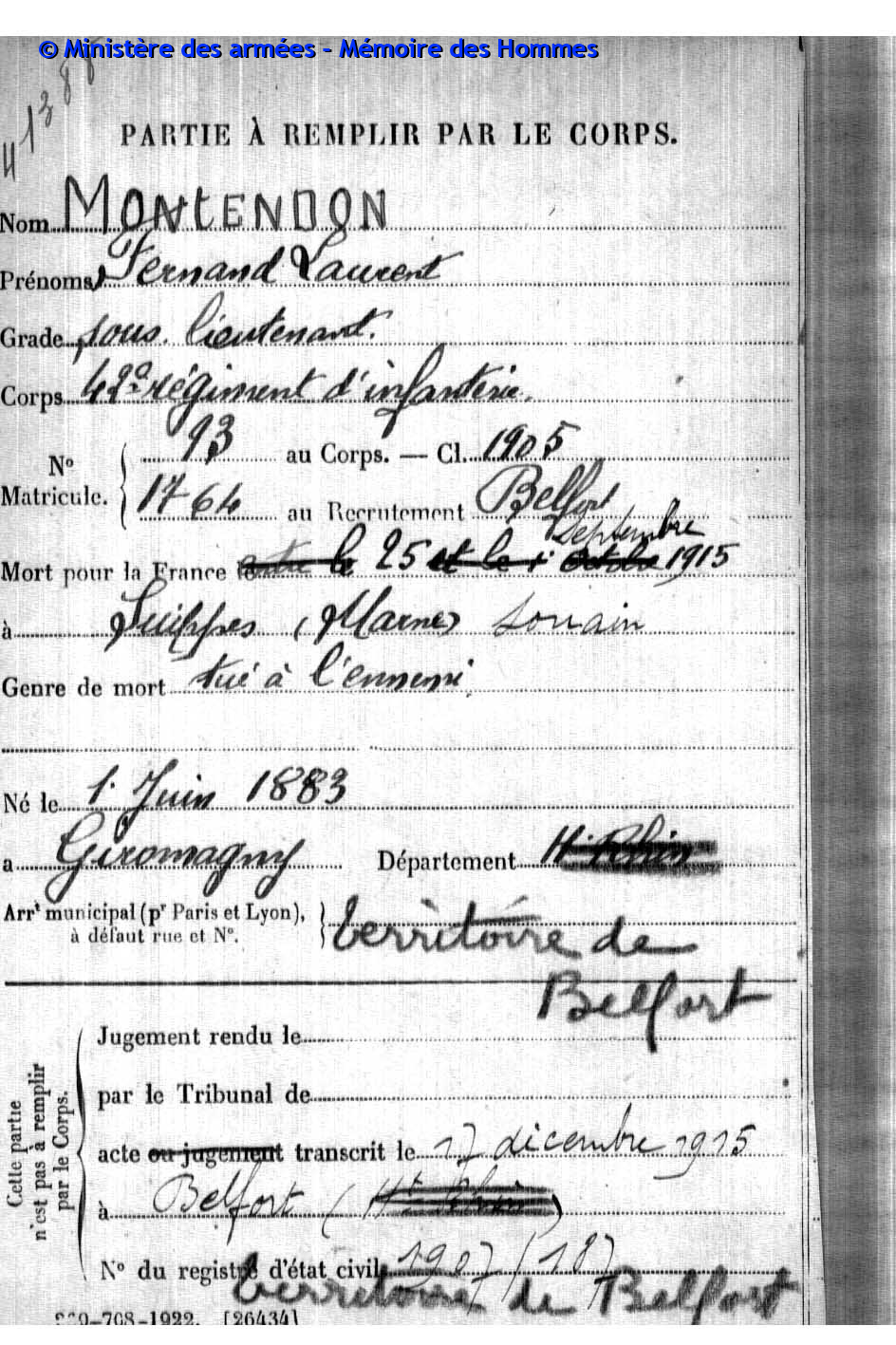 Sous-lieutenant CANAL Camille Joseph 06.09.1894 - 13.05.1916 42ème Régiment d'Infanterie Gefallen beim Fort Vaux in Verdun (F) |