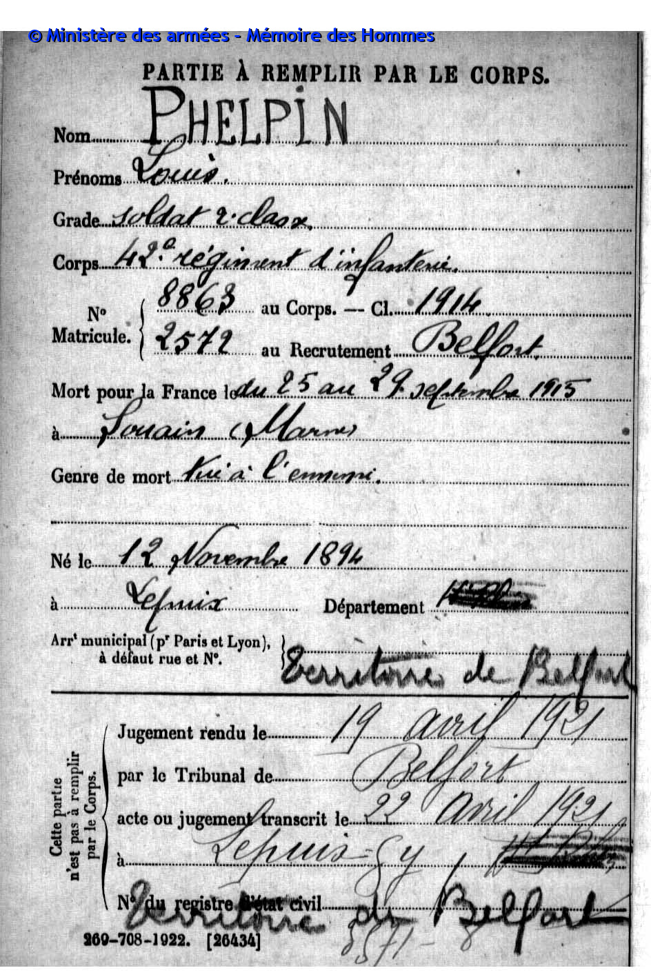 2ème classe PHELPIN Louis 12.11.1894 - 25.09.1915 42ème Régiment d'Infanterie Gefallen in Souain-Perthes-les-Hurlus (F) |