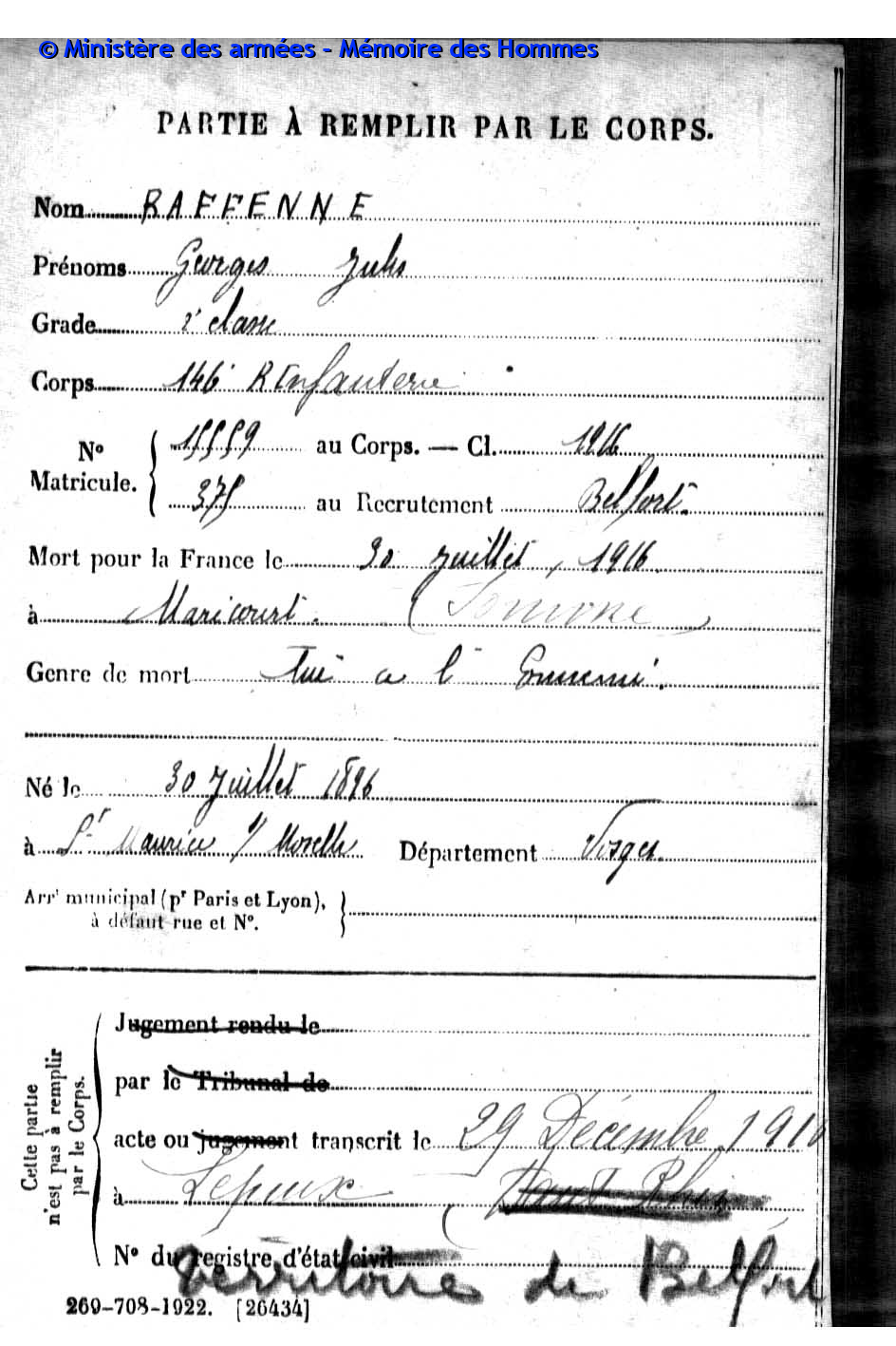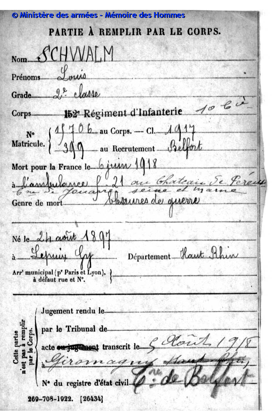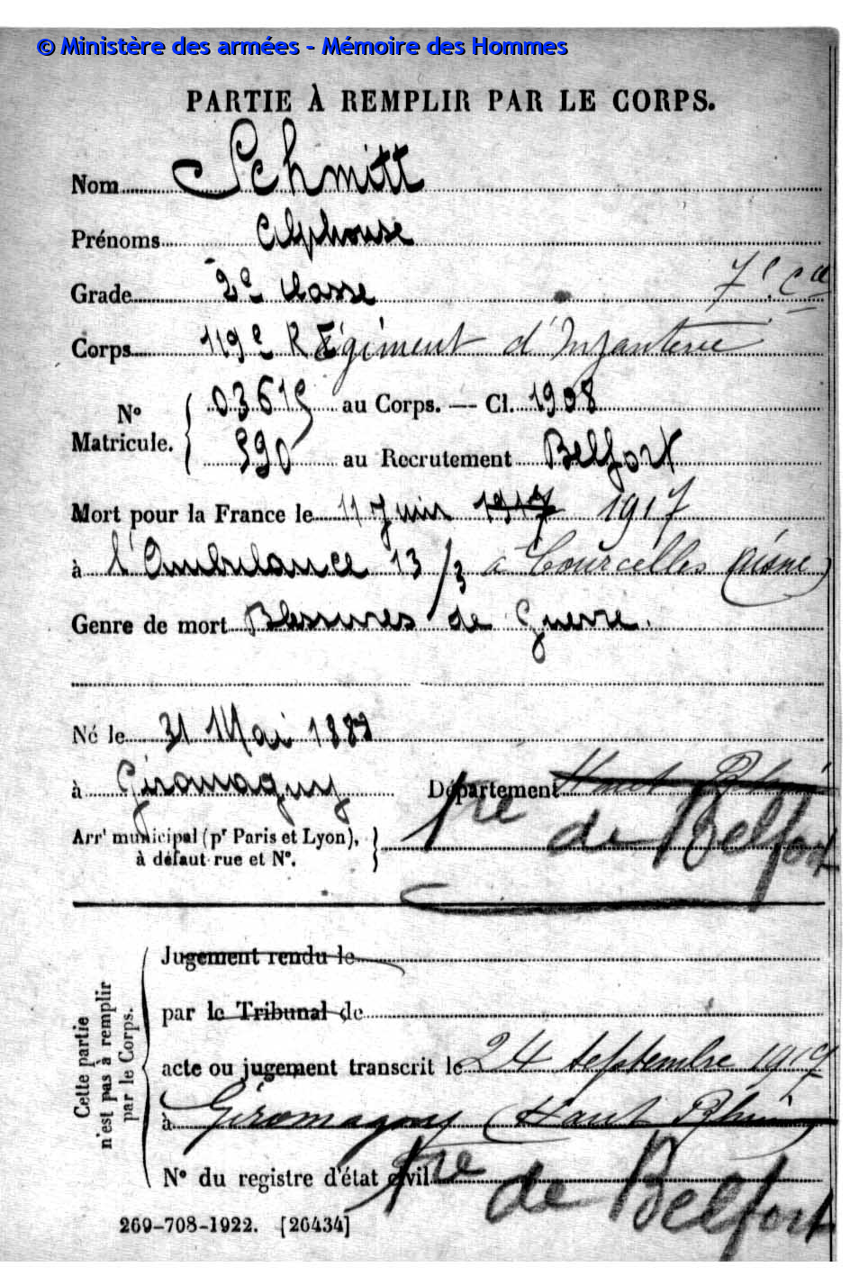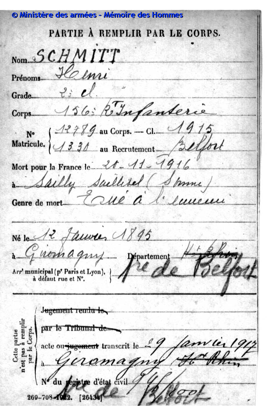 2ème classe SCHMITT Henri 12.01.1895 - 20.11.1916 156ème Régiment d'Infanterie Gefallen in Sailly-Saillisel - Somme (F) |