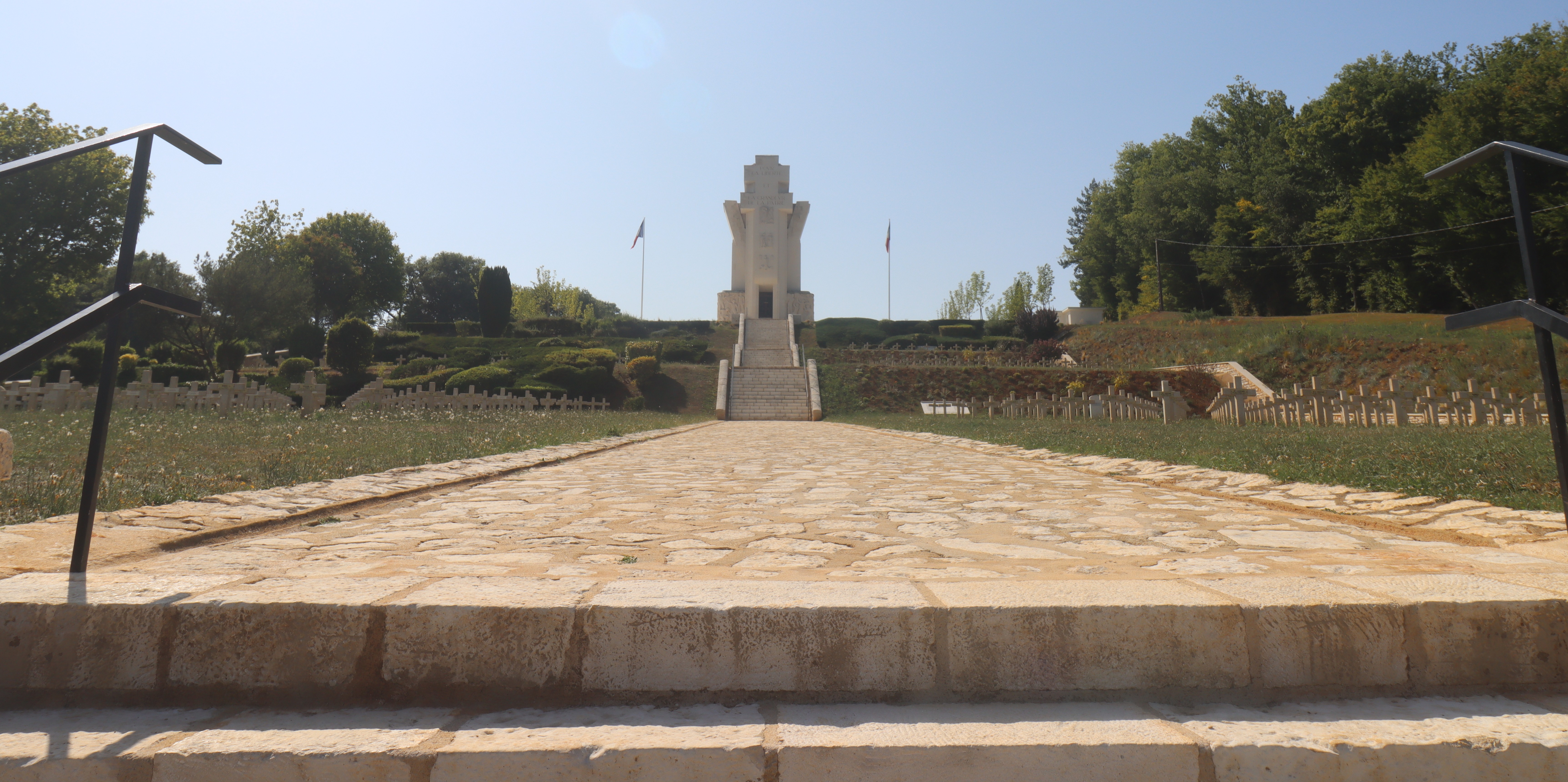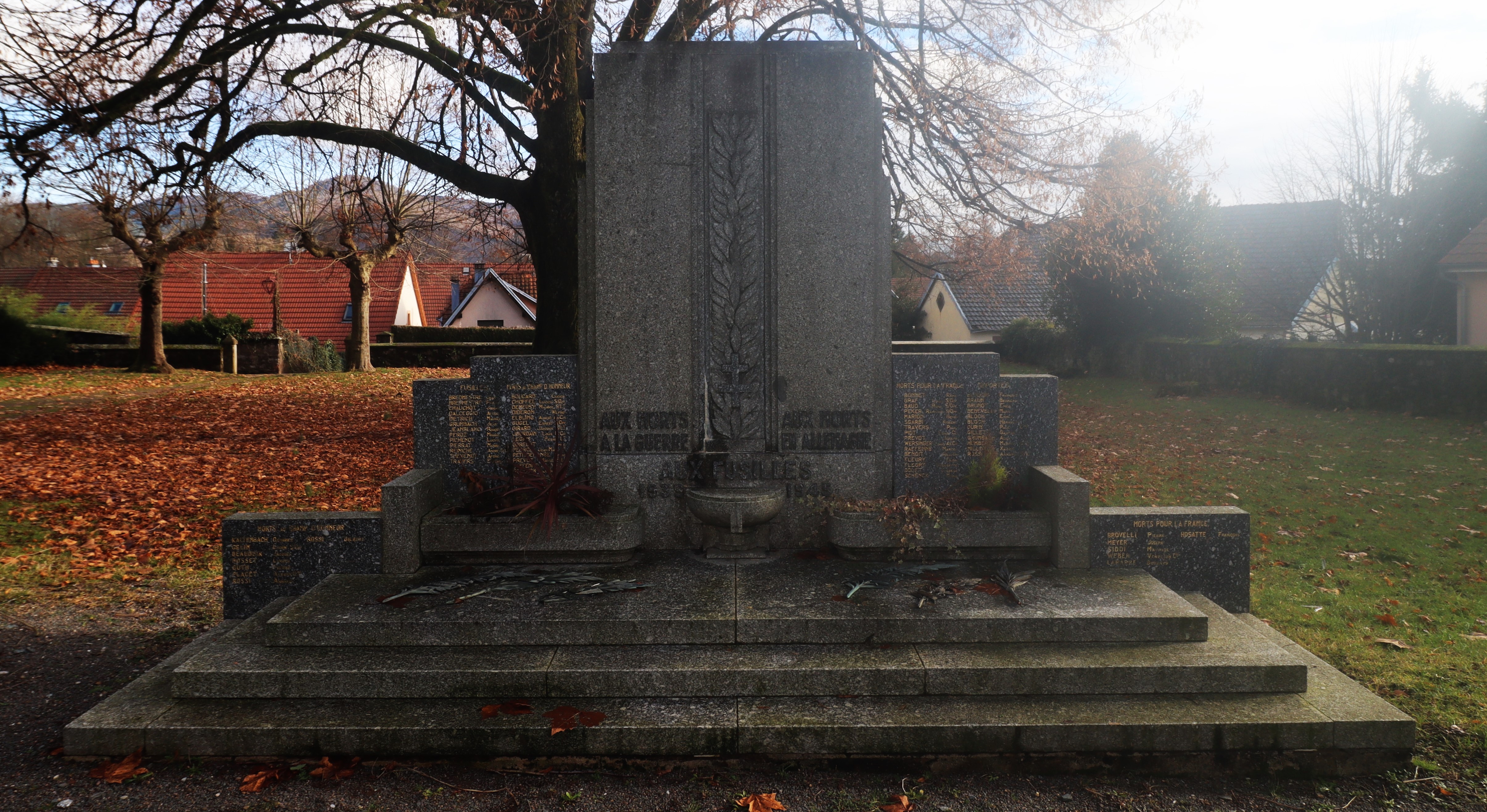 Auf dem "Le Square du Souvenir" bei der Kirche der 5,65 Km2 grossen Gemeinde mit 2914 Einwohner im Departement Territoire de Belfort (F) stehen gleich 3 Kriegerdenkmale.