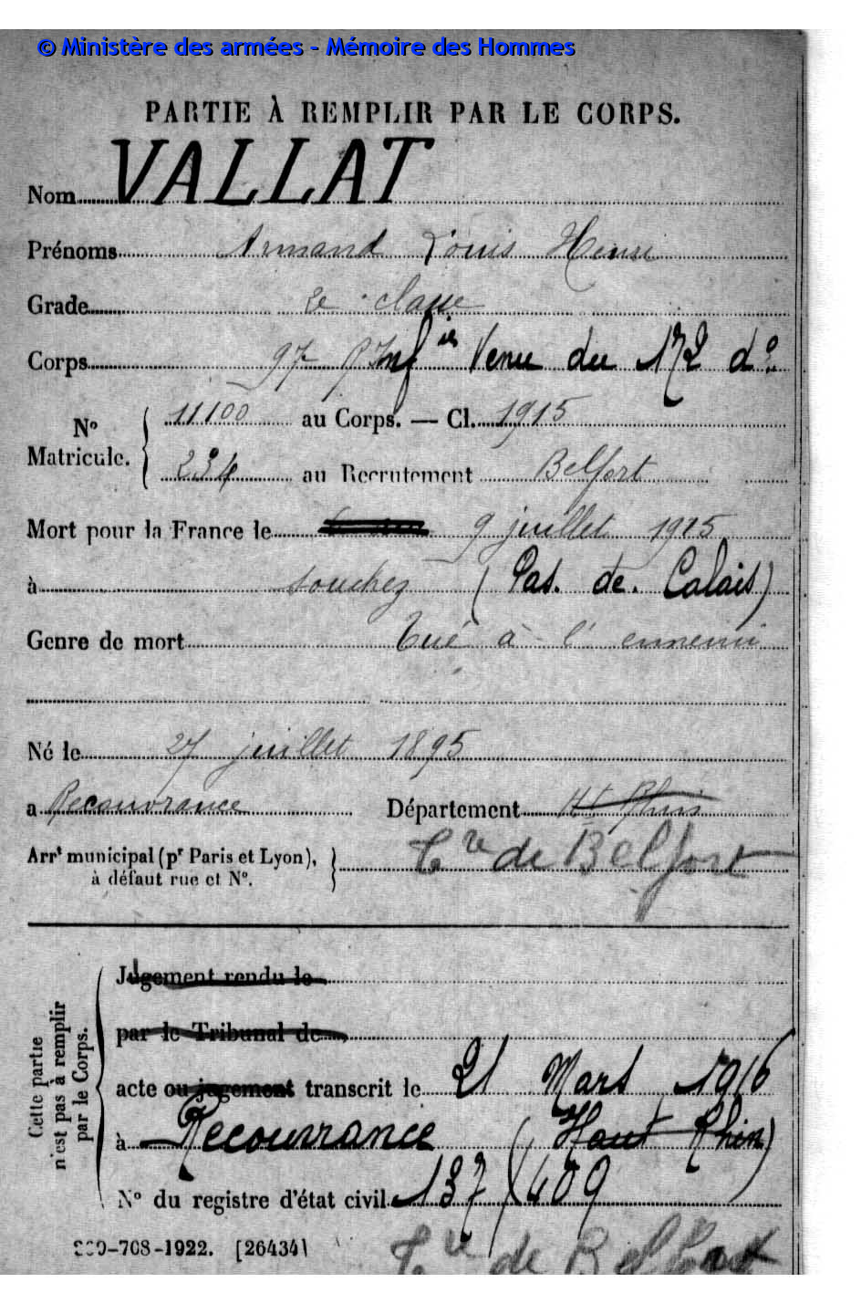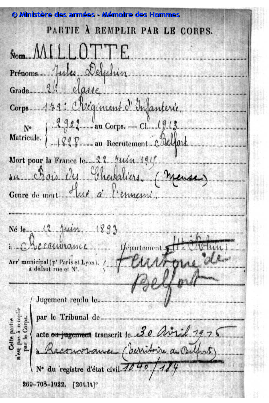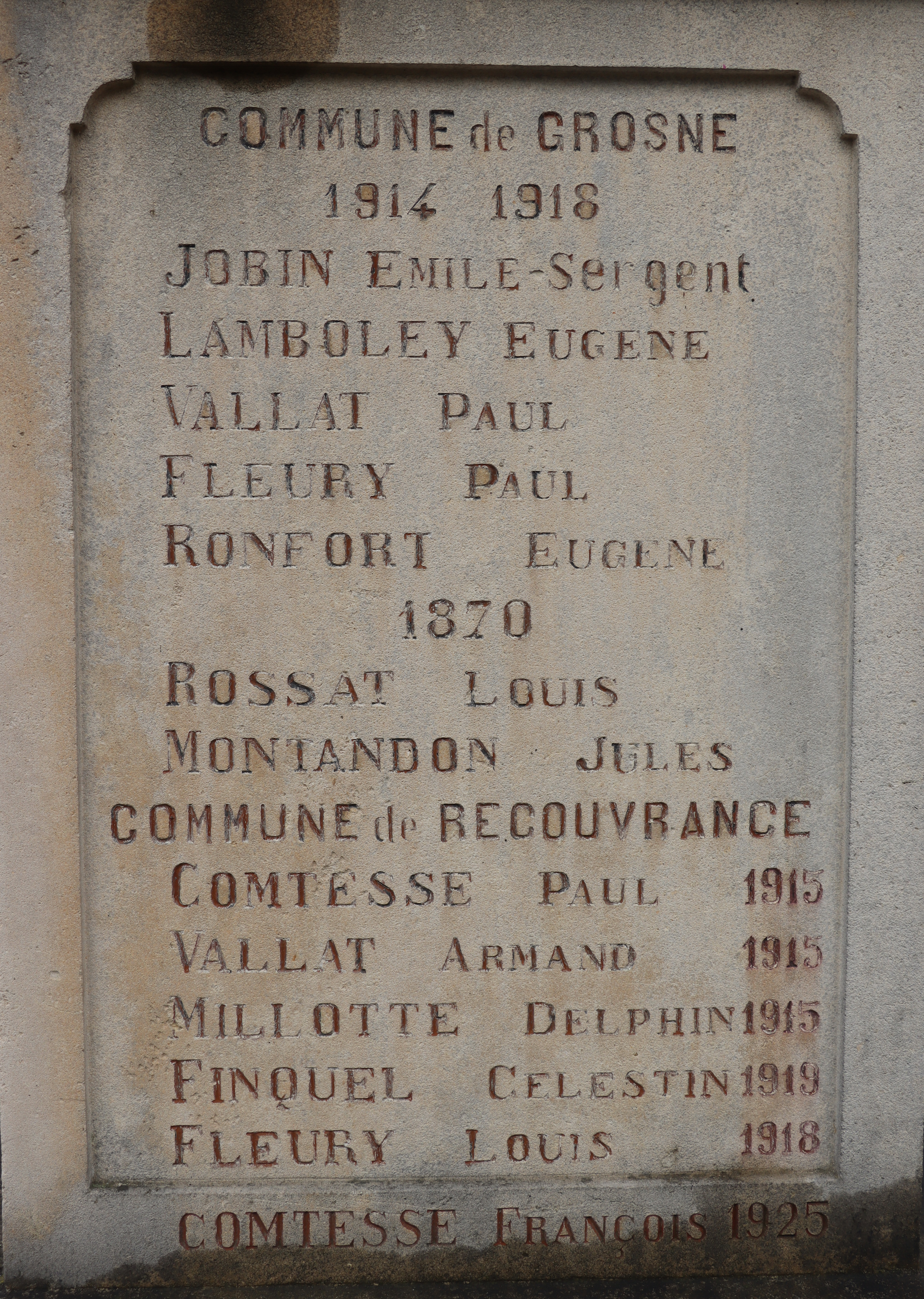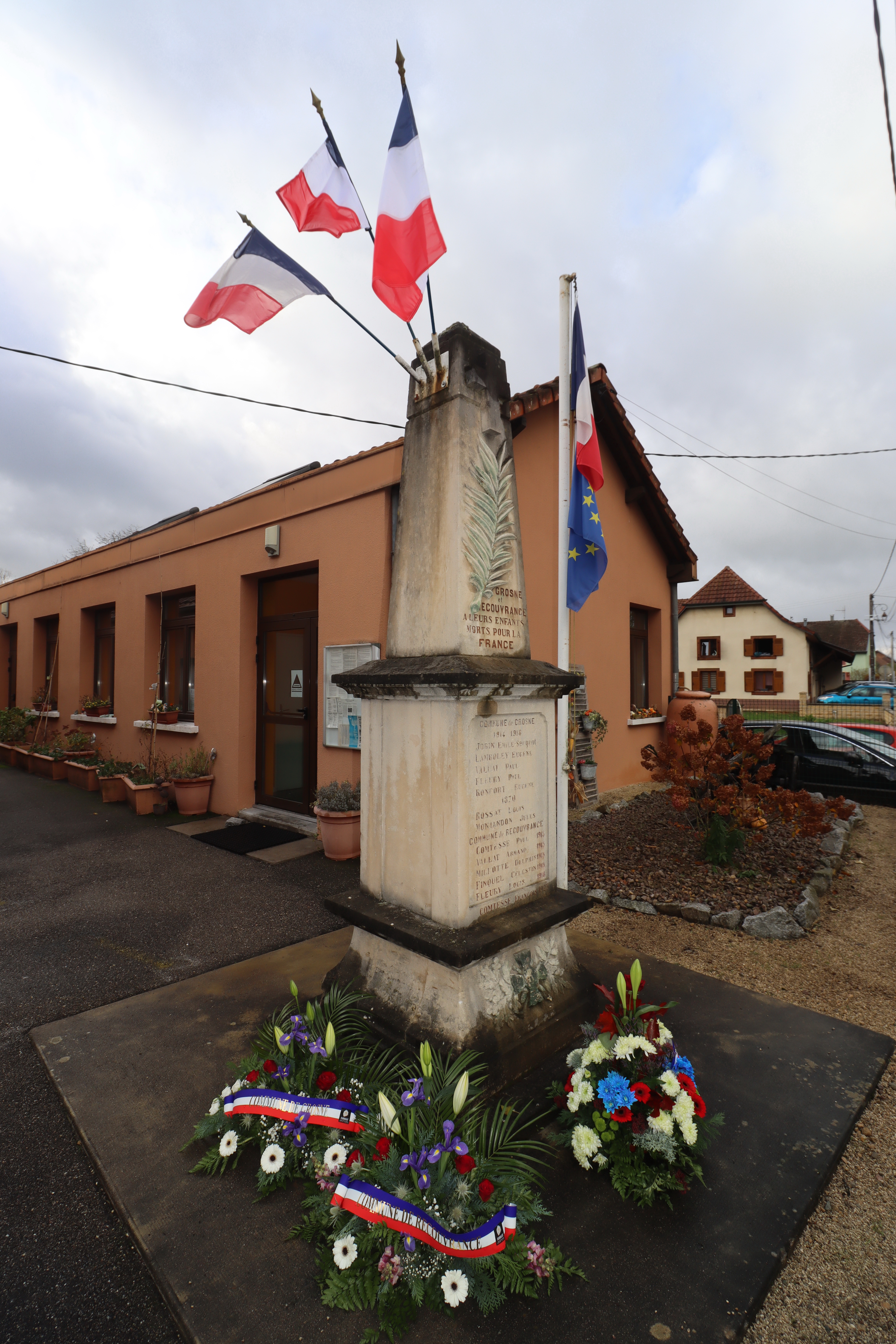 Auf dem Kriegerdenkmal der 3,65 Km2 kleinen Gemeinde mit 331 Einwohner im Departement Territoire de Belfort (F) sind 11 gefallene Soldaten aus dem 1. Weltkrieg und 2 vom Deutsch-Französischen Krieg niedergeschrieben.