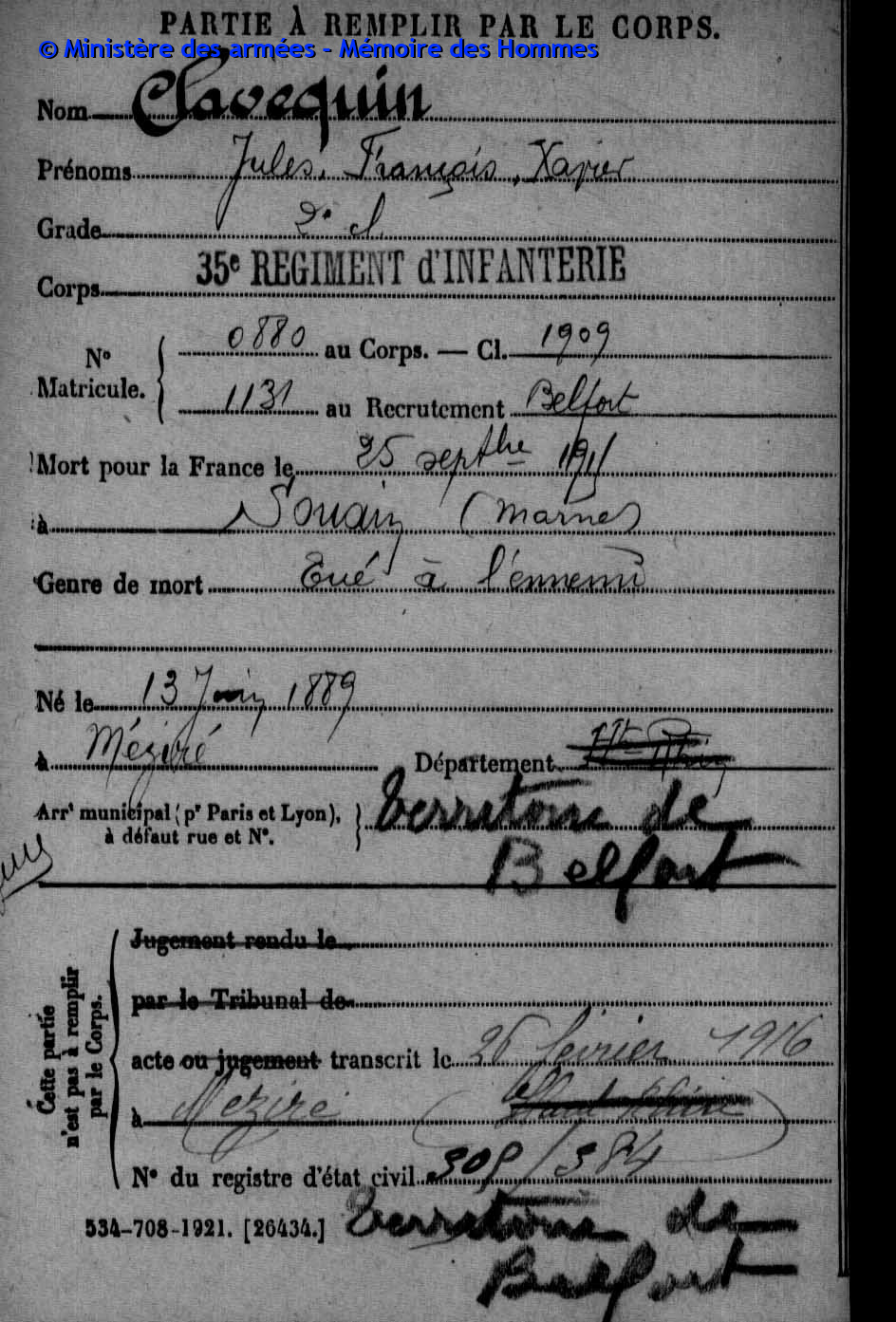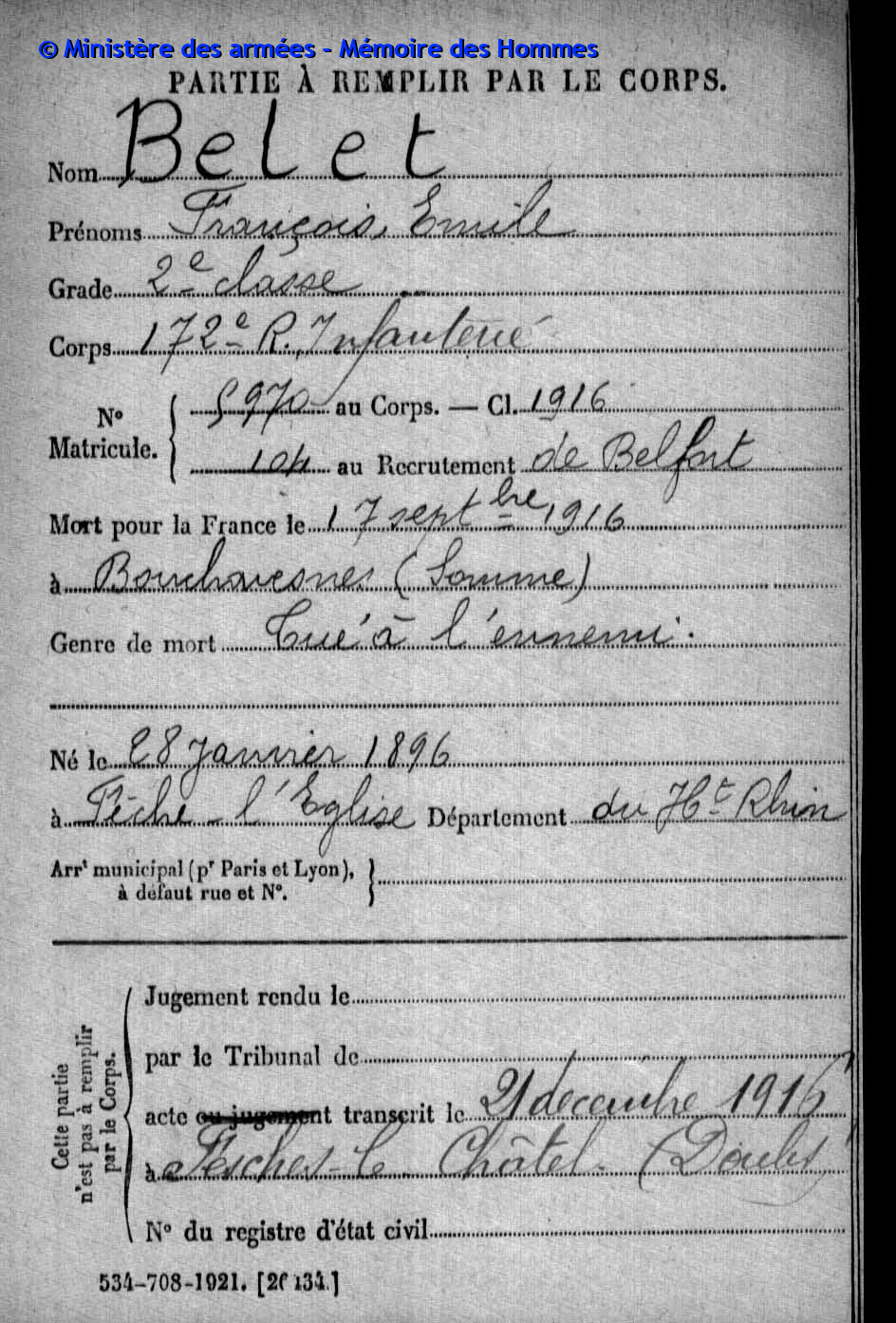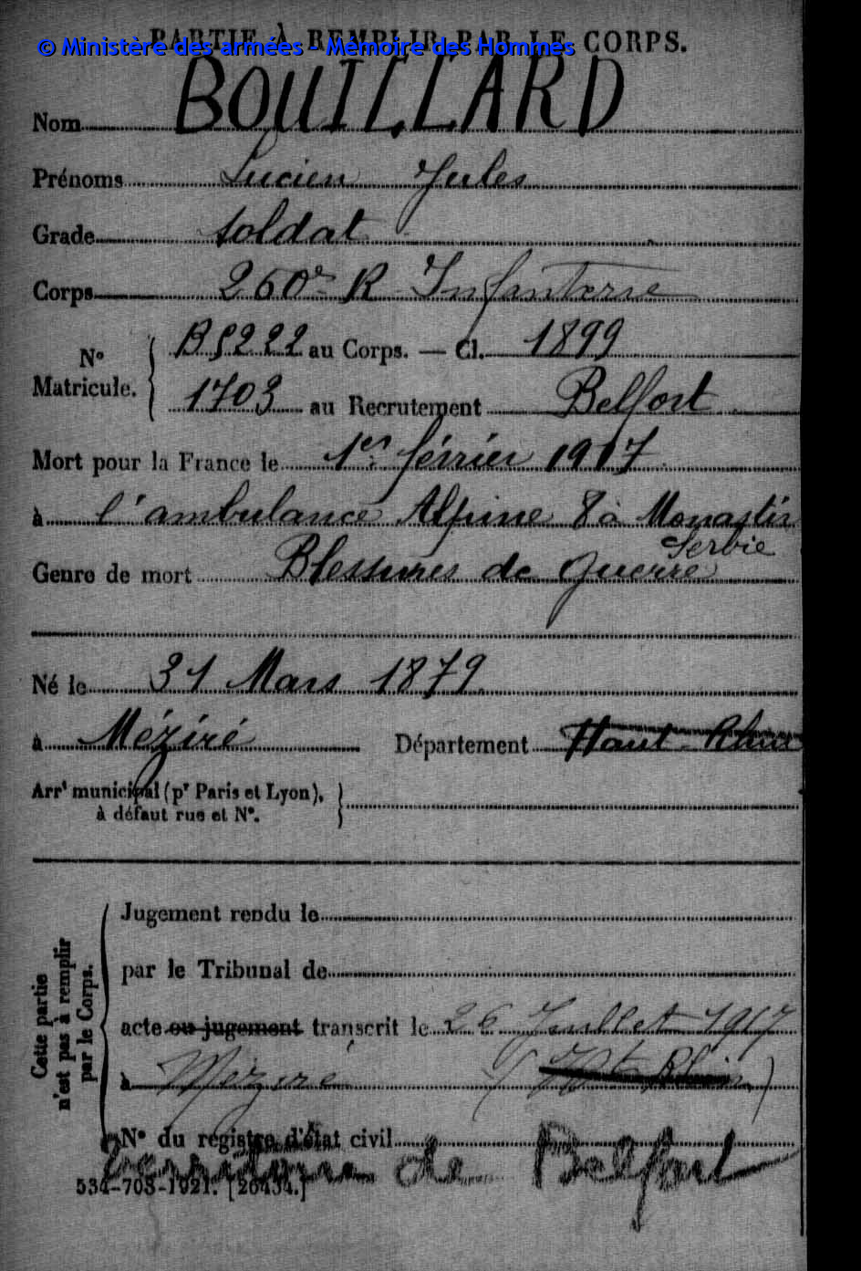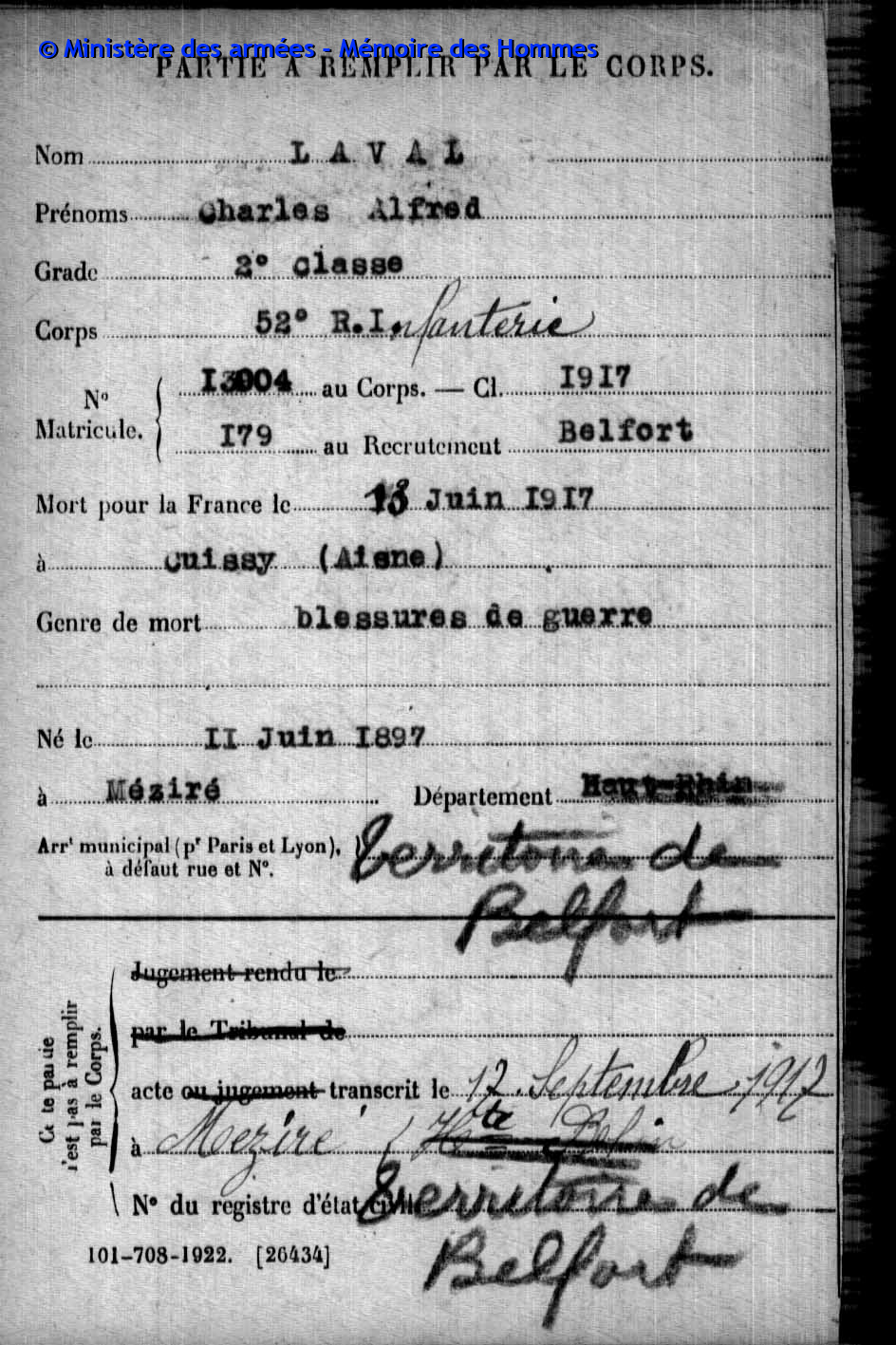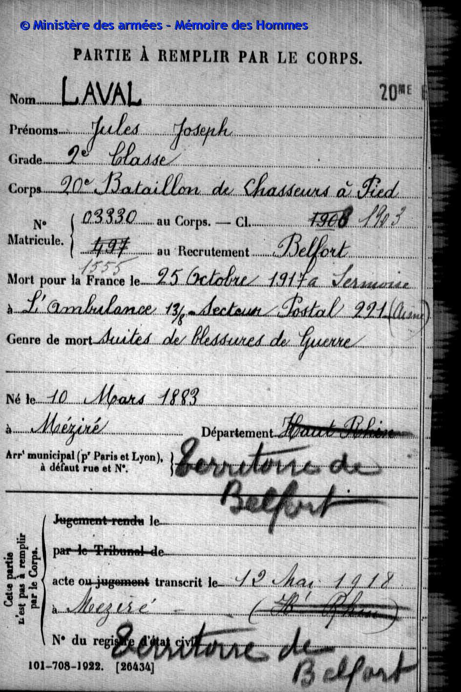 | Soldat LAVAL Jules Joseph 19.03.1881 - 04.11.1918 172ème Régiment d'Infanterie Verstarb durch Krankheit im Hôpital complémentaire in Montbéliard (F) |
