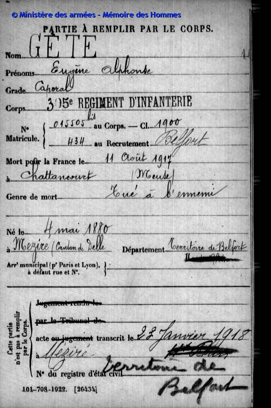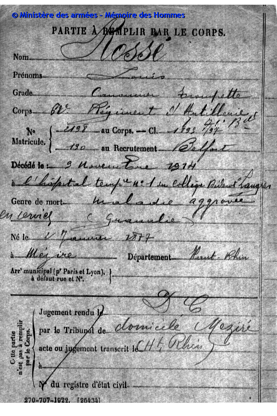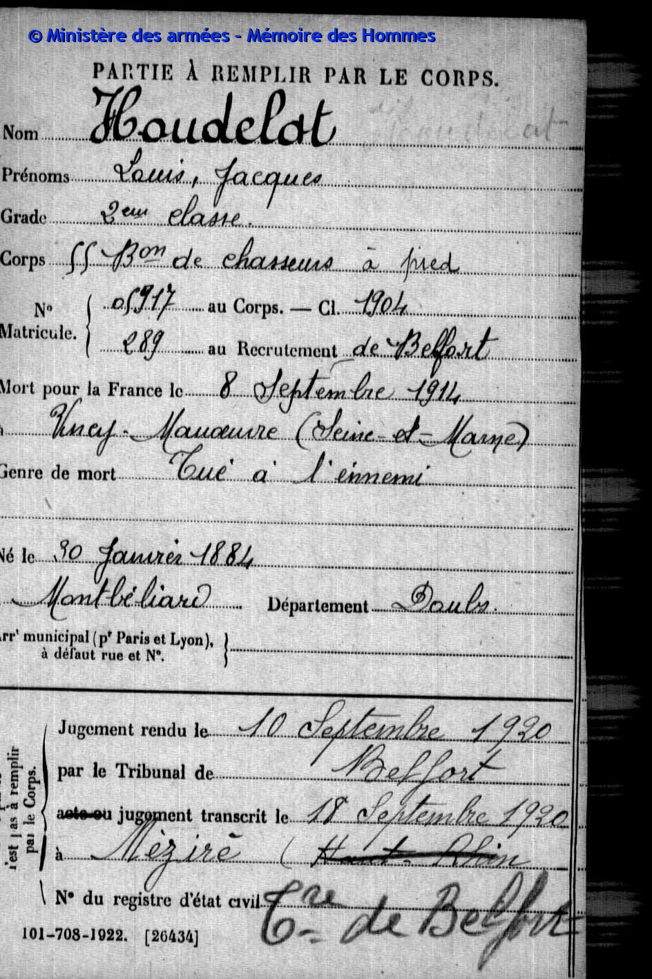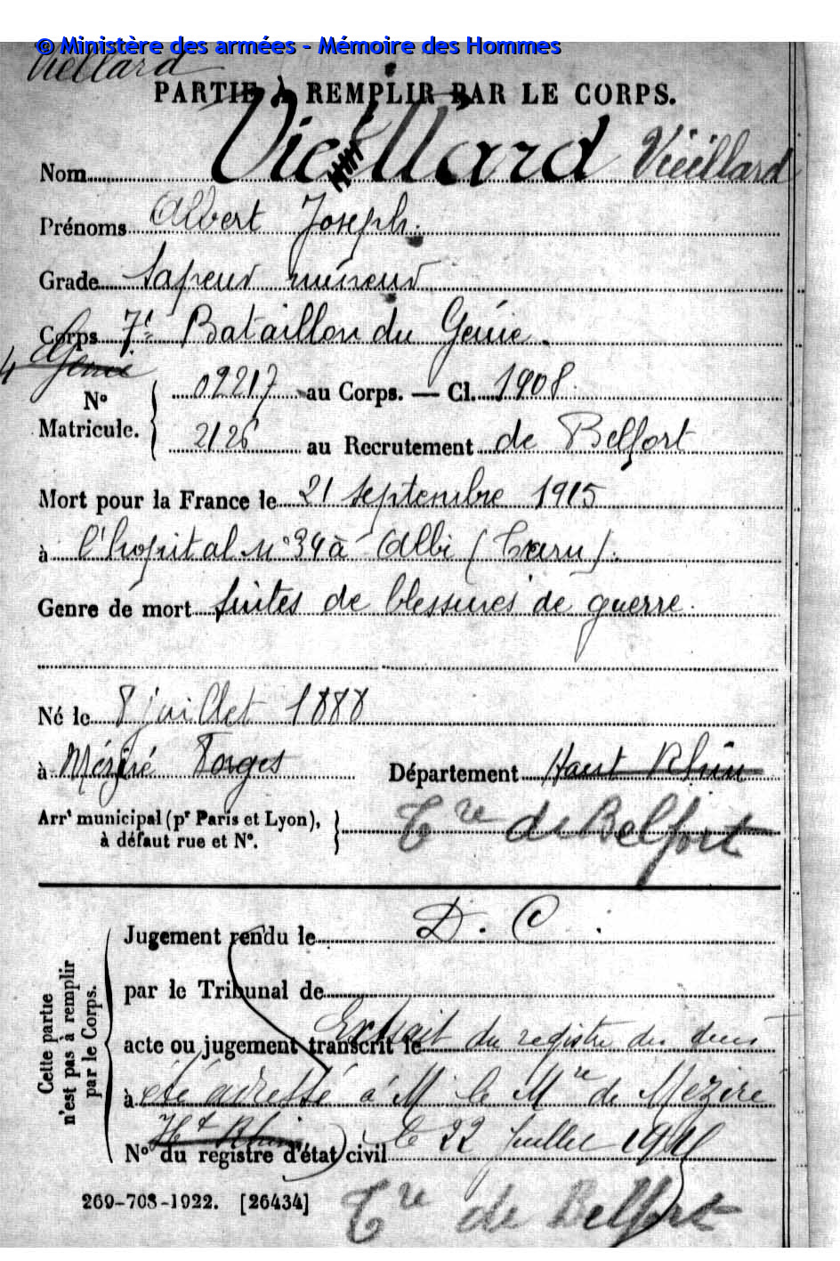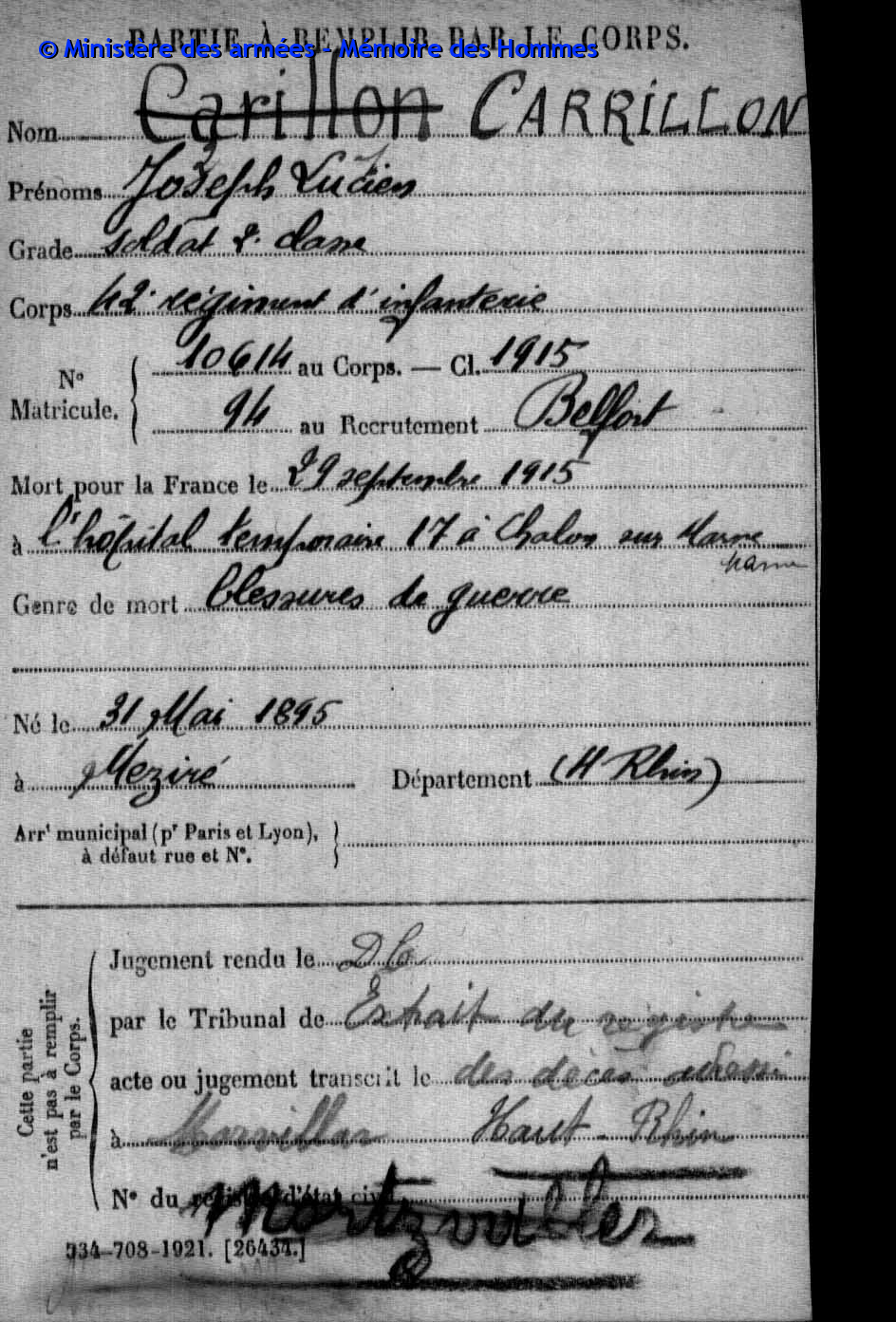 | Soldat LAVAL Jules Joseph 19.03.1881 - 04.11.1918 172ème Régiment d'Infanterie Verstarb durch Krankheit im Hôpital complémentaire in Montbéliard (F) |