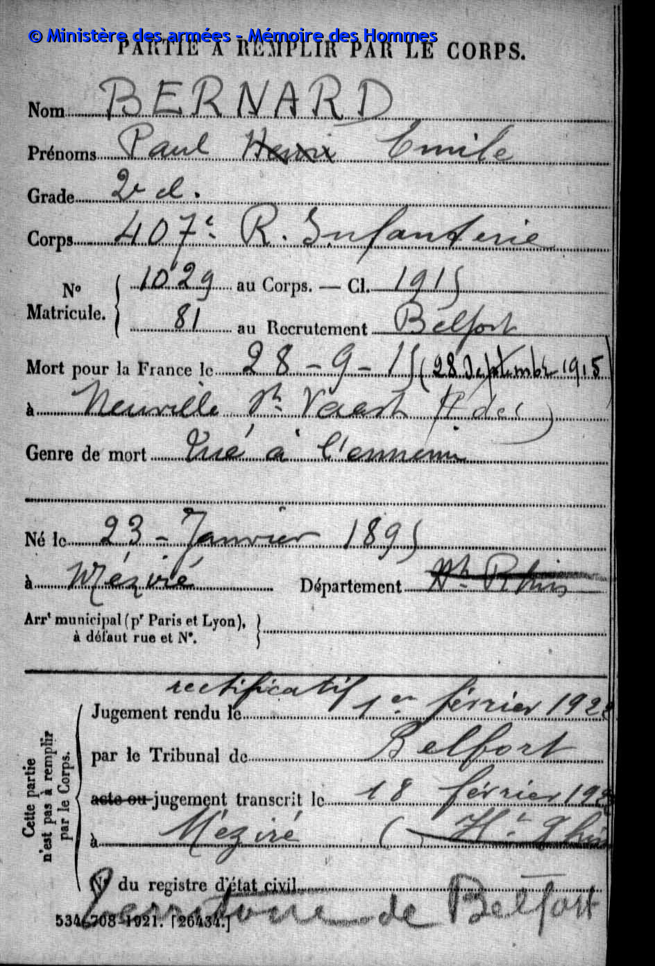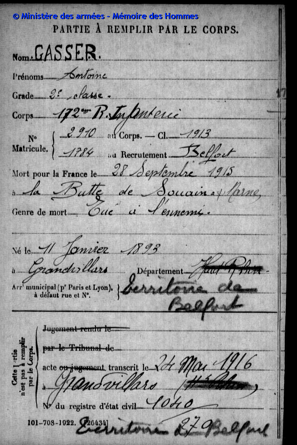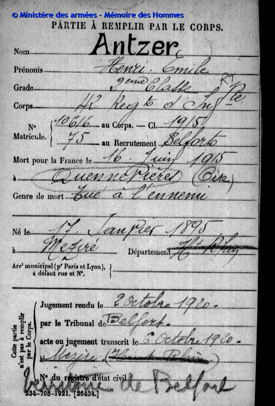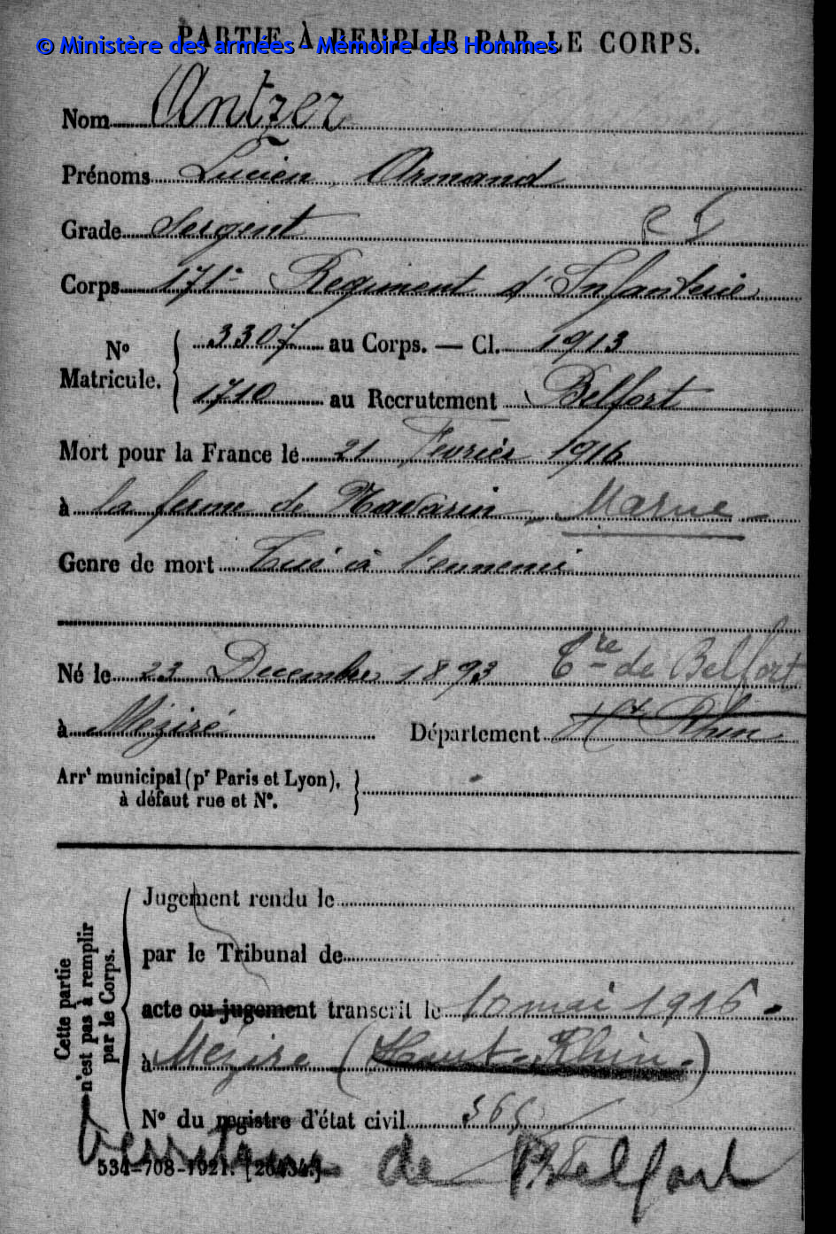 | Sergent ANTZER Lucien Armand 23.12.1893 - 21.02.1916 171ème Régiment d'Infanterie Gefallen in Perthes-lès-Hurlus - Marne (F) |