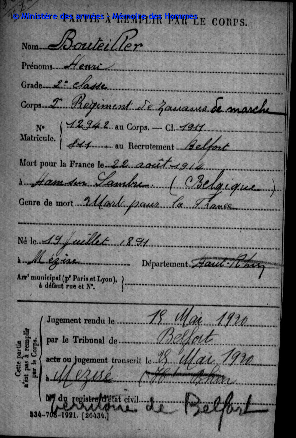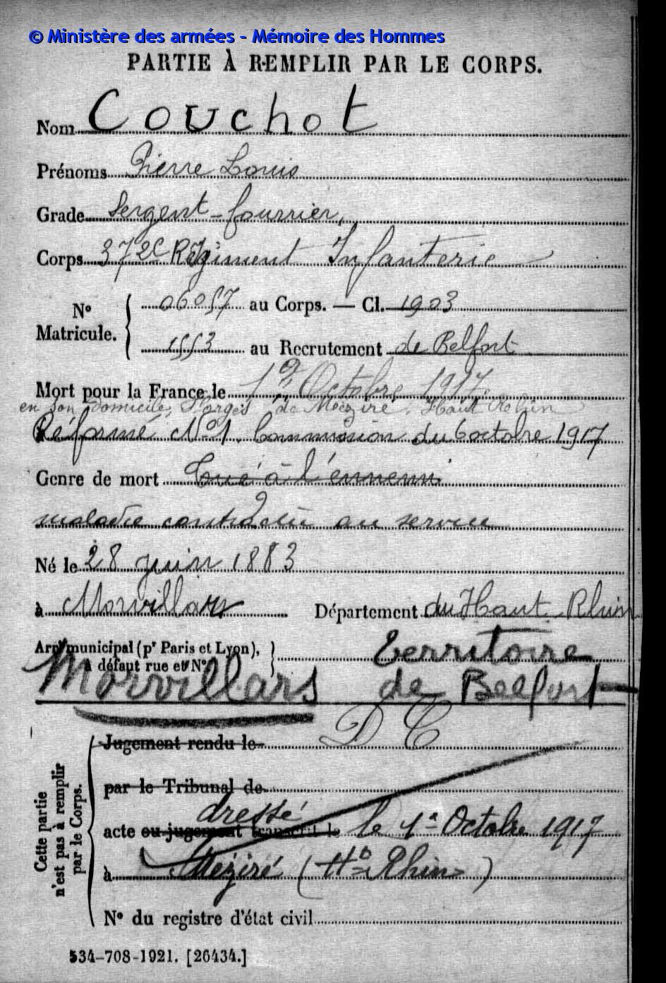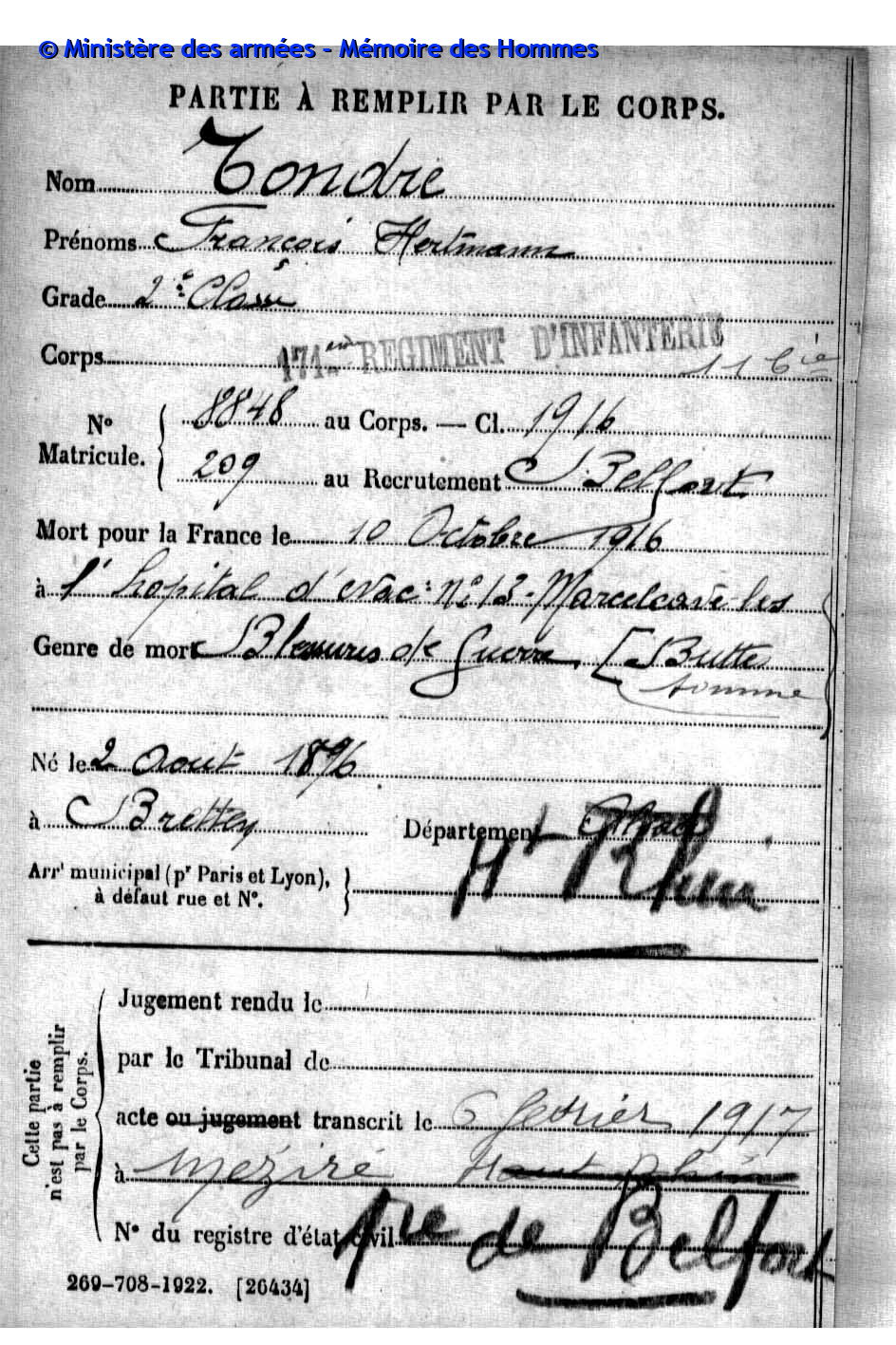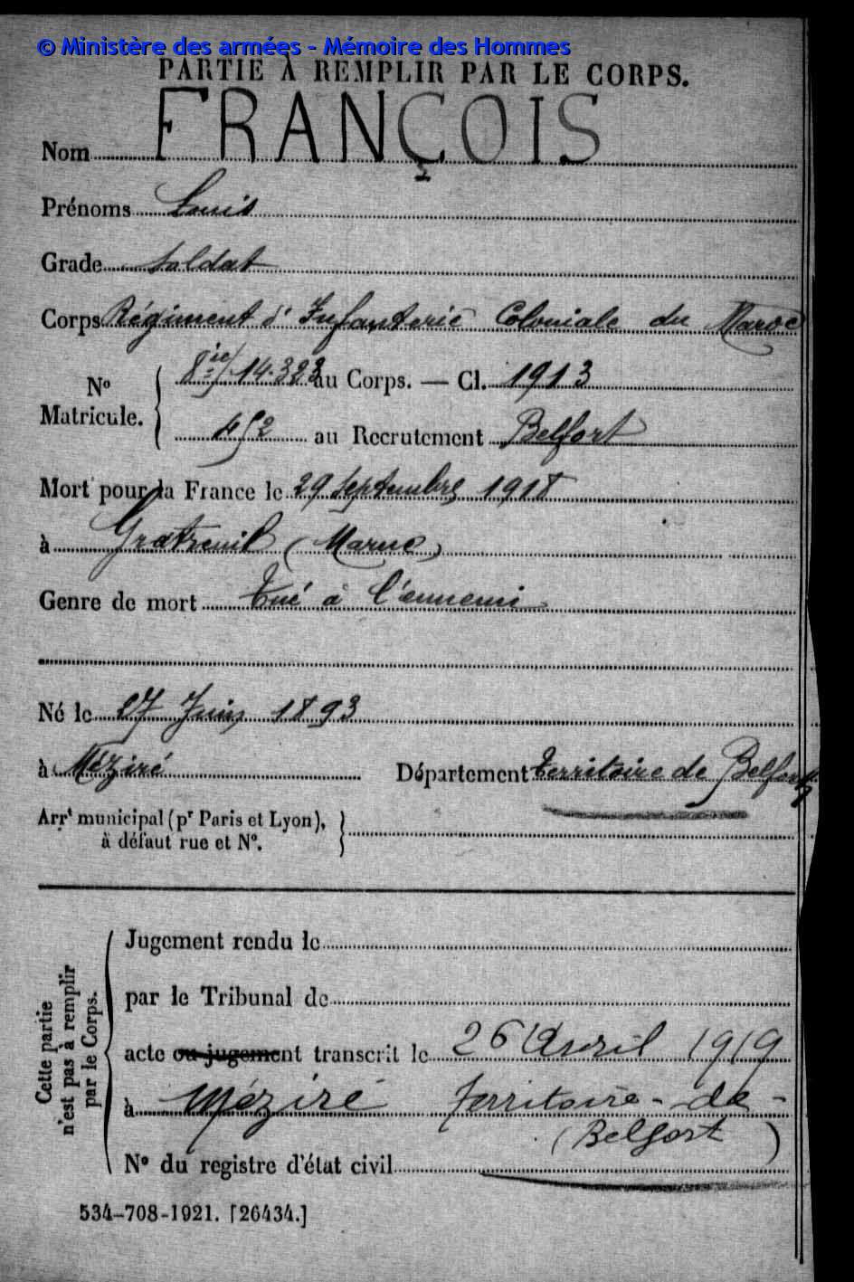 | Marsouin FRANCOIS Louis 27.06.1893 - 29.09.1918 Régiment d'Infanterie Coloniale du Maroc Gefallen in Gratreuil - Marne (F) |
