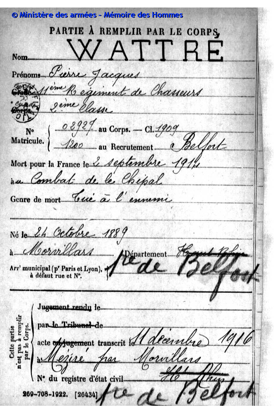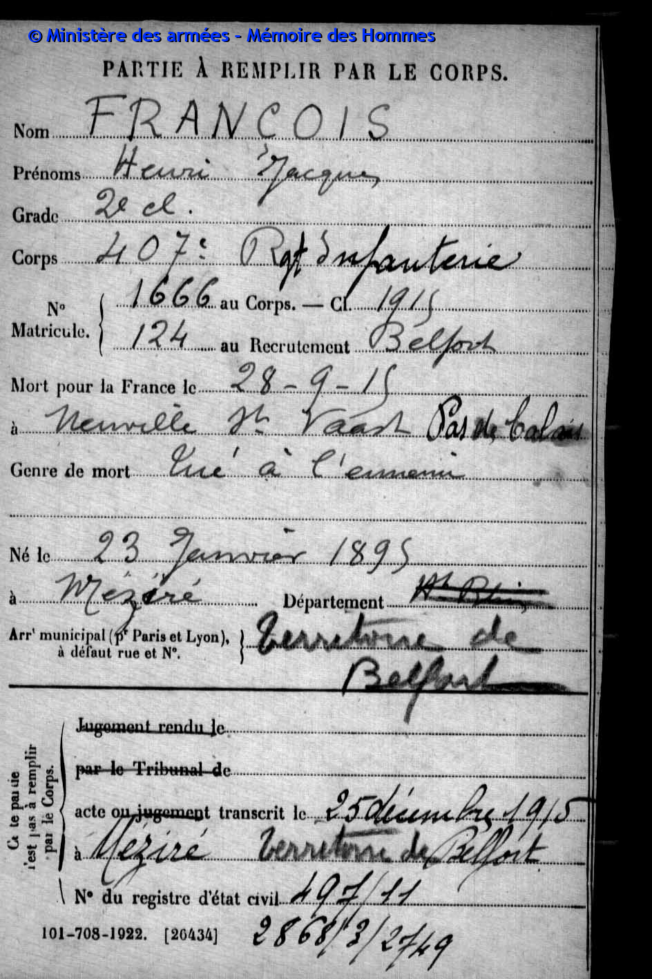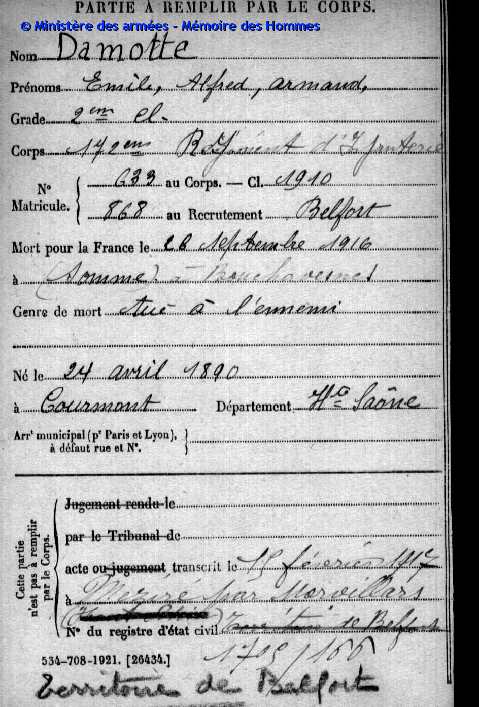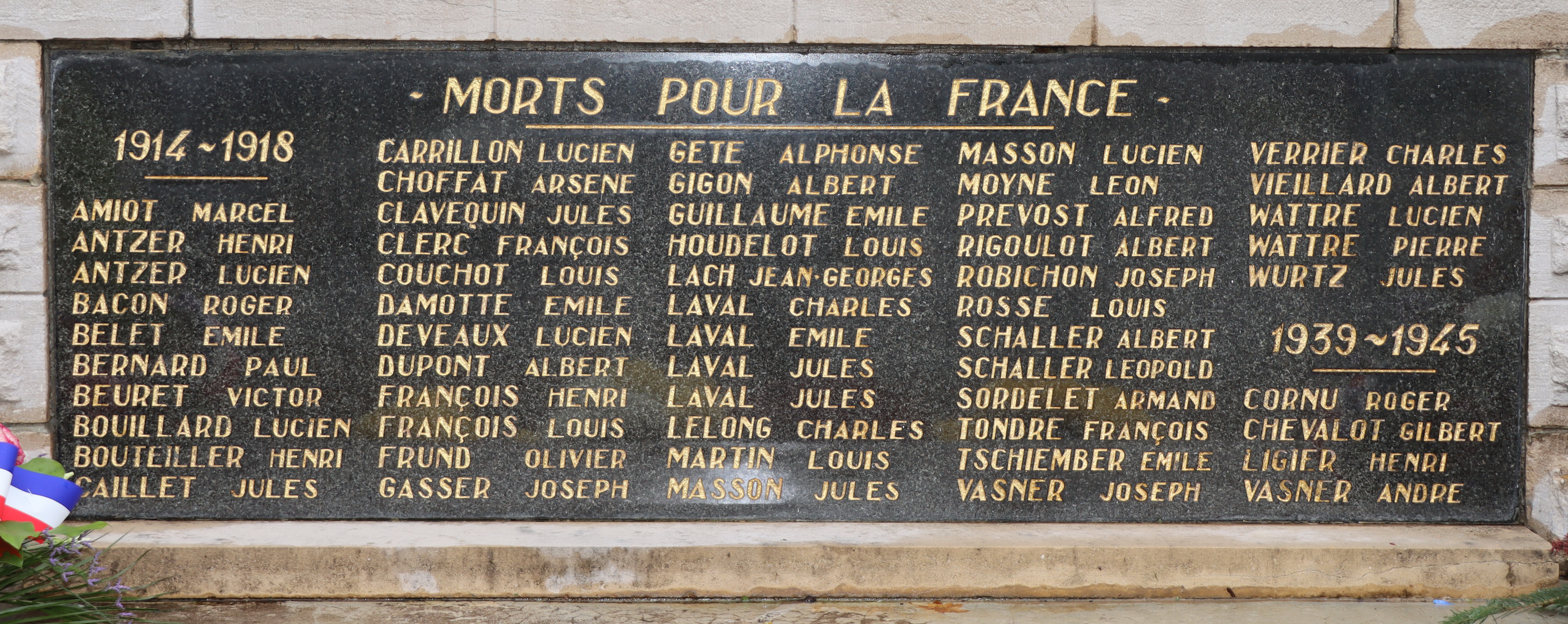 Auf dem Kriegerdenkmal der 3,91 Km2 kleinen Gemeinde mit 1294 Einwohner im Departement Territoire de Belfort sind 55 Kriegsopfer erwähnt, davon sind 41 mit Fabian Coulot verwandt.