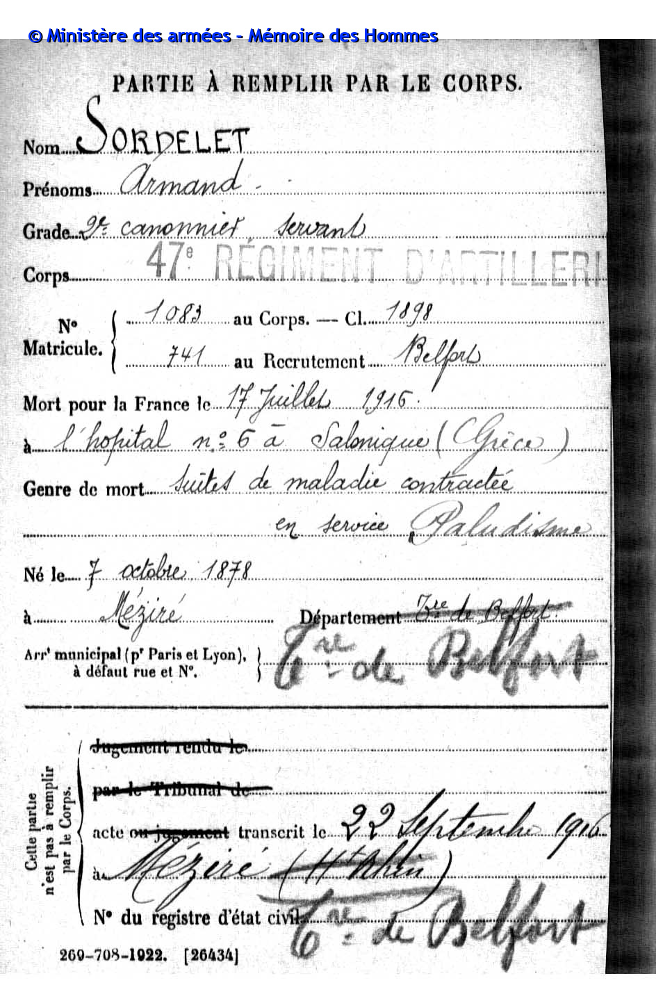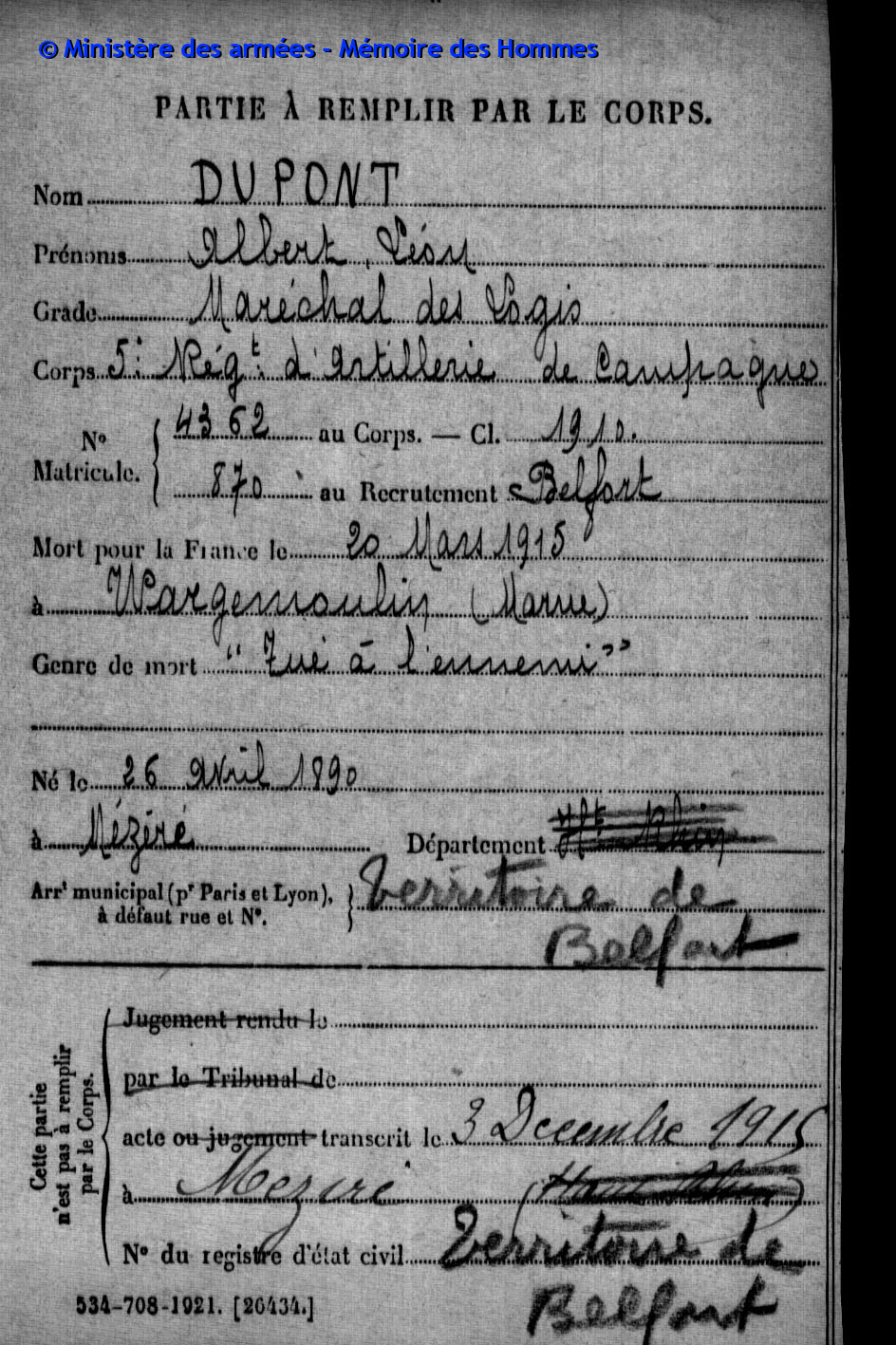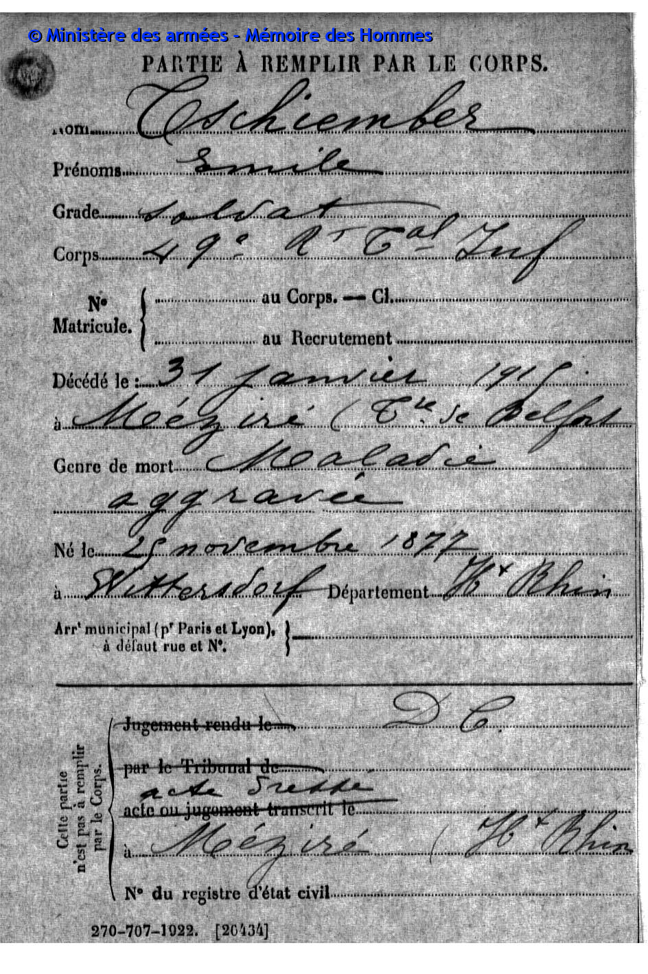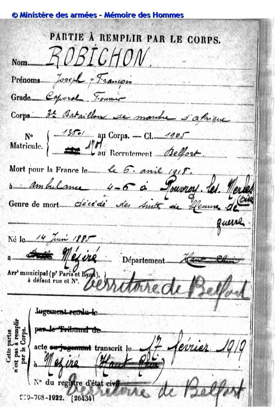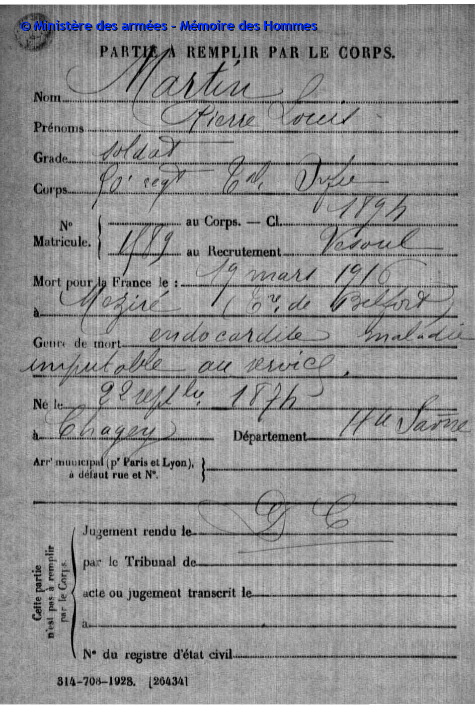 | Soldat MARTIN Pierre Louis 22.09.1874 - 19.03.1916 50ème Régiment d'Infanterie Territoriale Verstarb durch Krankheit zu Hause in Méziré (F) |
