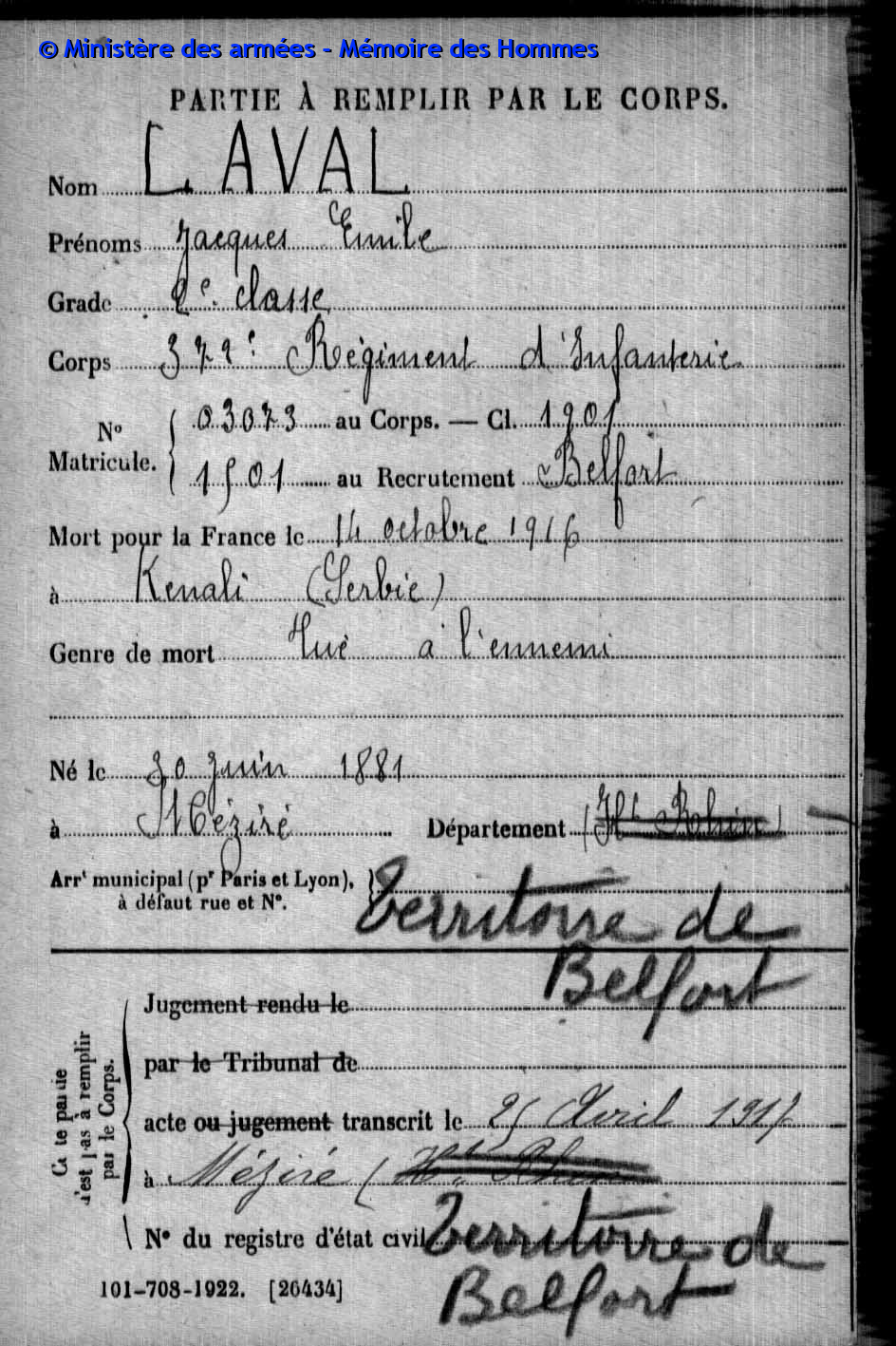 2ème classe LAVAL Jacques Emile 30.06.1881 - 14.10.1916 372ème Régiment d'Infanterie 17ème Compagnie Gefallen in Kenali (Serbien) |