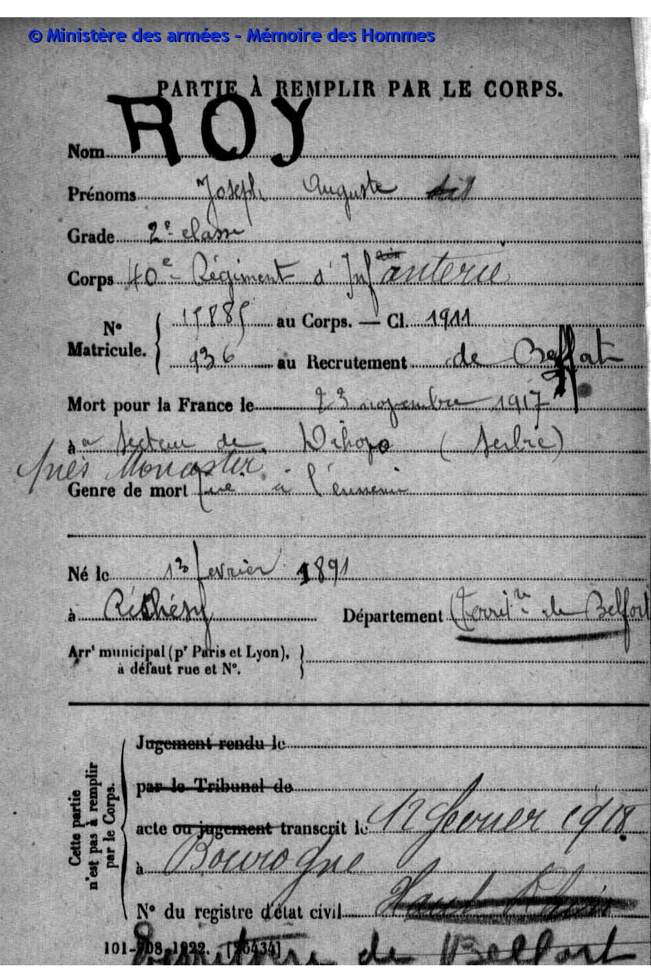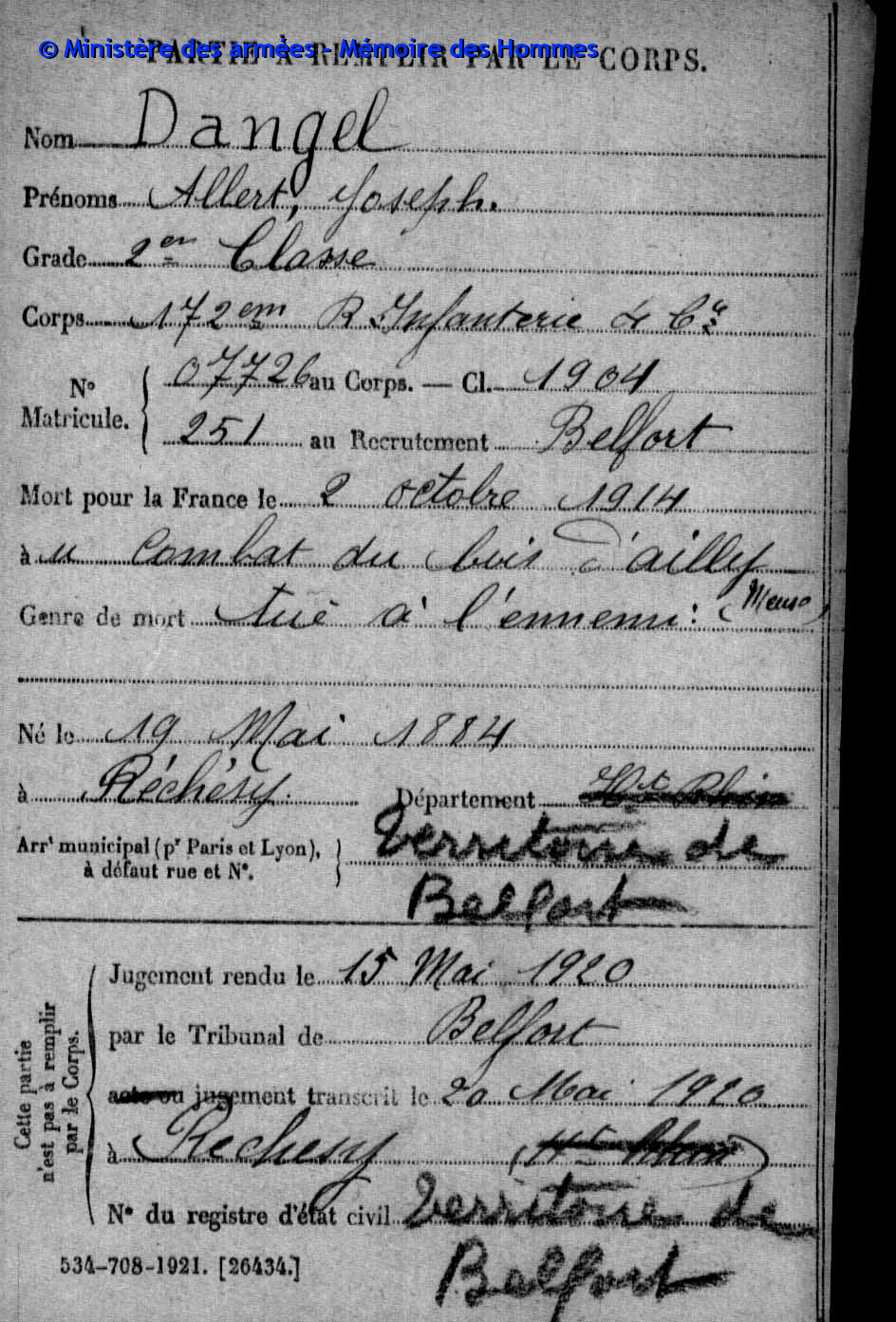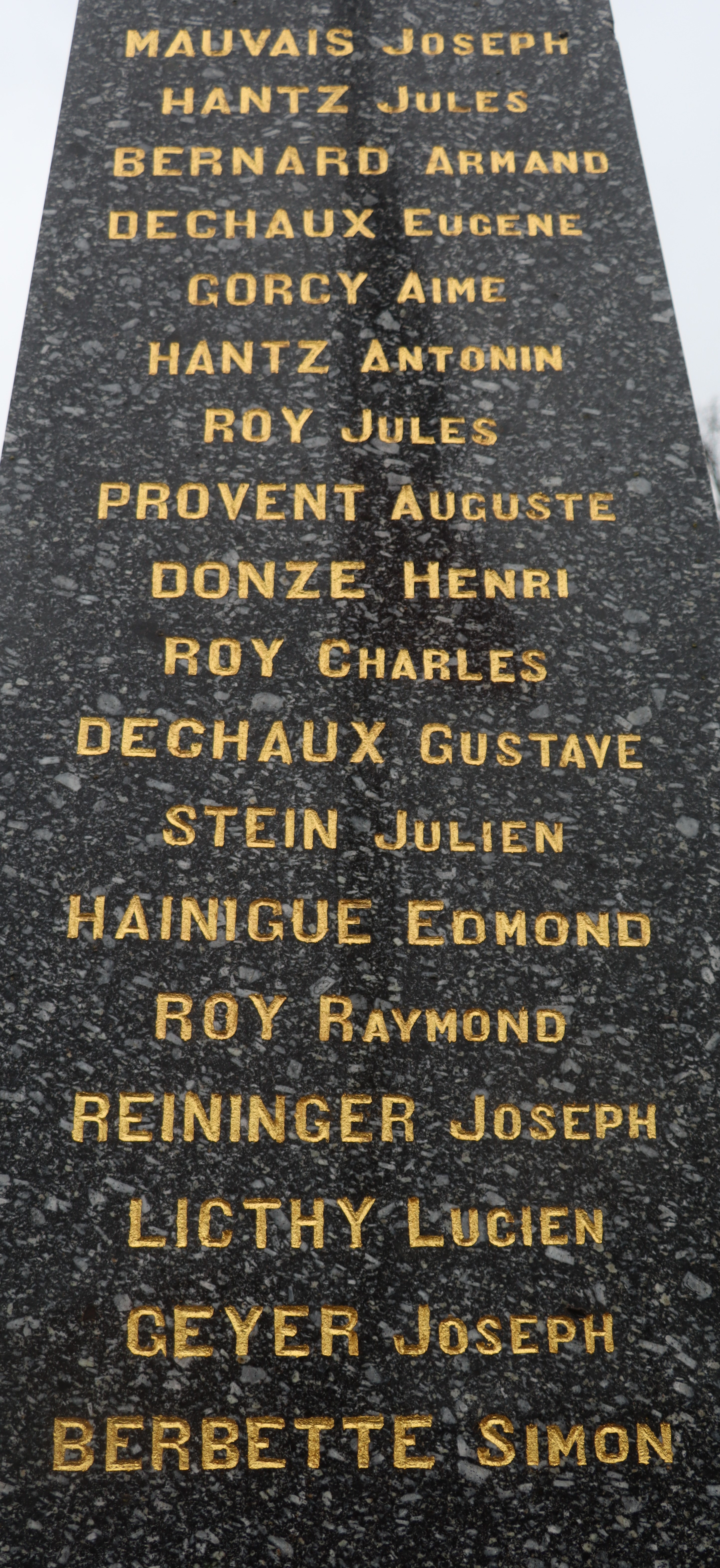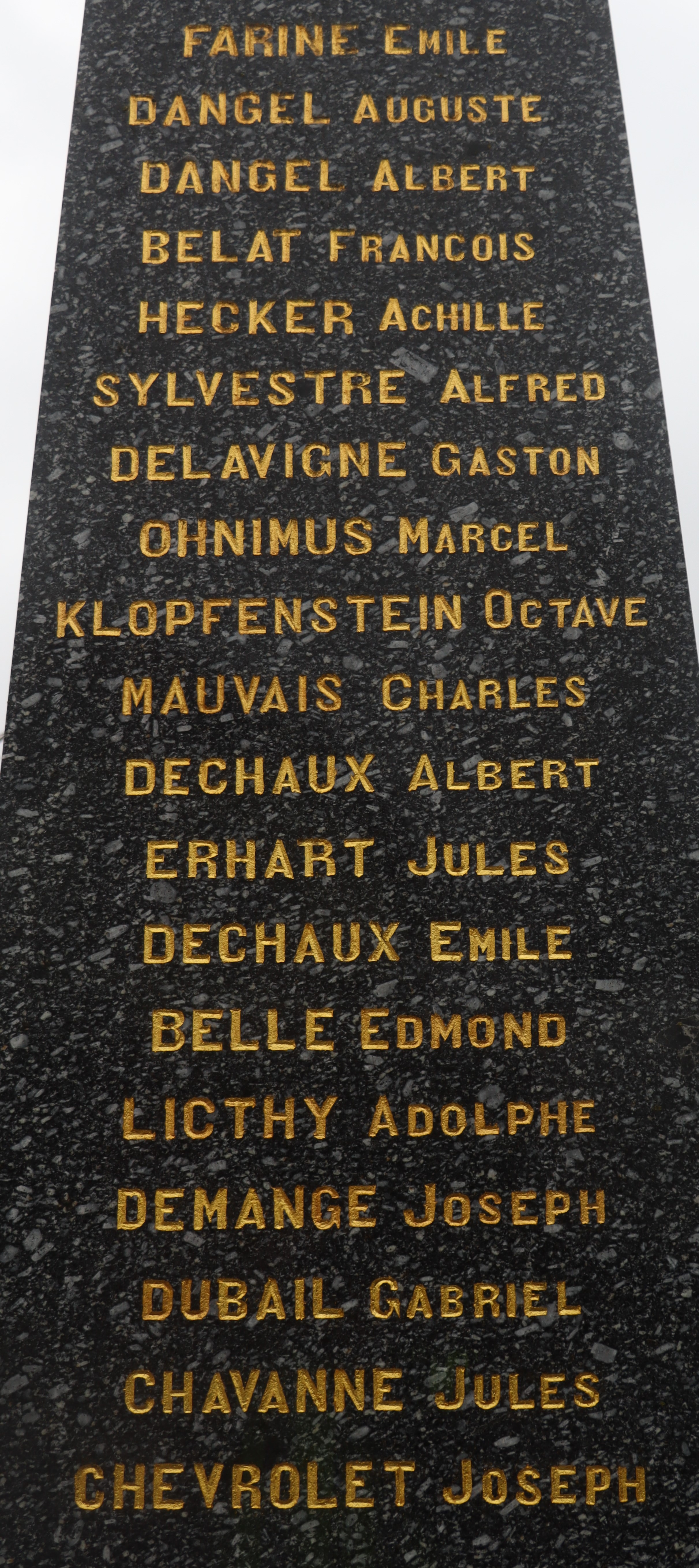 Auf dem Kriegederdenkmal der 12,61 km2 grossen Gemeinde mit 767 Einwohner im Departement Territoire de Belfort (F) sind 43 Kriegsopfer verzeichnet, davon sind 30 mit Fabian Coulot verwandt.