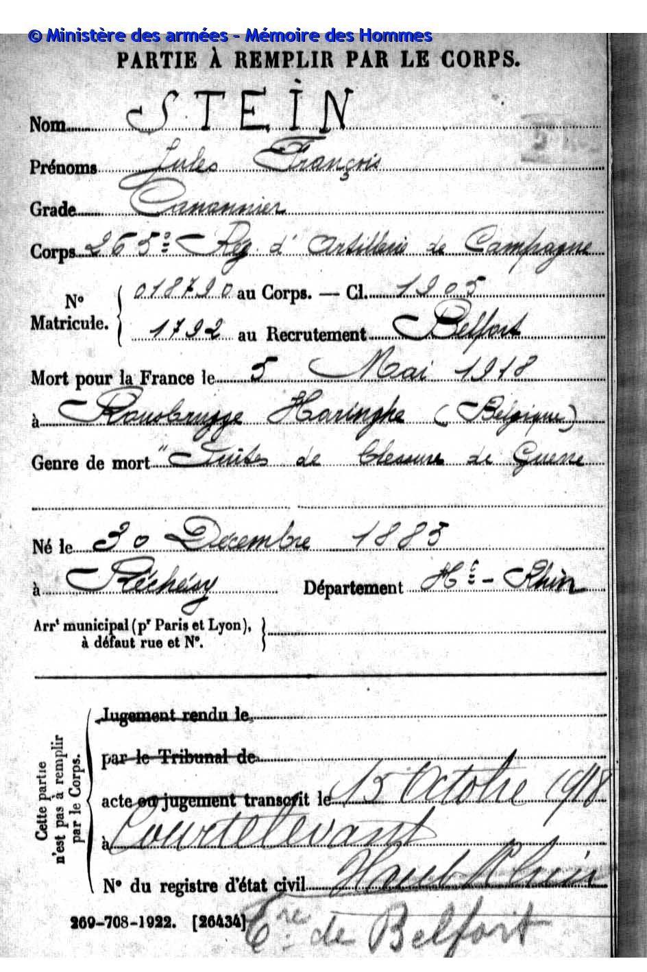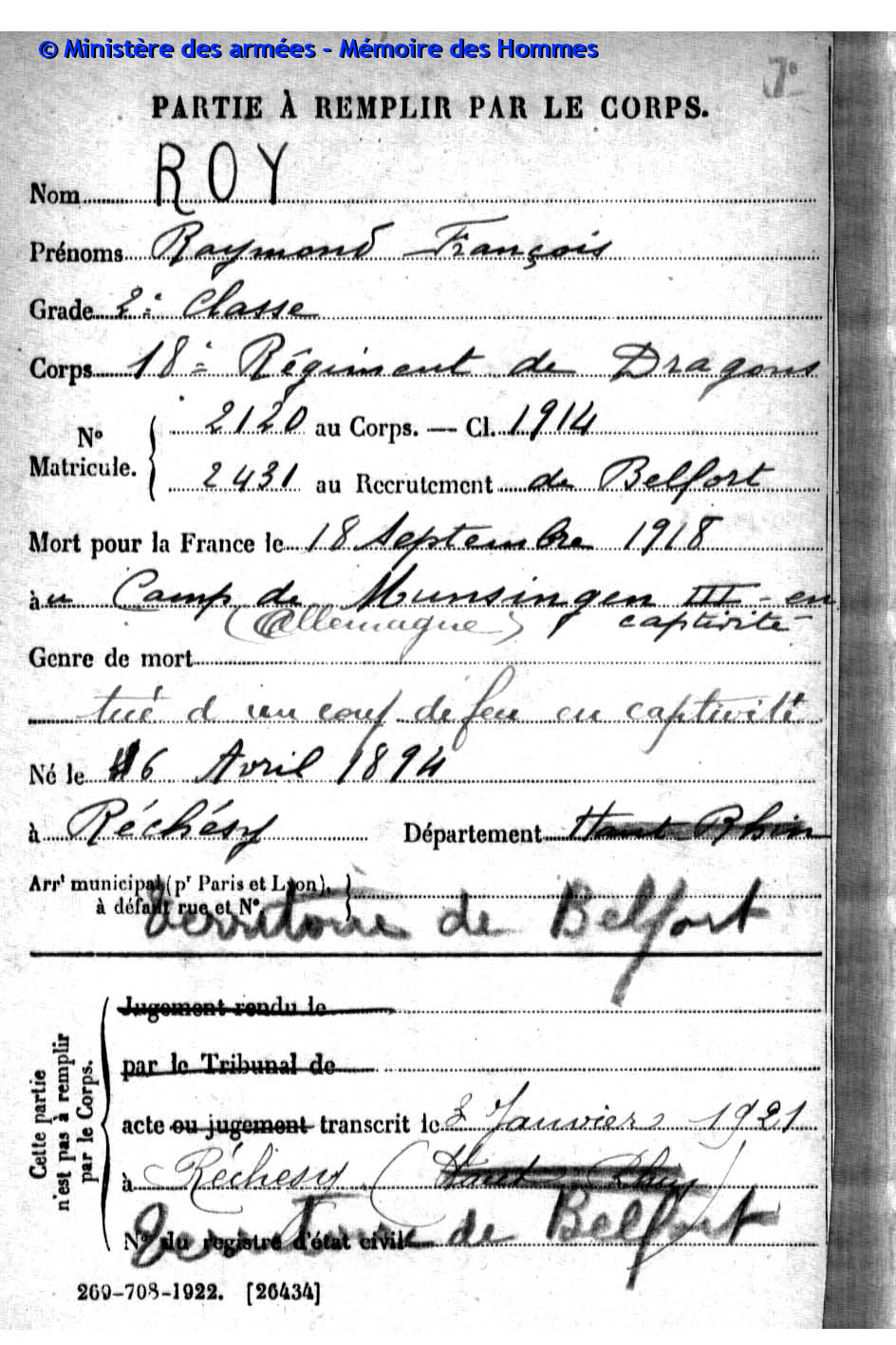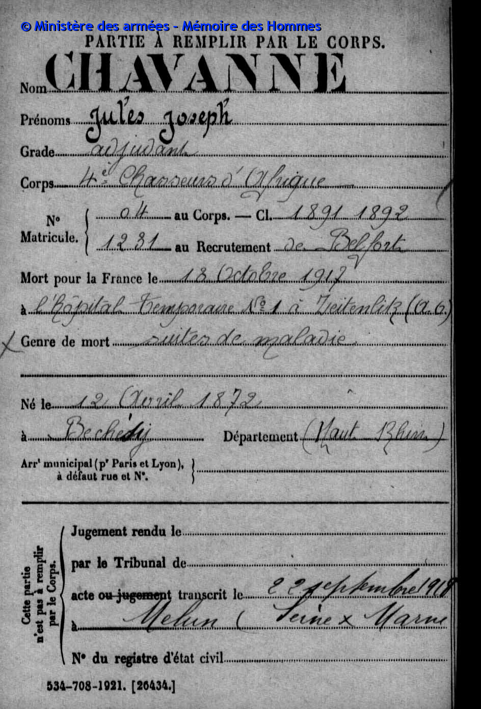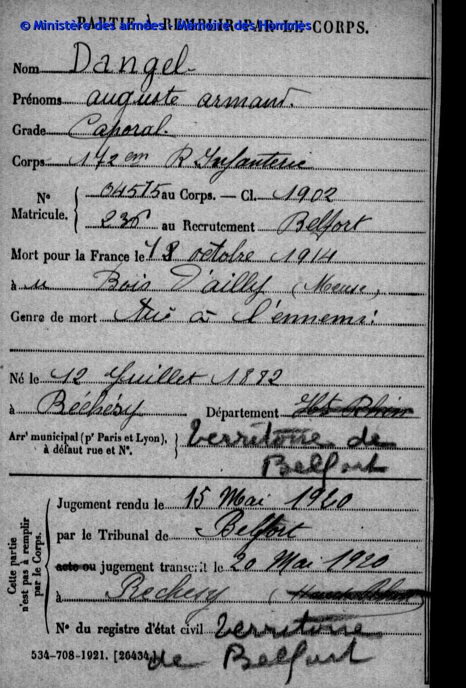 Auf dem Kriegederdenkmal der 12,61 km2 grossen Gemeinde mit 767 Einwohner im Departement Territoire de Belfort (F) sind 43 Kriegsopfer verzeichnet, davon sind 30 mit Fabian Coulot verwandt.