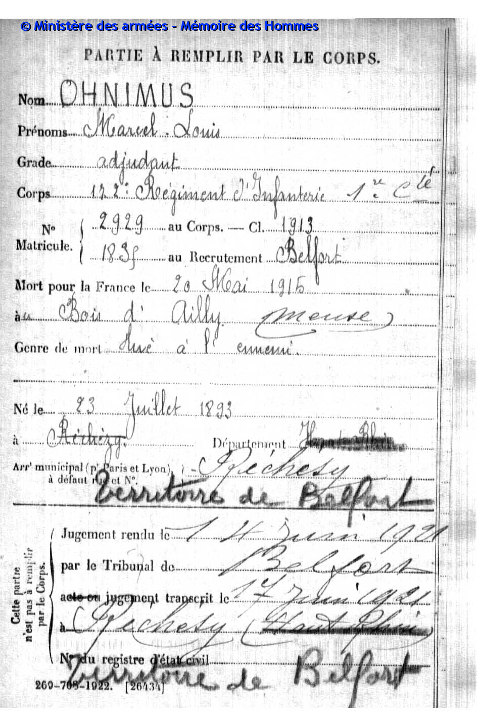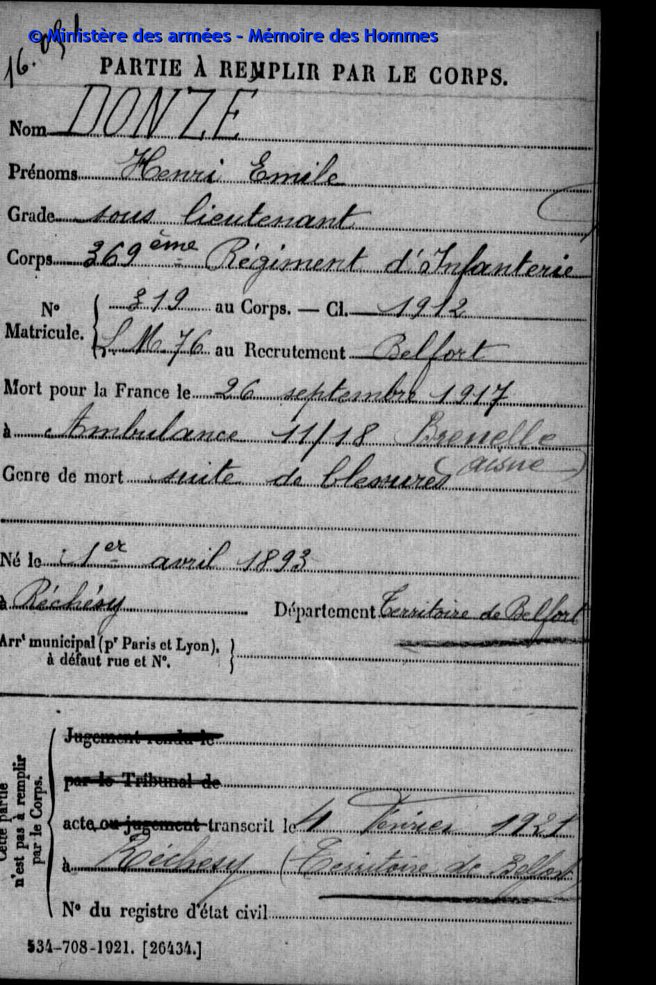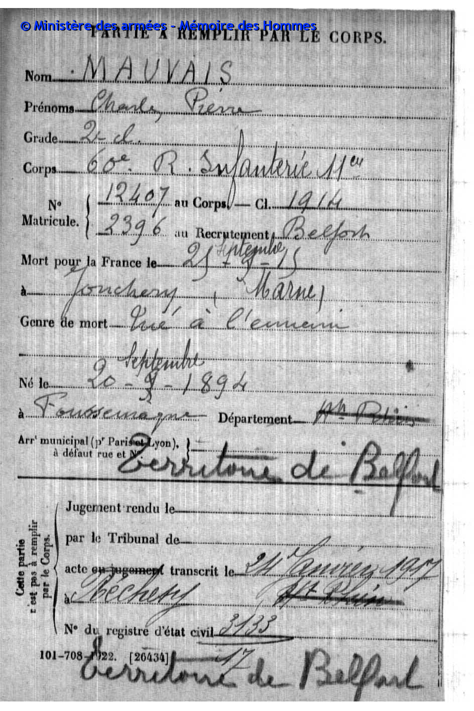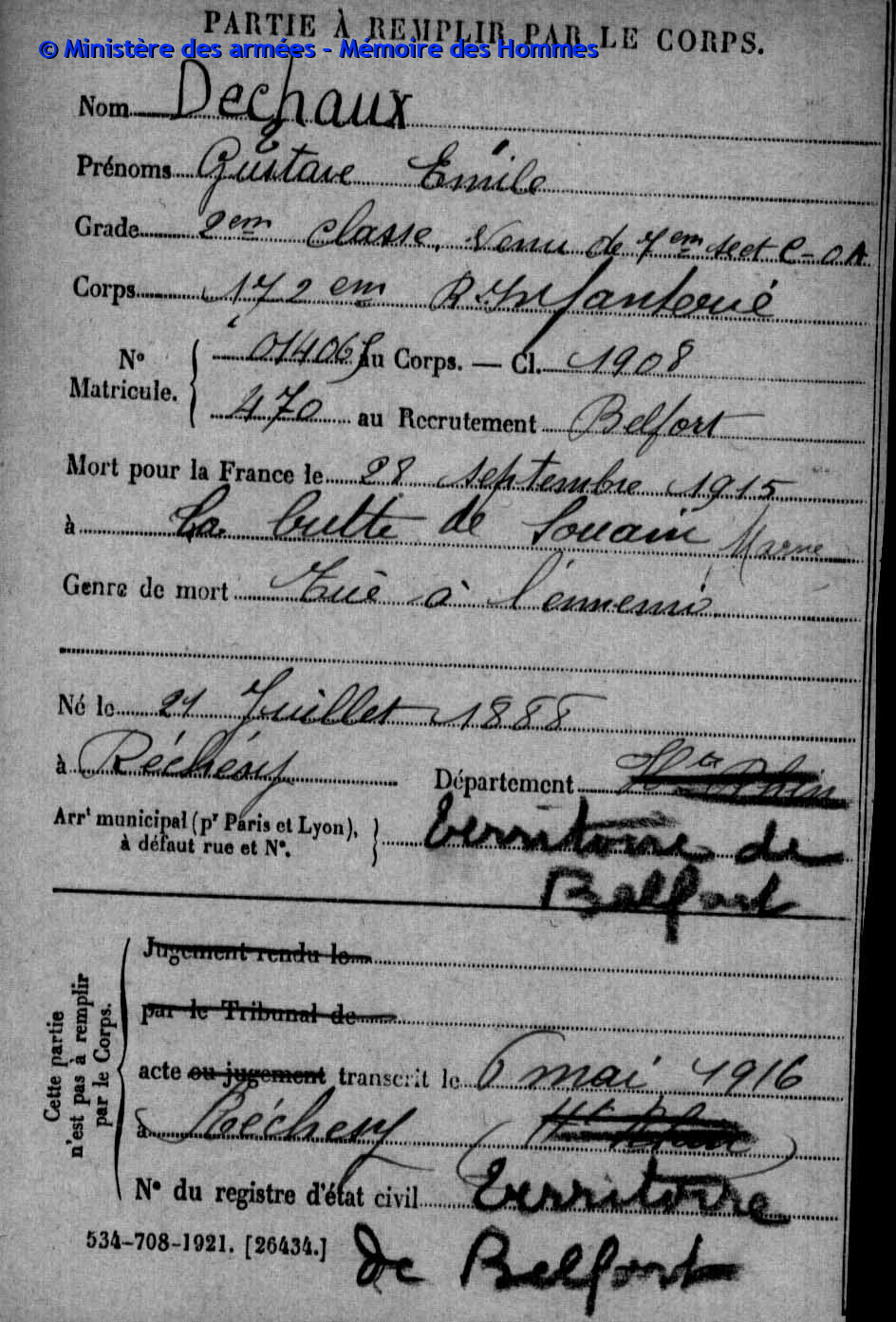 2ème classe DECHAUX Gustave Emile 21.07.1888 - 28.09.1915 172ème Régiment d'Infanterie 10ème Compagnie Gefallen in Perthes-lès-Hurlus - Marne (F) |