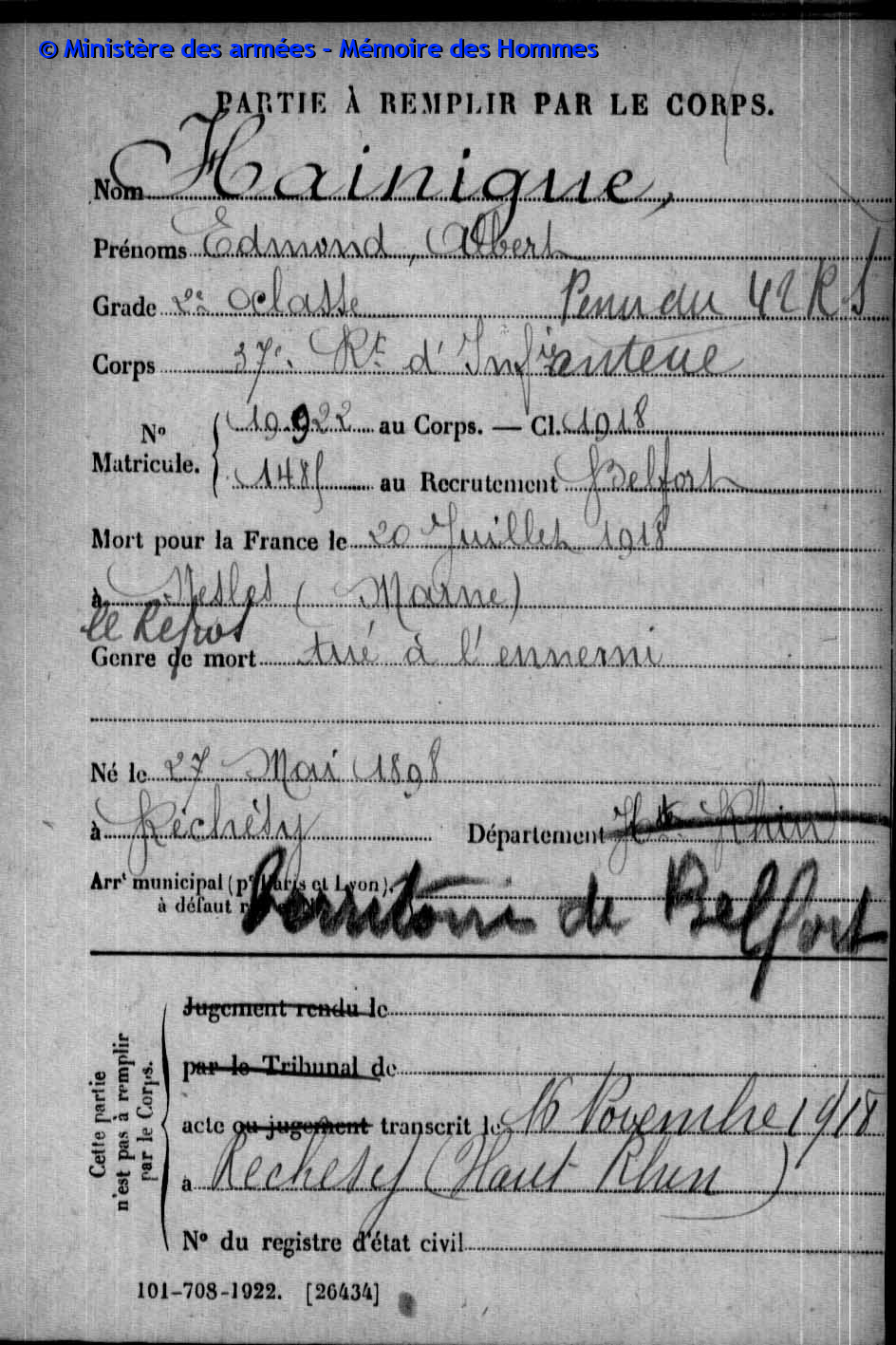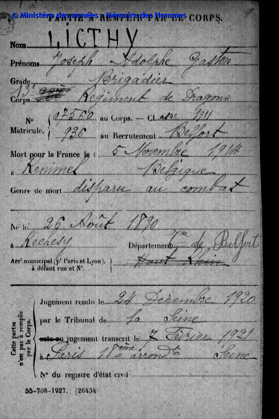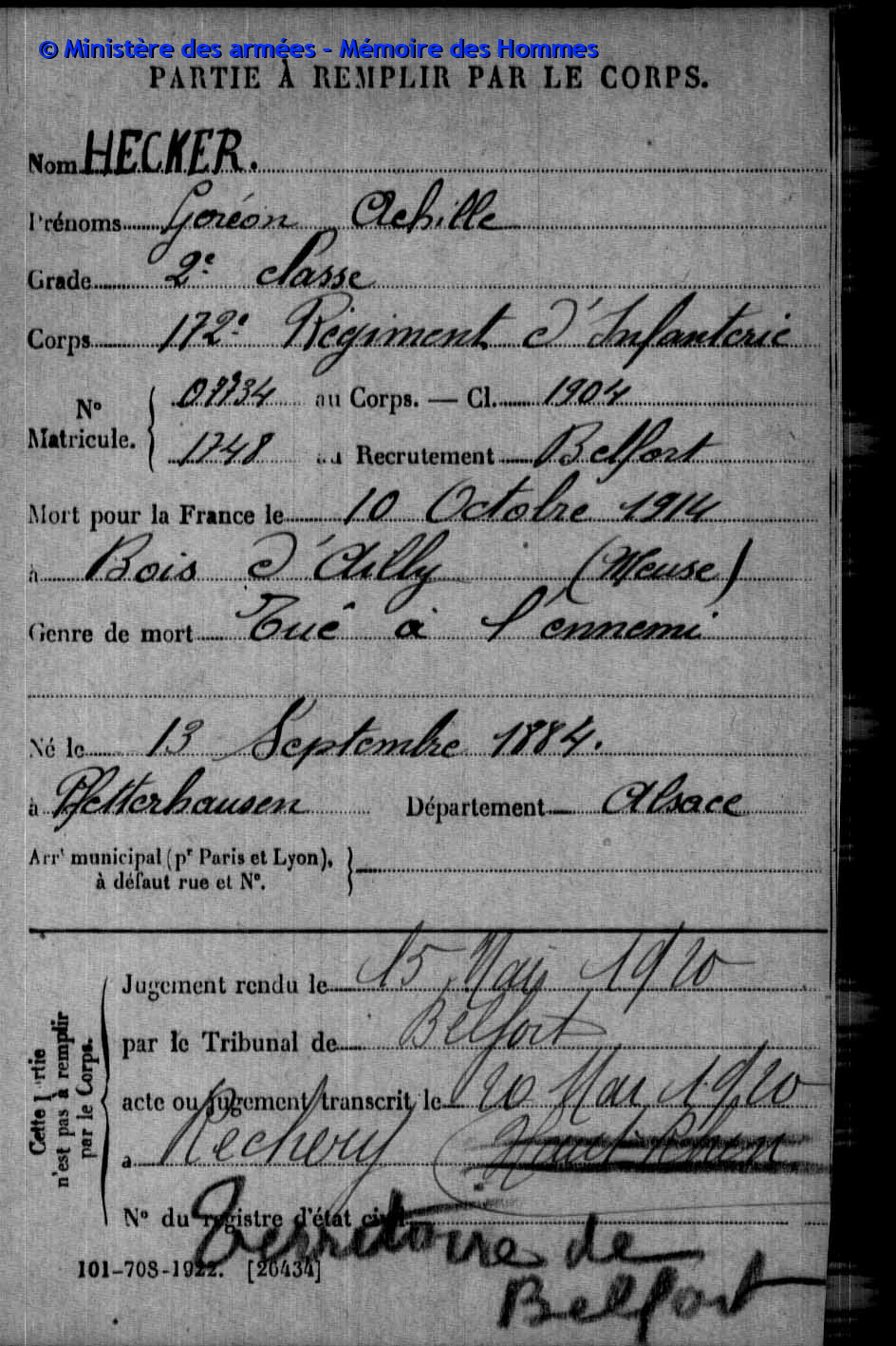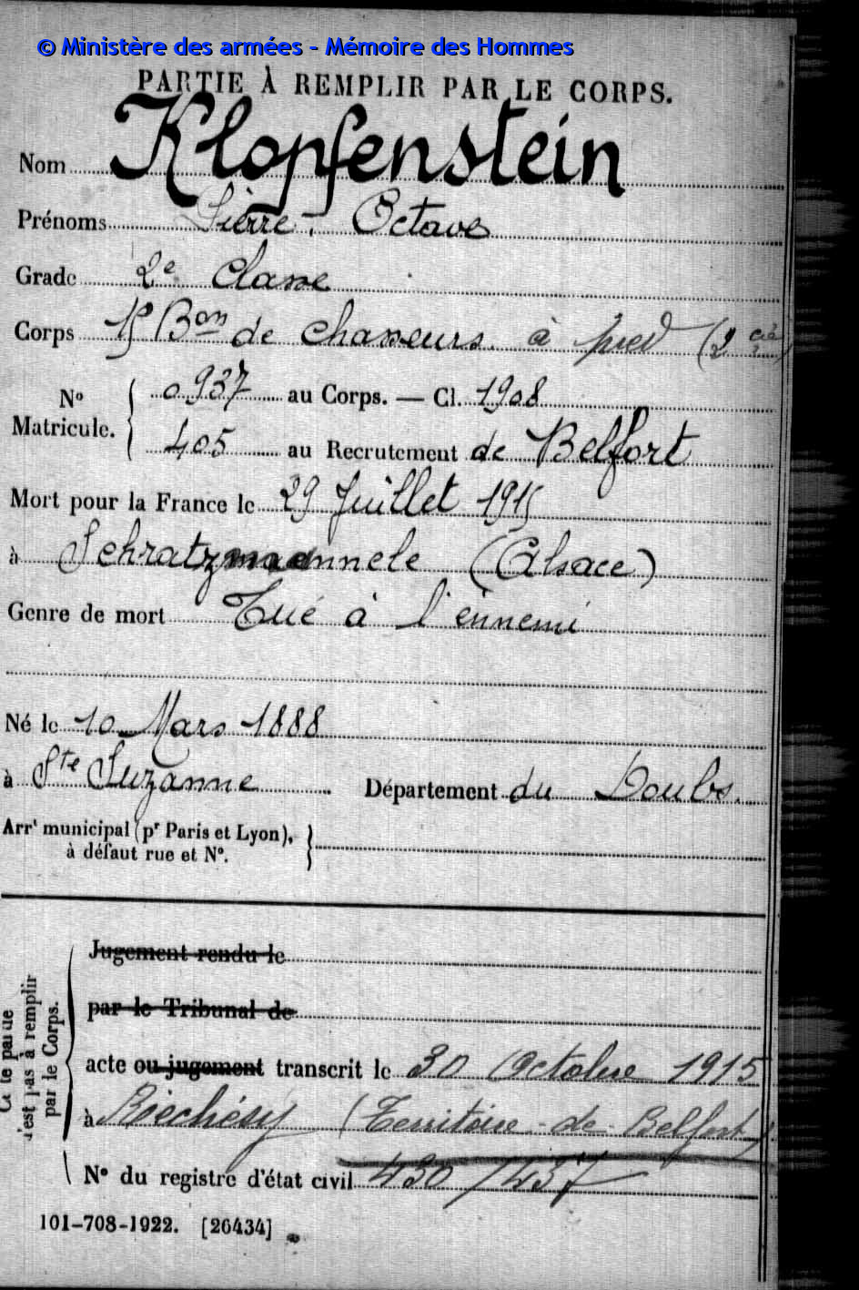 2ème classe DECHAUX Gustave Emile 21.07.1888 - 28.09.1915 172ème Régiment d'Infanterie 10ème Compagnie Gefallen in Perthes-lès-Hurlus - Marne (F) |