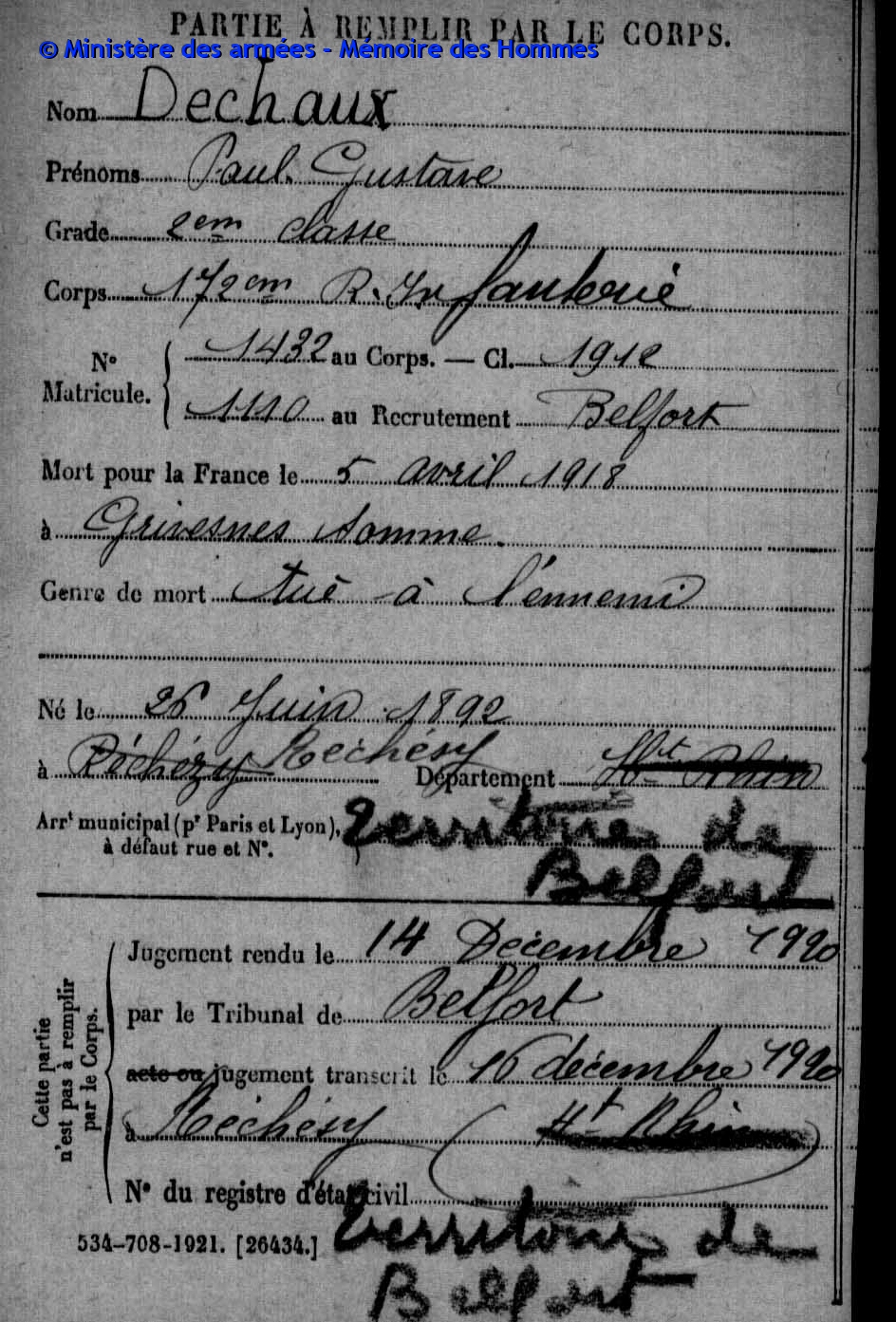 2ème classe DECHAUX Paul Gustave 26.06.1892 - 05.04.1918 172ème Régiment d'Infanterie Gefallen in Grivesnes - Somme (F) |