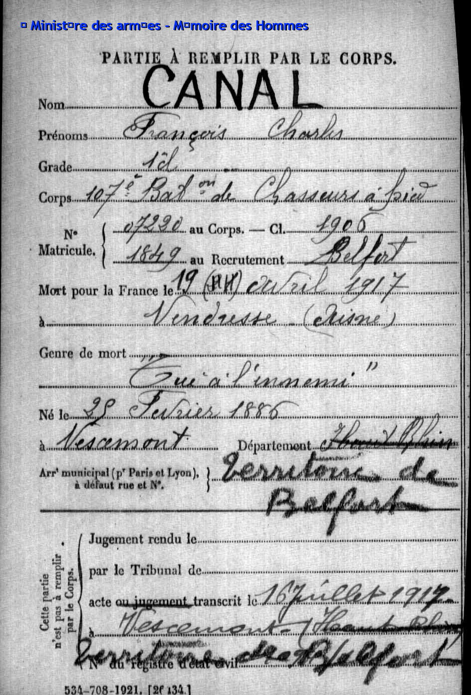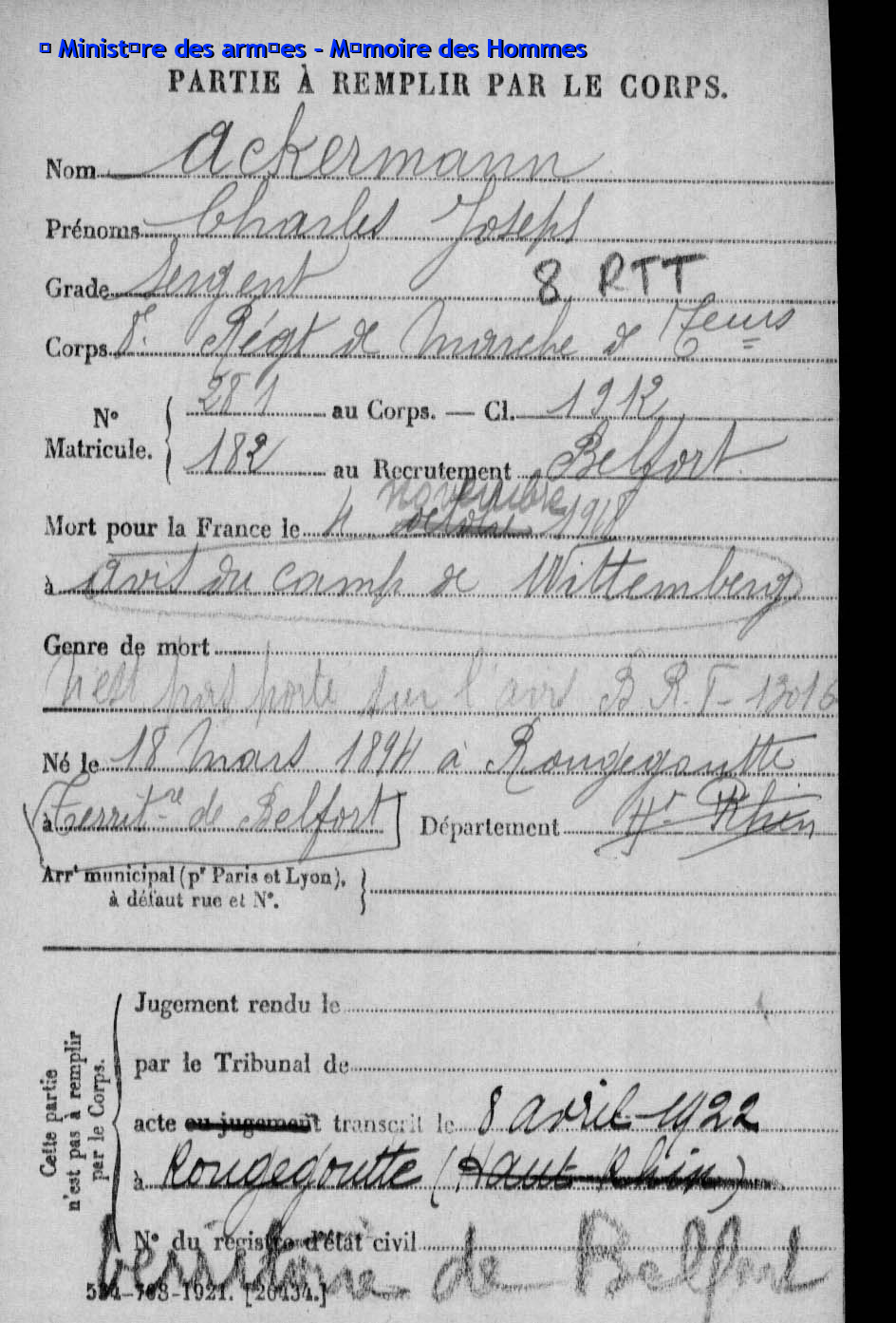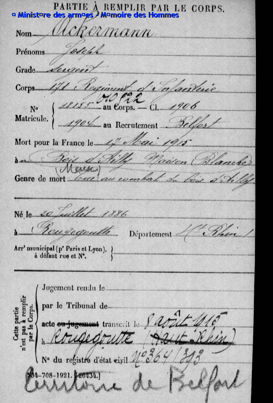 | Sergent ACKERMANN Joseph 20.07.1886 - 17.05.1915 171ème Régiment d'Infanterie Gefallen in Ailly - Meuse (F) |
