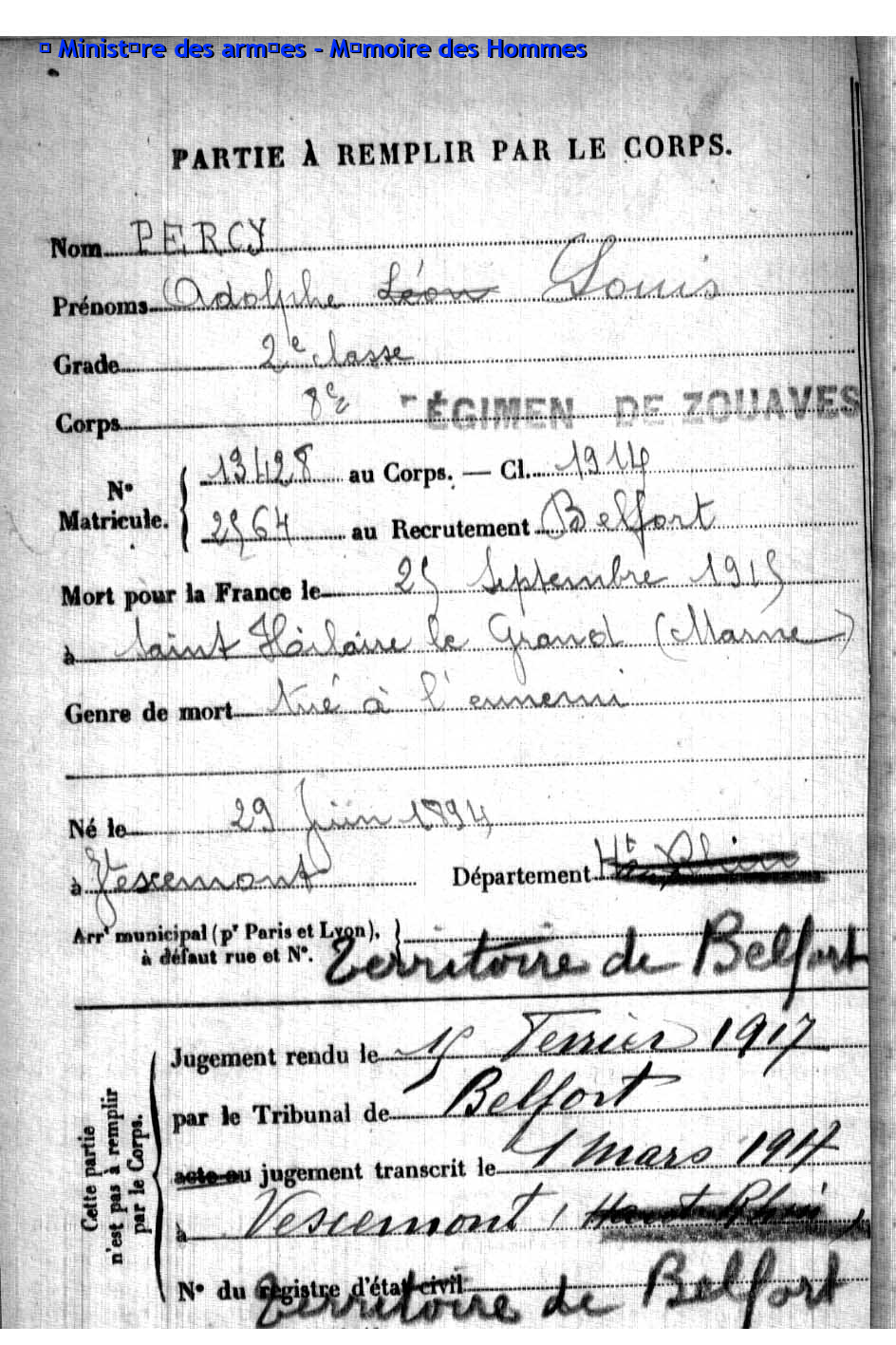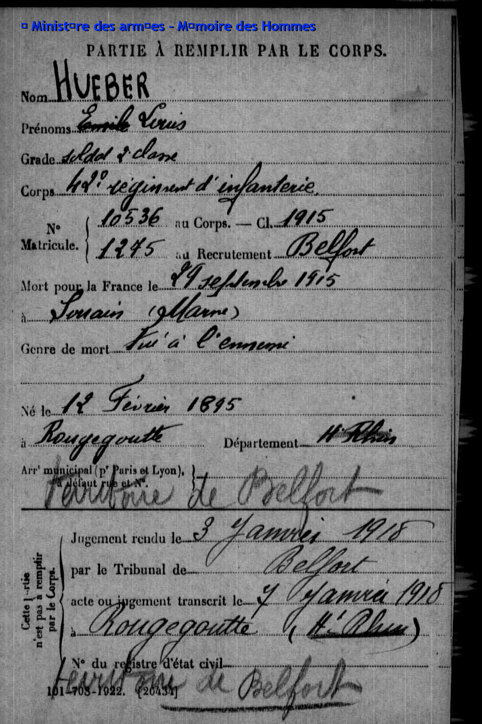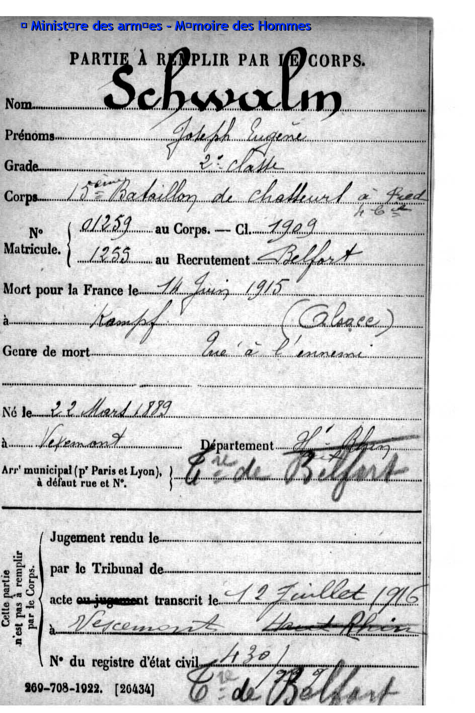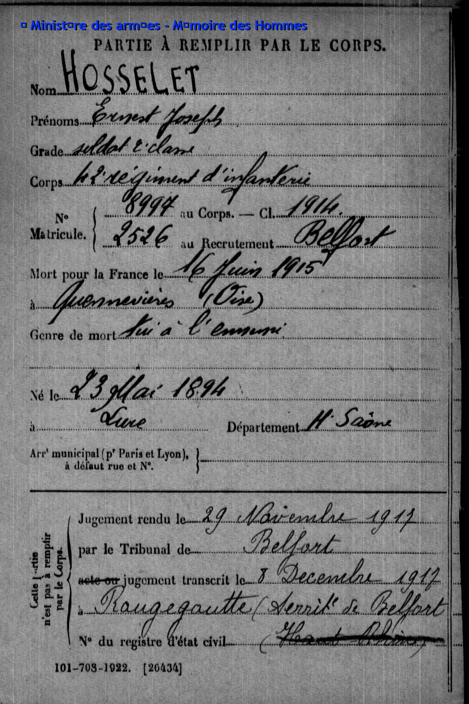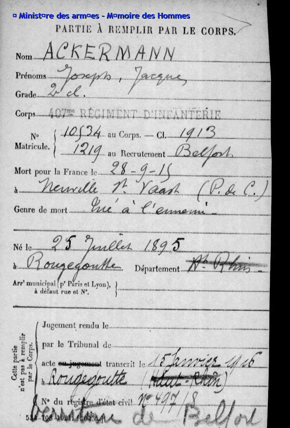2ème classe ACKERMANN Joseph Jacques 25.07.1895 - 28.09.1915 407ème Régiment d'Infanterie Gefallen auf Höhe 140 in Neuville-Saint-Vaast - Pas-de-Calais (F) |