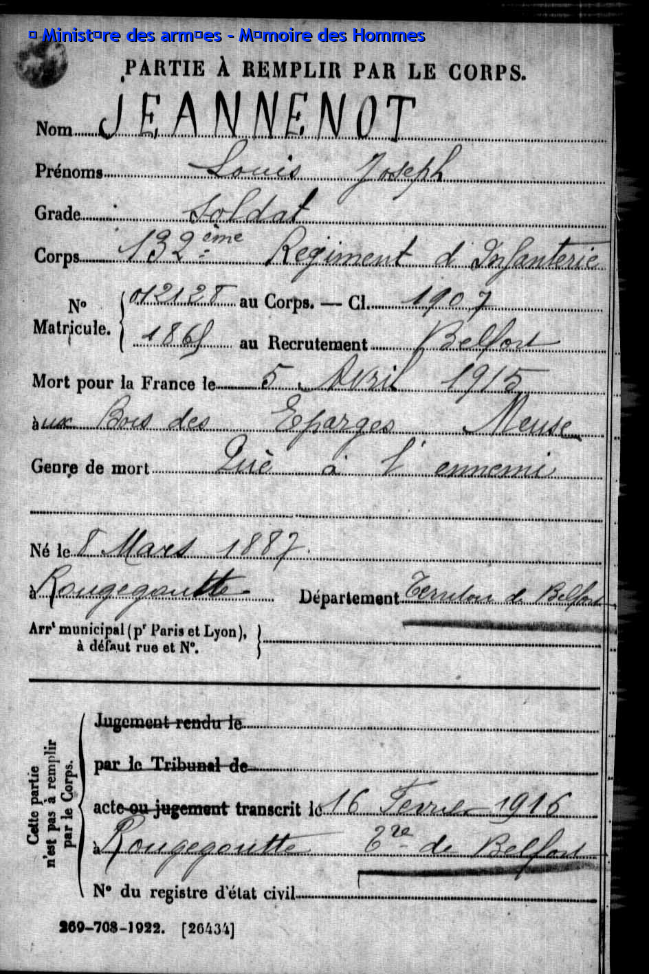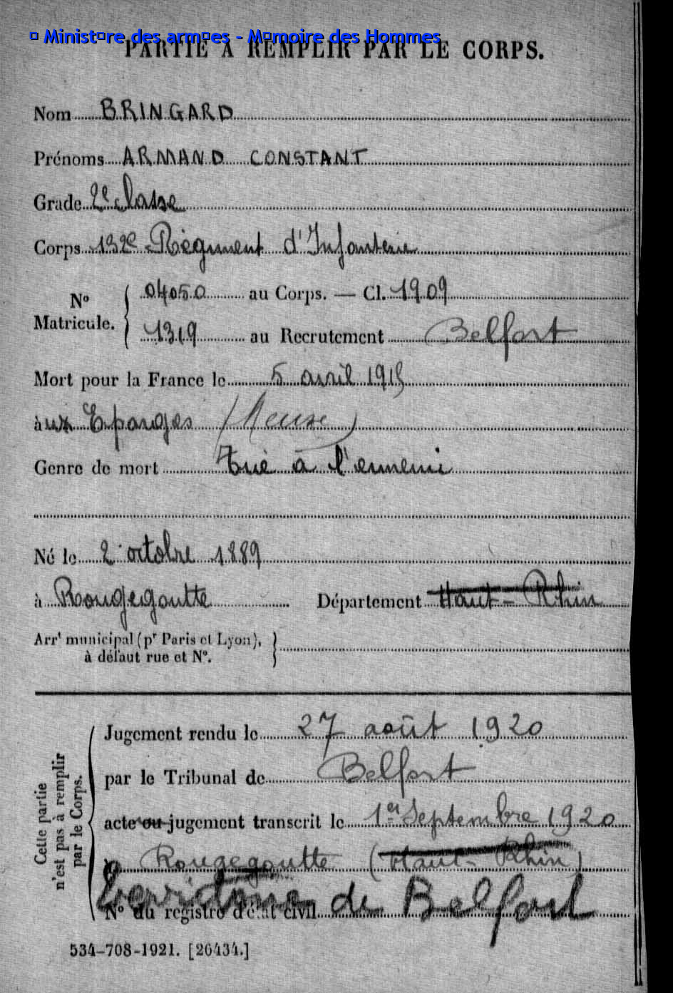 2ème classe BRINGARD Armand Constant 02.10.1889 - 05.04.1915 132ème Régiment d'Infanterie Gefallen in Les Eparges - Meuse (F) |