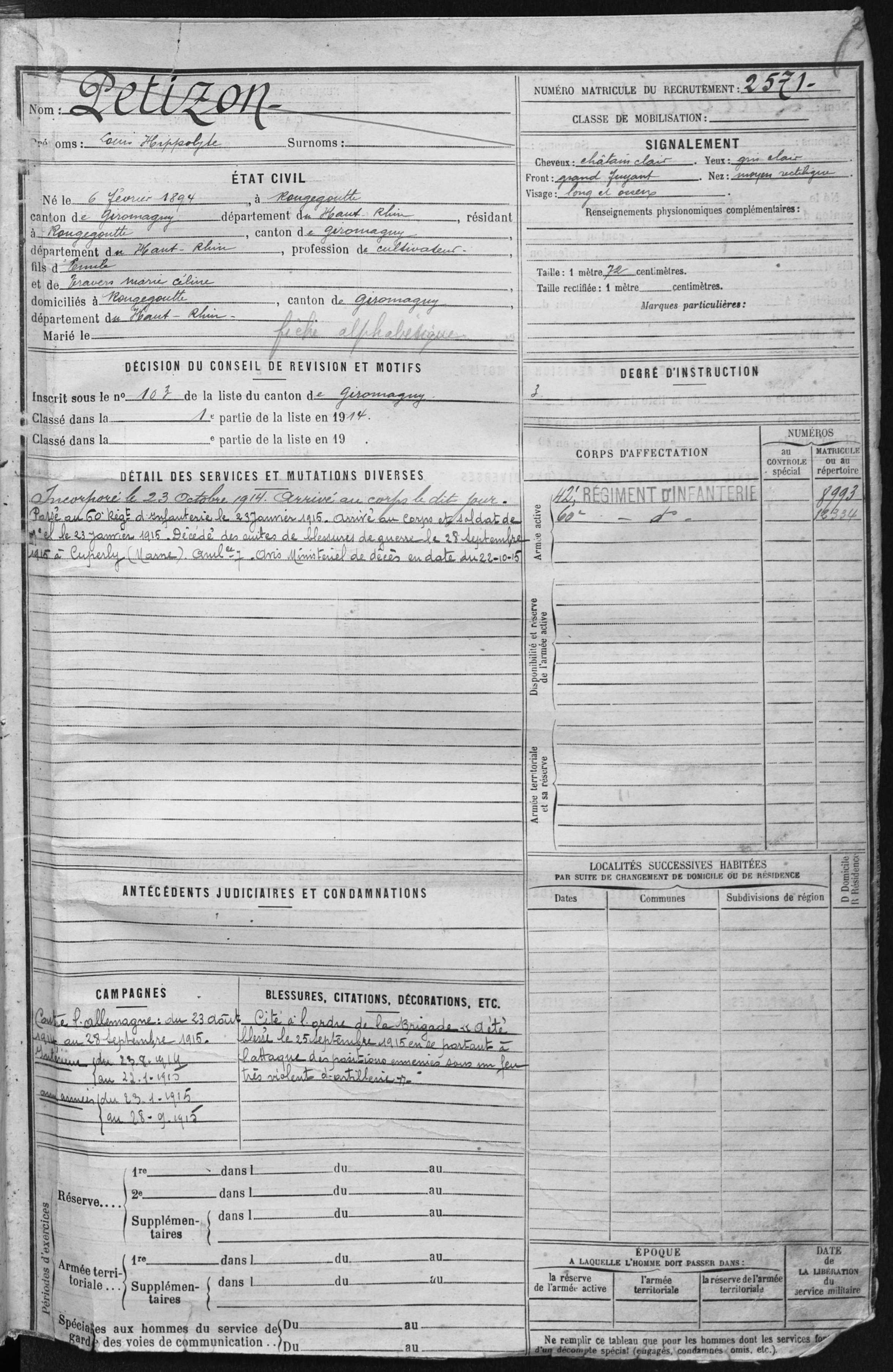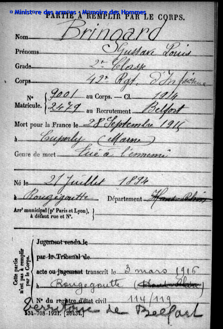 2ème classe BRINGARD Gustave Louis 21.07.1894 - 28.09.1915 42ème Régiment d'Infanterie Gefallen in Cuperly - Merne (F) |