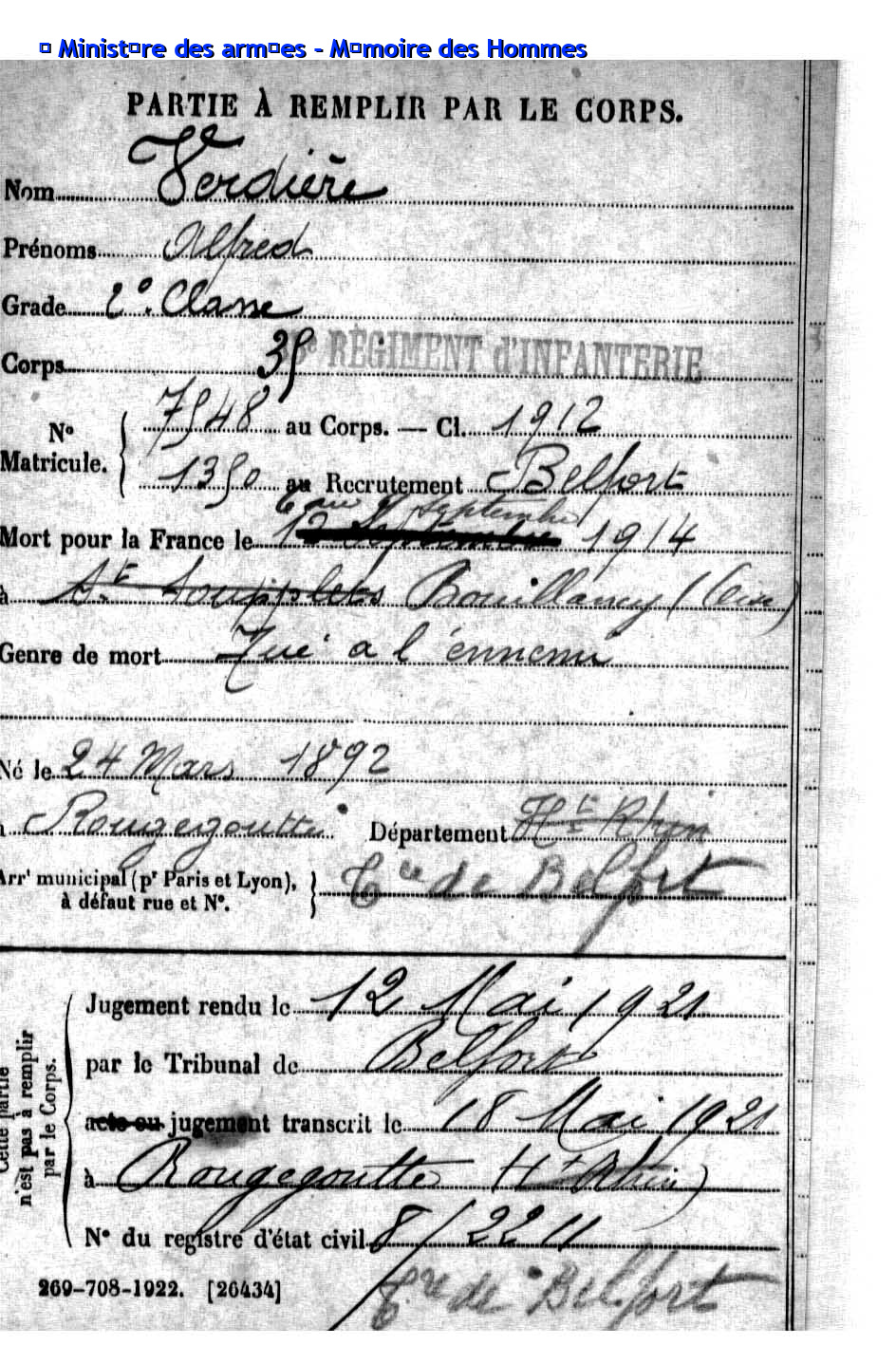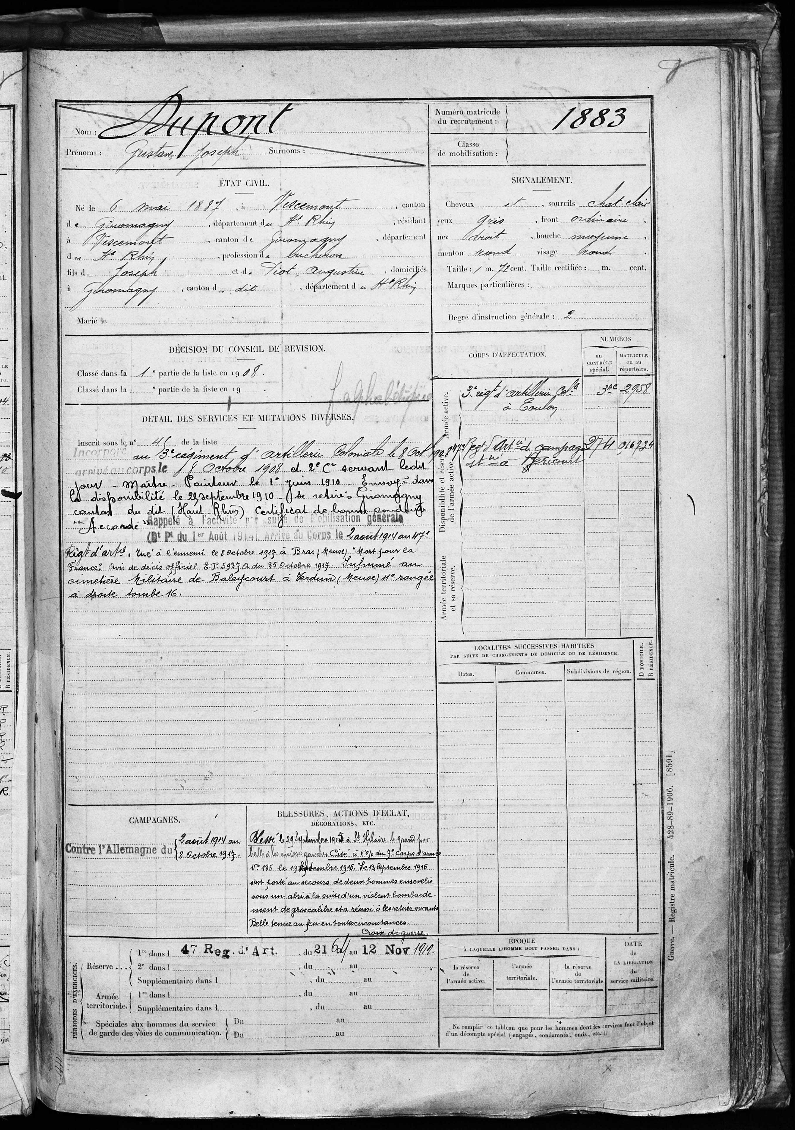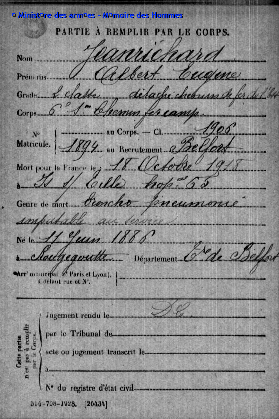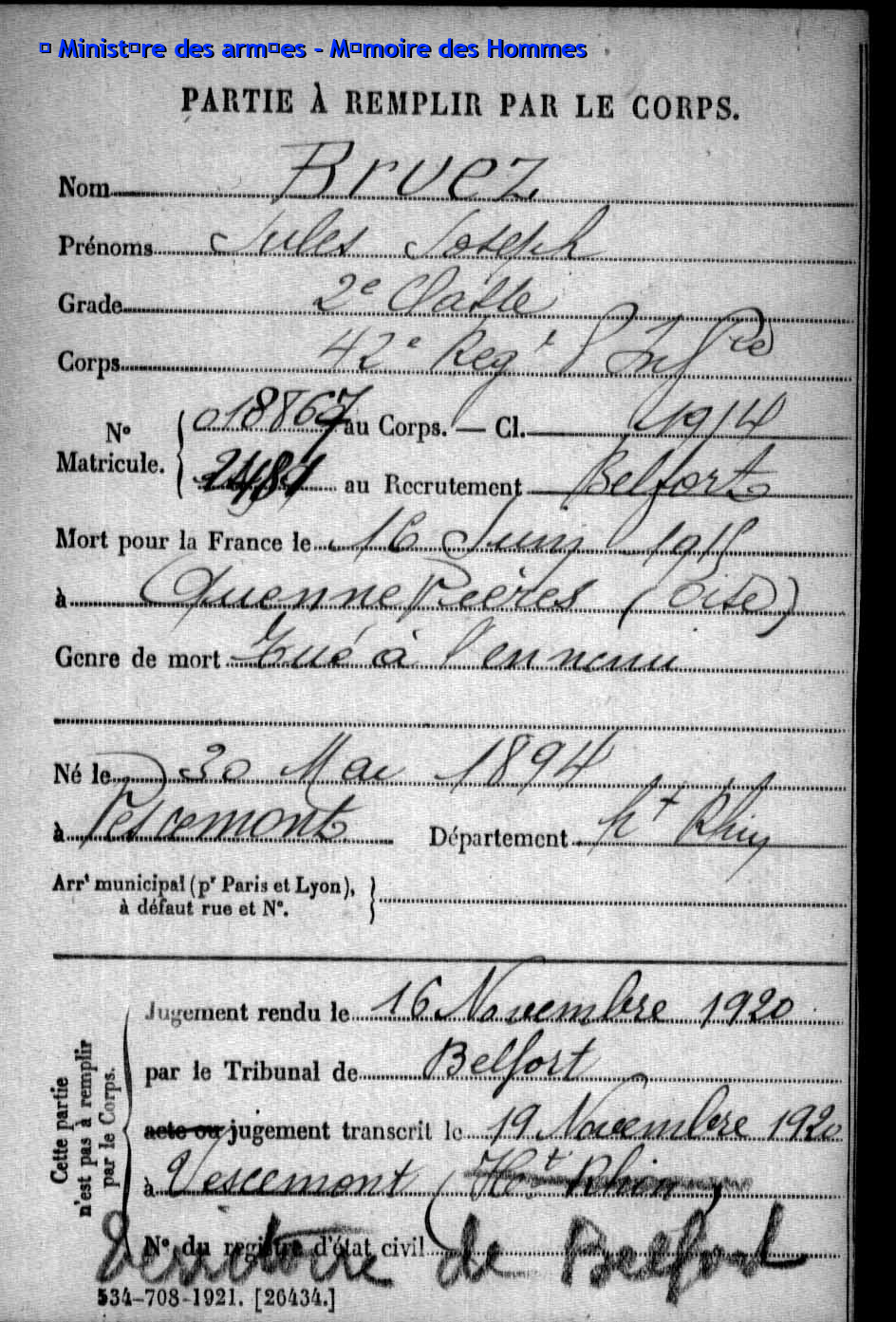 | Pionnier BRINGARD Maurice Georges Victor 20.08.1913 - 18.06.1940 428ème Régiment de Pionniers 2ème Bataillon, 5ème Compagnie Gefallen im Fort de la Justice in Belfort (F) |