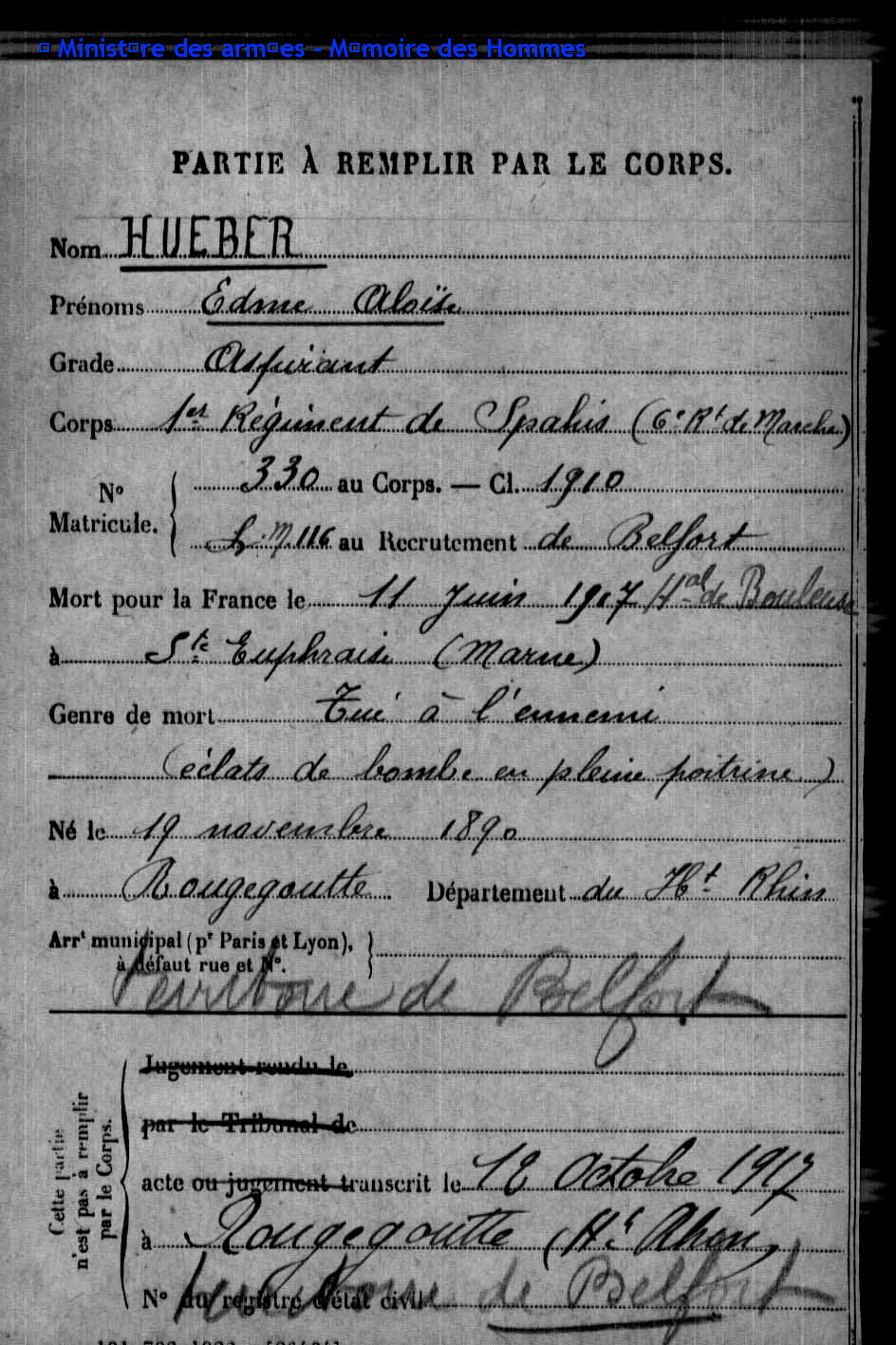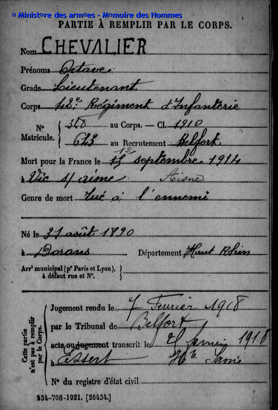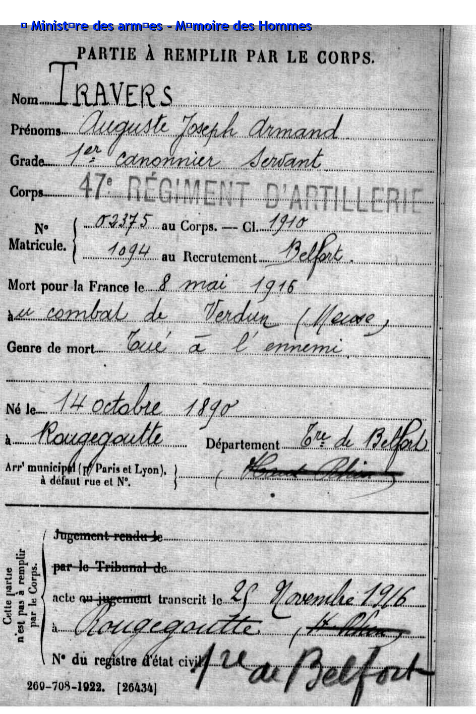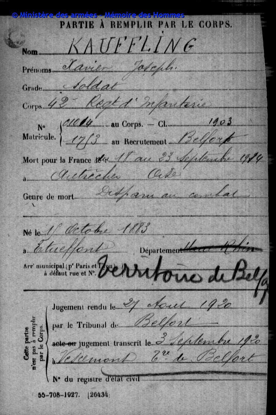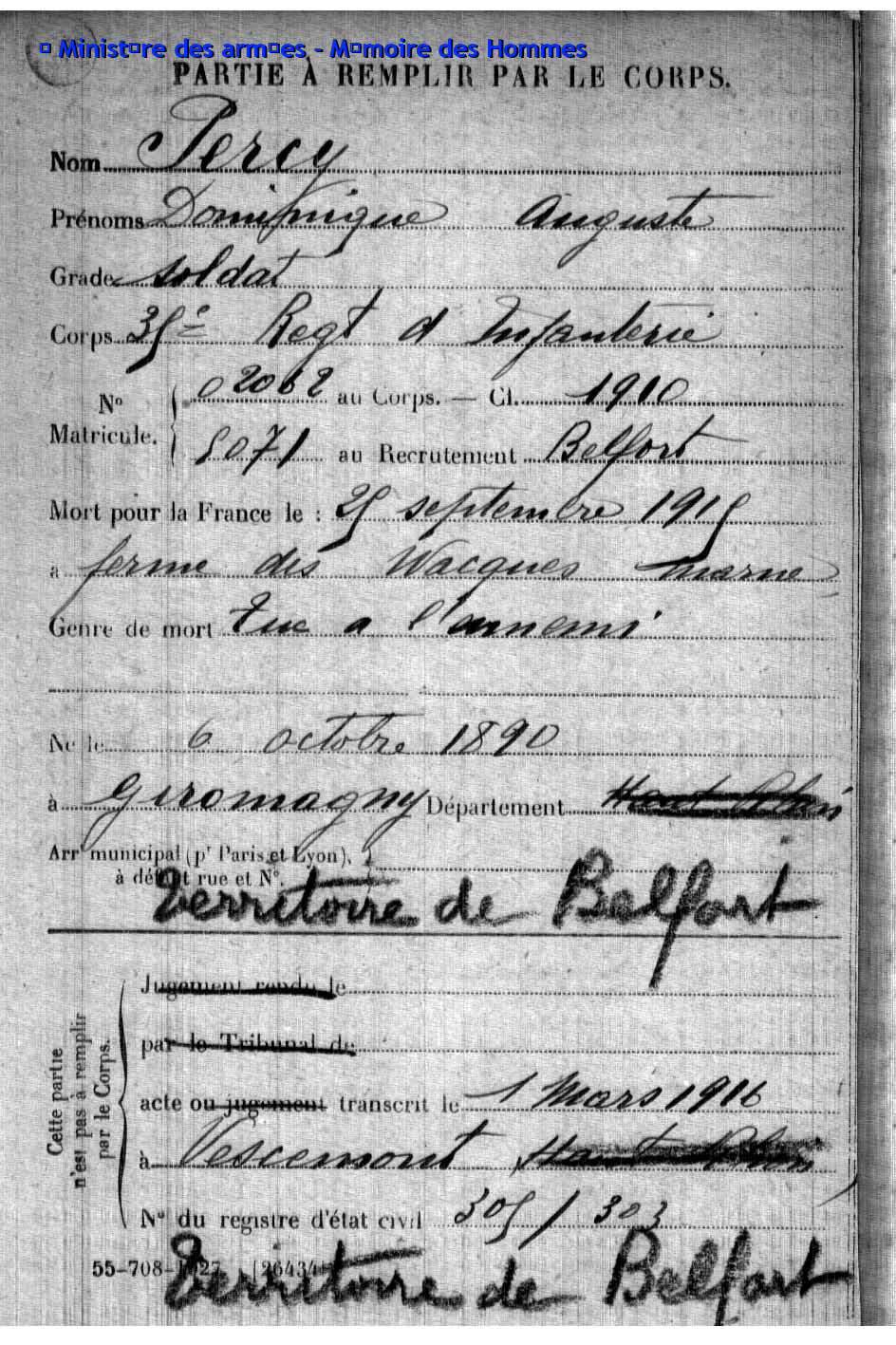 | Pionnier BRINGARD Maurice Georges Victor 20.08.1913 - 18.06.1940 428ème Régiment de Pionniers 2ème Bataillon, 5ème Compagnie Gefallen im Fort de la Justice in Belfort (F) |