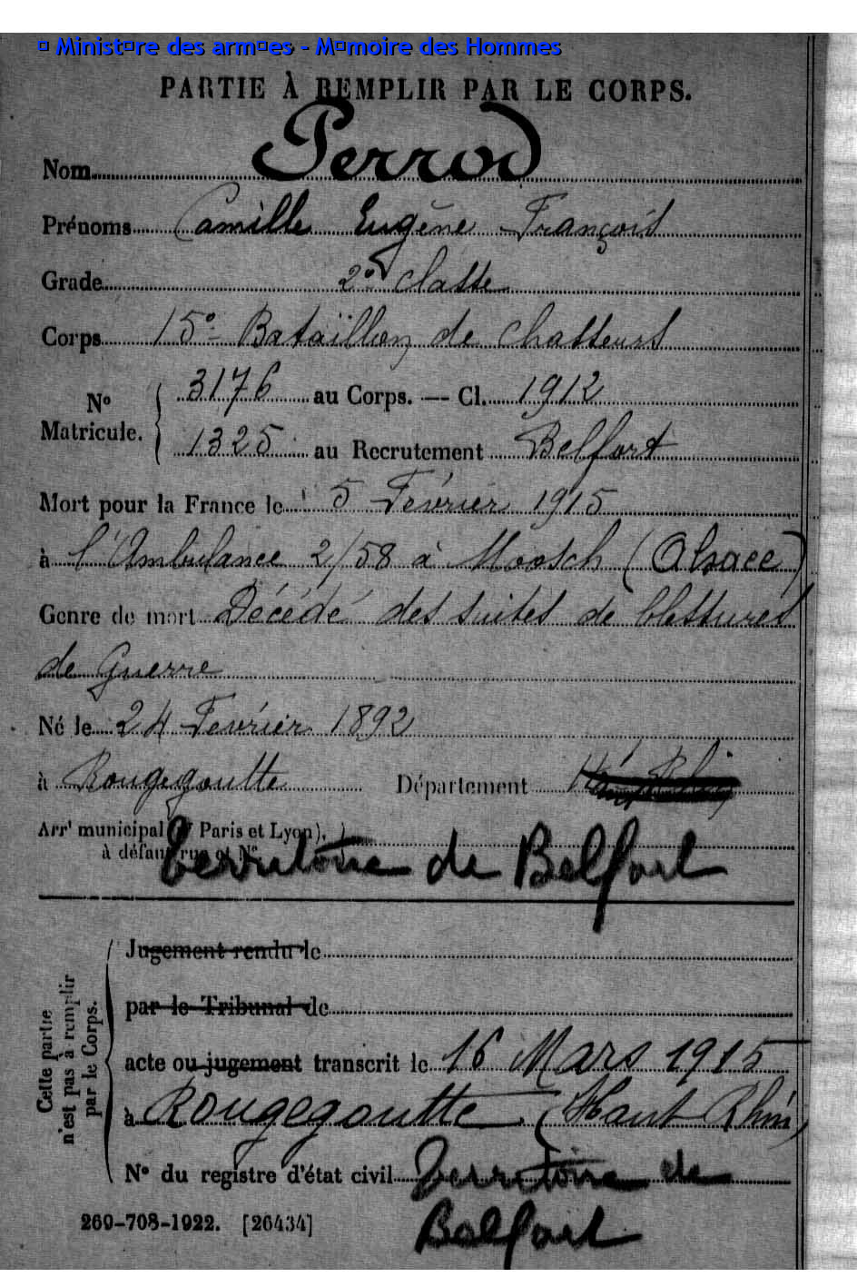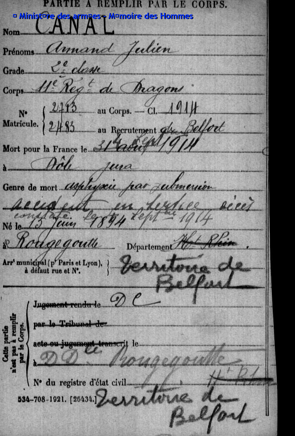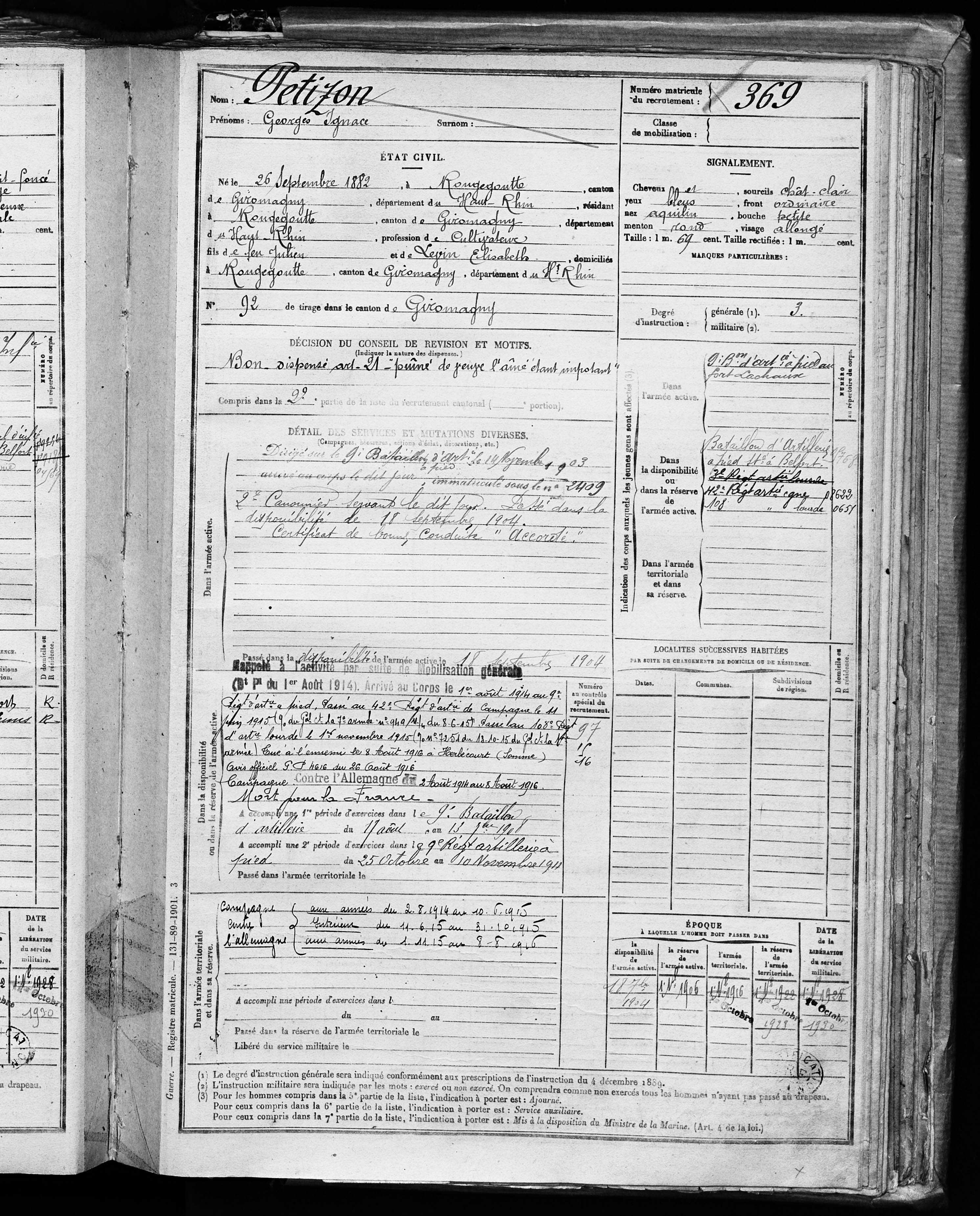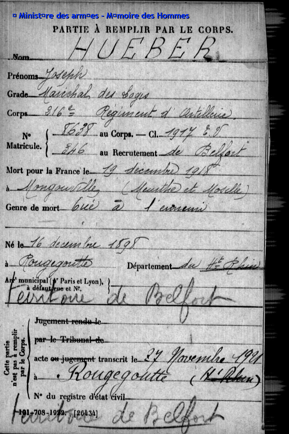| Pionnier BRINGARD Maurice Georges Victor 20.08.1913 - 18.06.1940 428ème Régiment de Pionniers 2ème Bataillon, 5ème Compagnie Gefallen im Fort de la Justice in Belfort (F) |