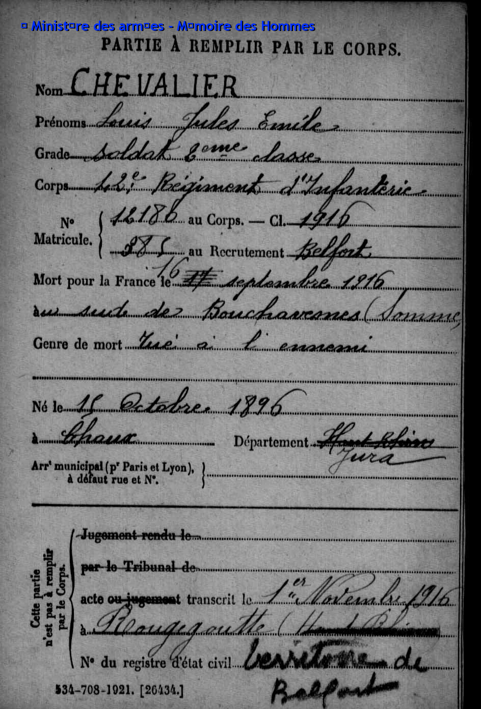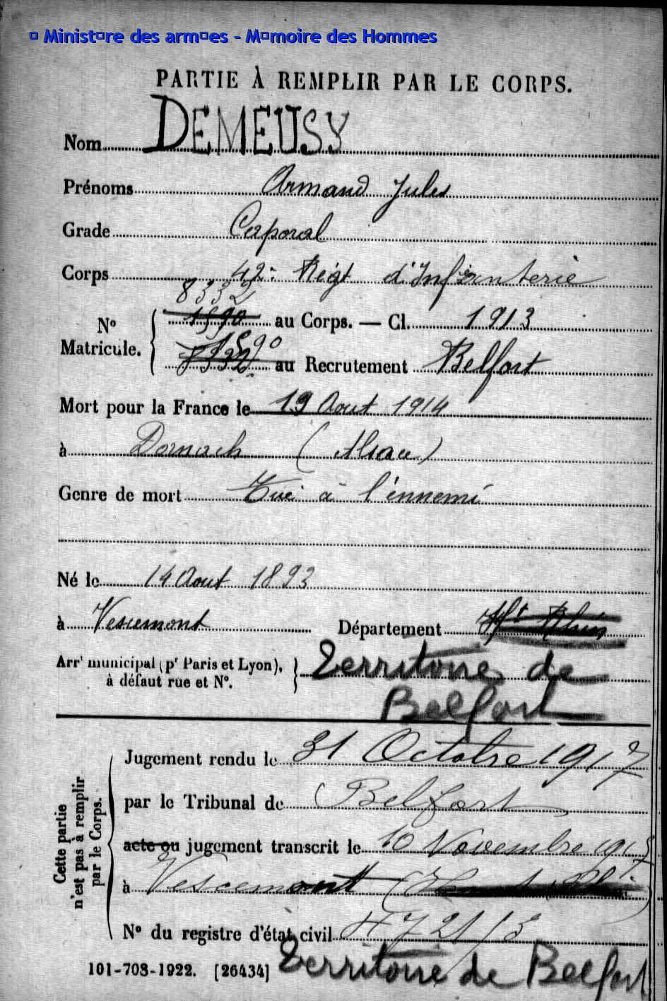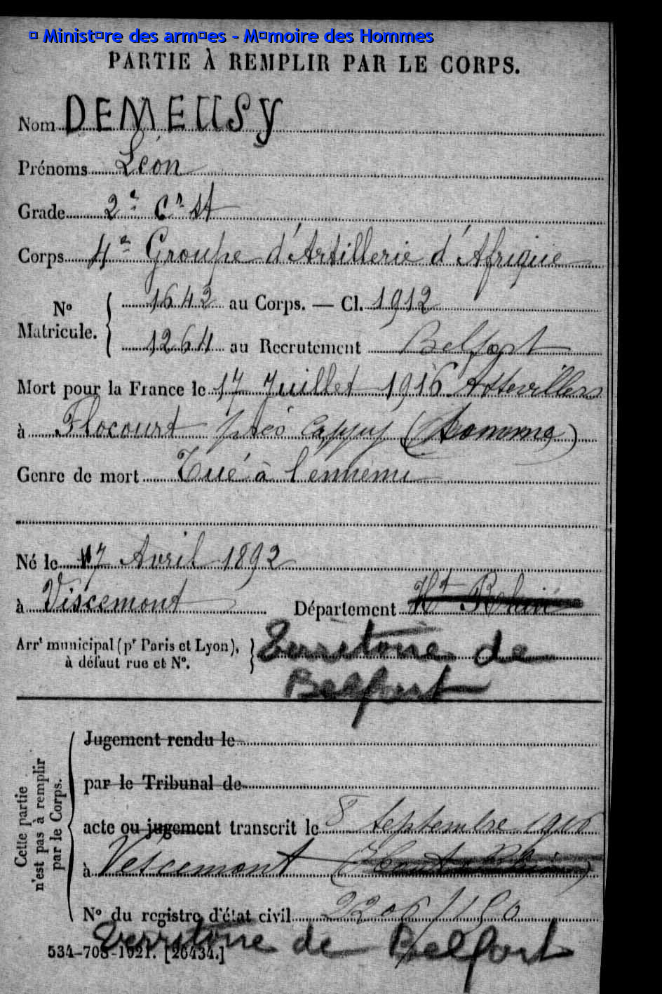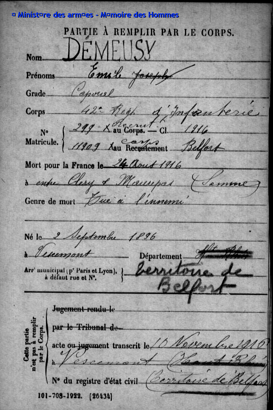 | Caporal DEMEUSY Emile Joseph 02.09.1896 - 24.08.1916 42ème Régiment d'Infanterie Gefallen in Cléry-sur-Somme (F) |
