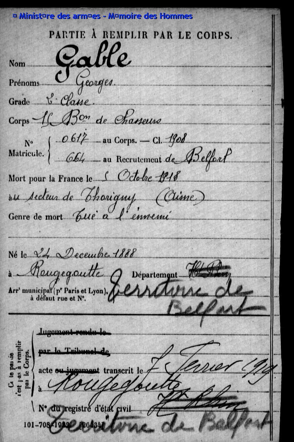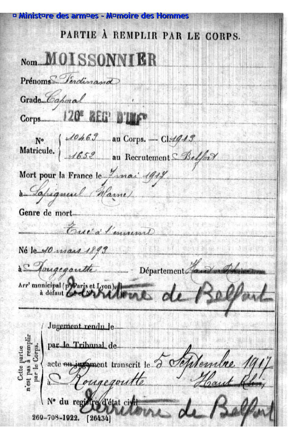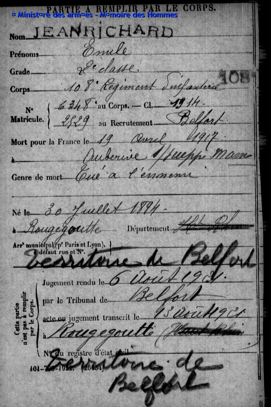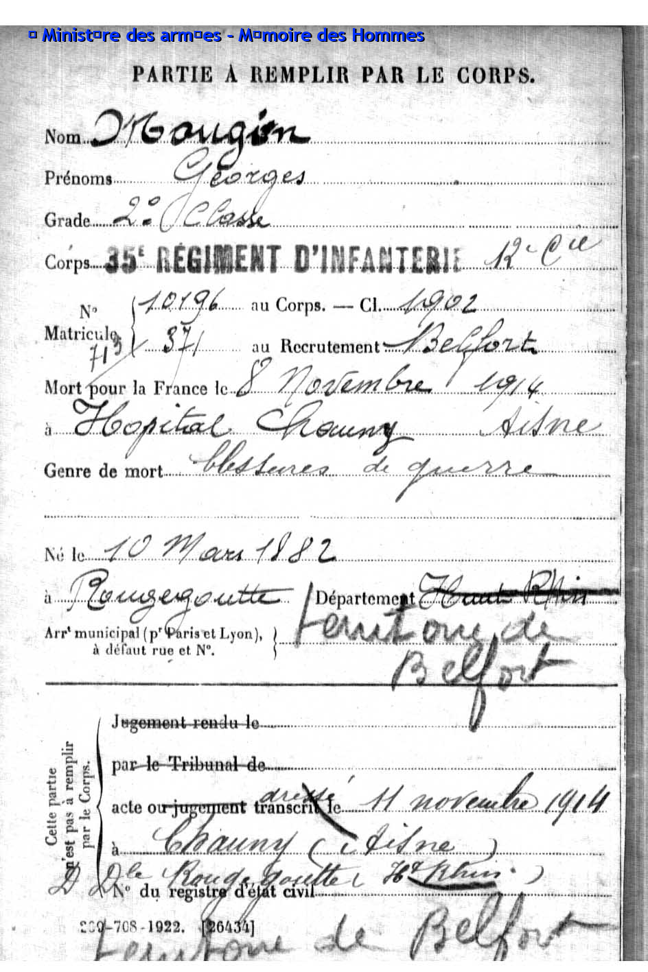 | Soldat MOUGIN Georges Emile 07.09.1879 - 11.06.1918 359ème Régiment d'Infanterie Gefallen in Courcelles-Epayelles - Oise (F) |