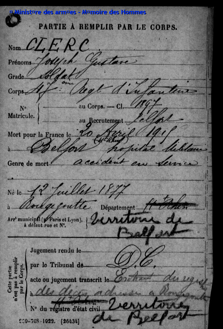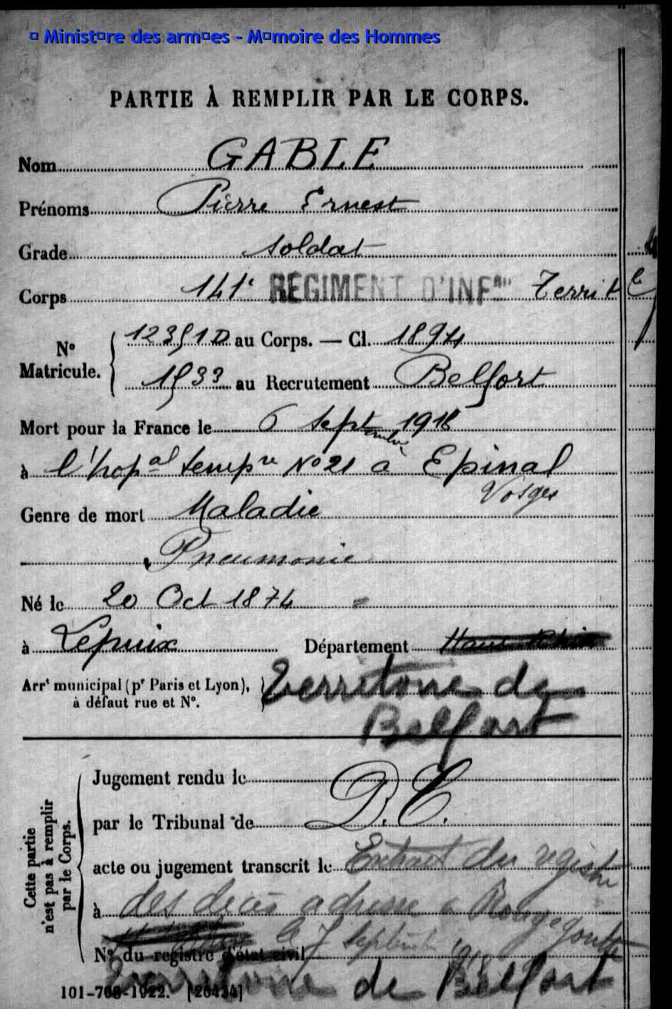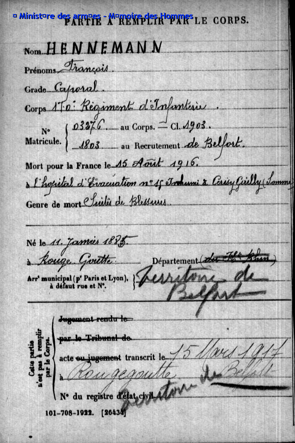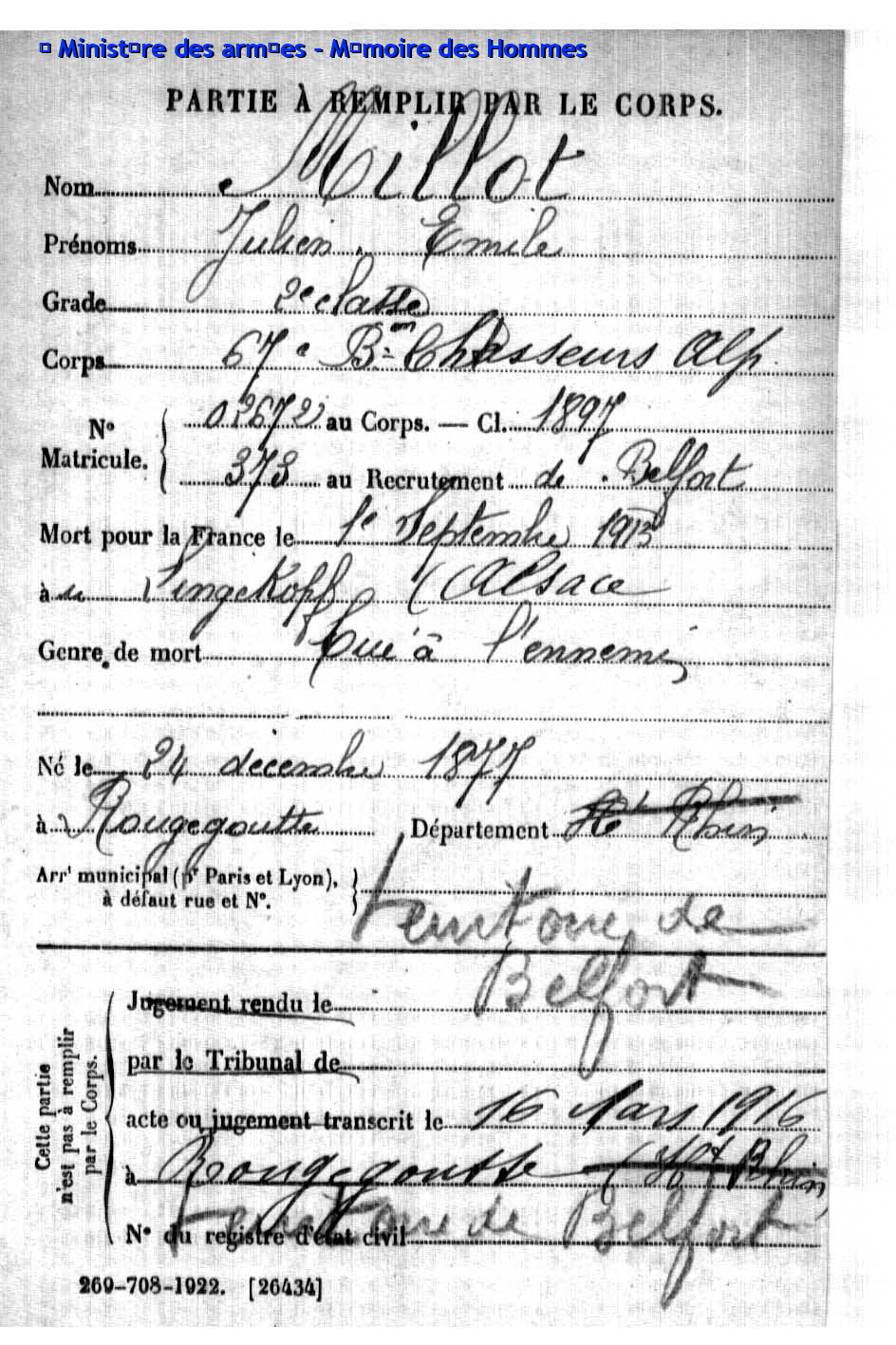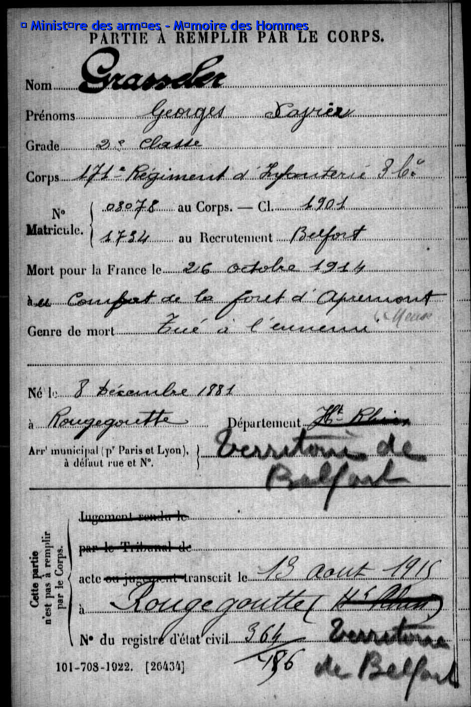 | Soldat MOUGIN Georges Emile 07.09.1879 - 11.06.1918 359ème Régiment d'Infanterie Gefallen in Courcelles-Epayelles - Oise (F) |
