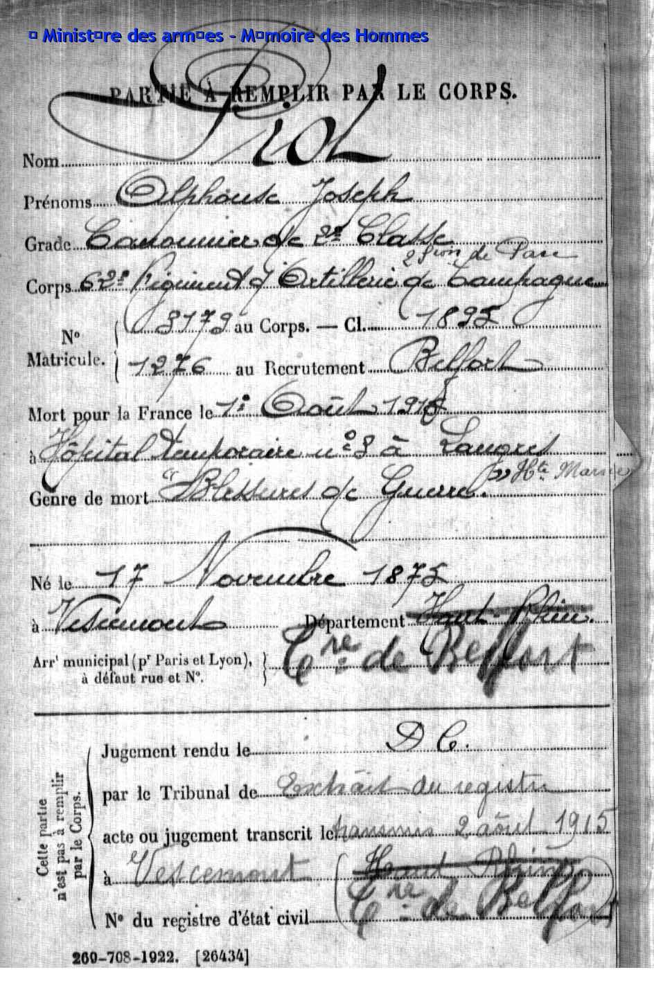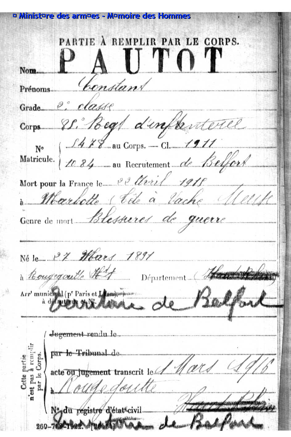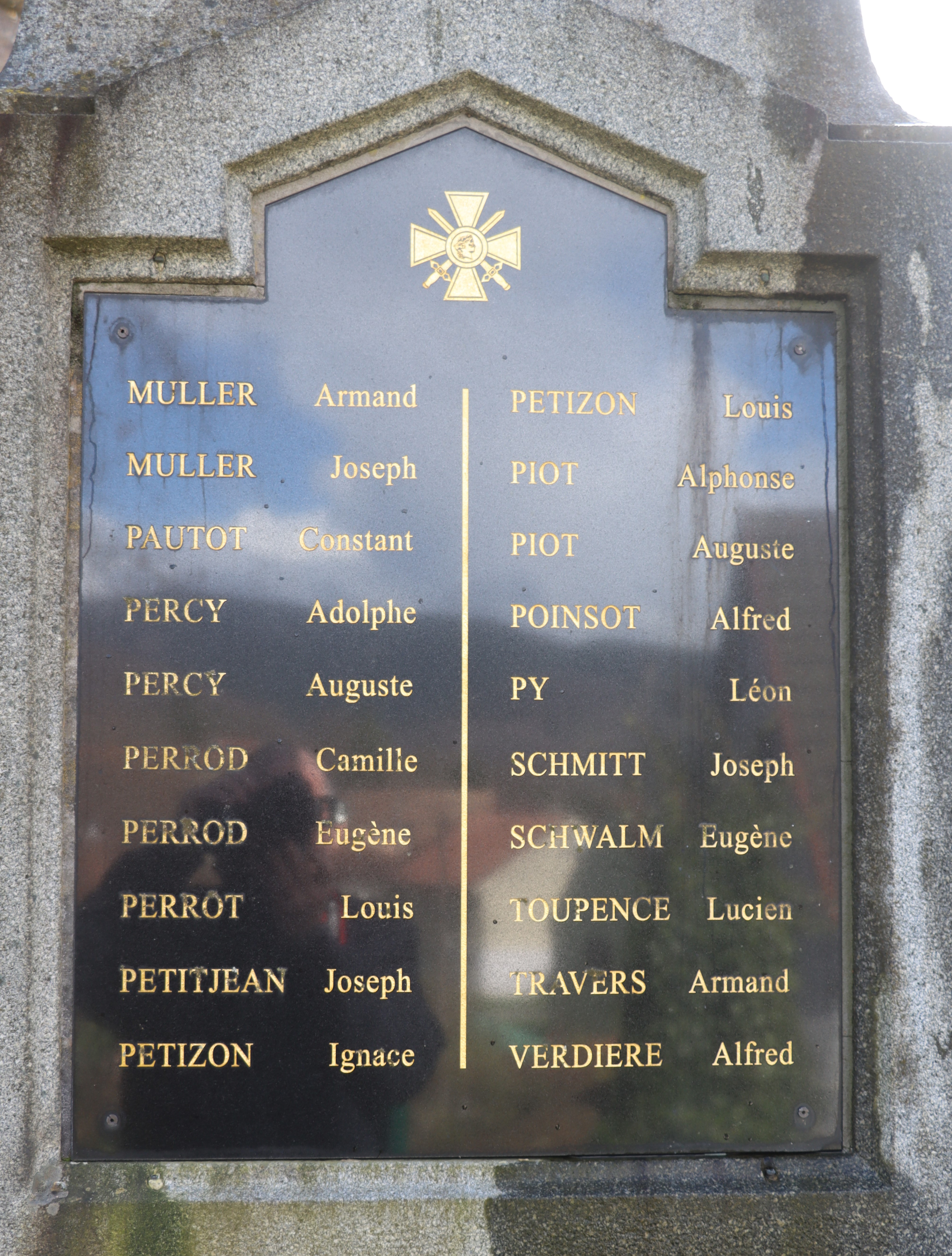 Auf dem Kriegerdenkmal der 8,07 Km2 kleinen Gemeinde mit 981 Einwohner im Departement Territoire de Belfort (F), sind 81 Kriegsopfer verzeichnet, davon sind 57 mit Fabian Coulot verwandt.