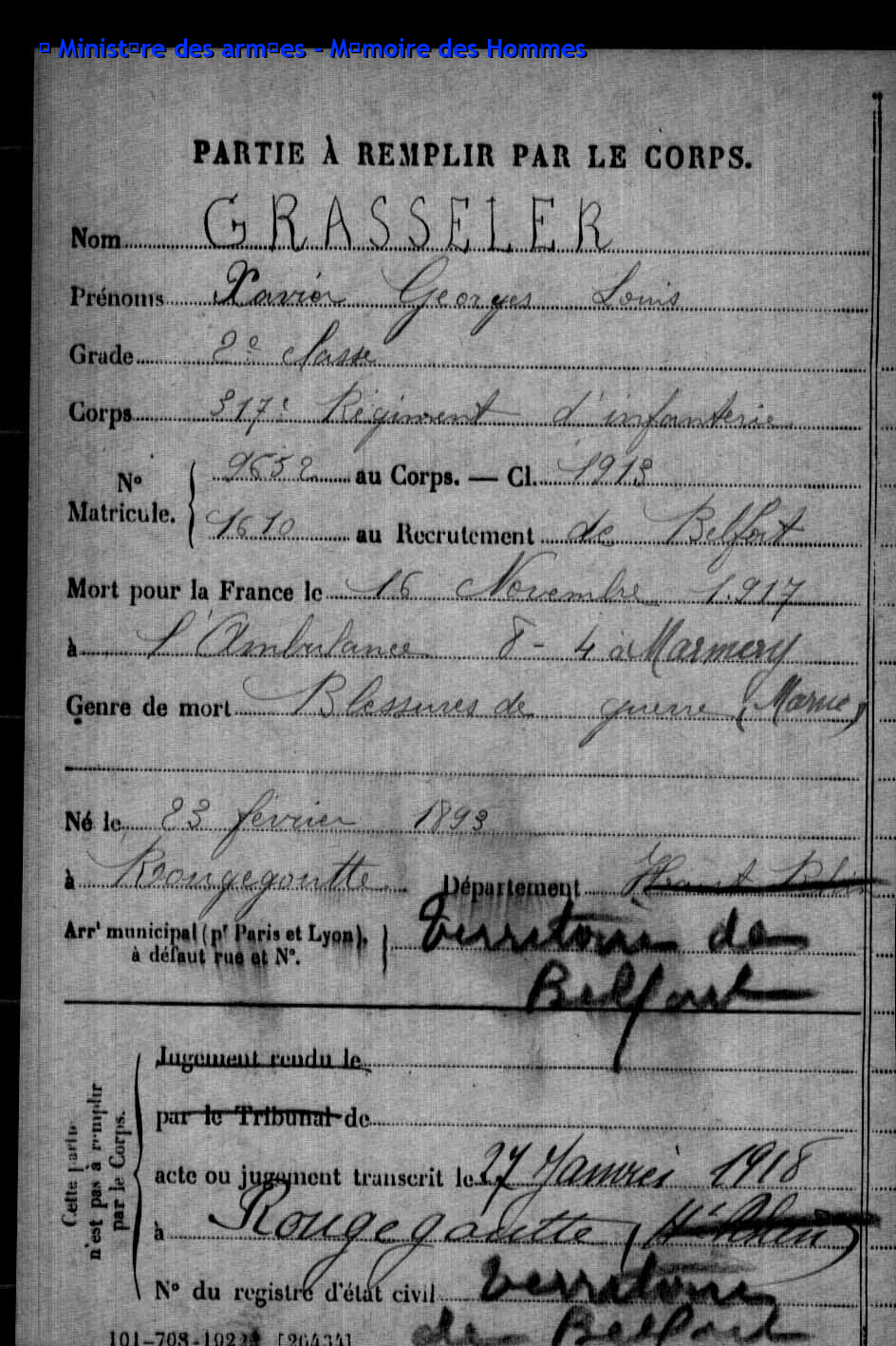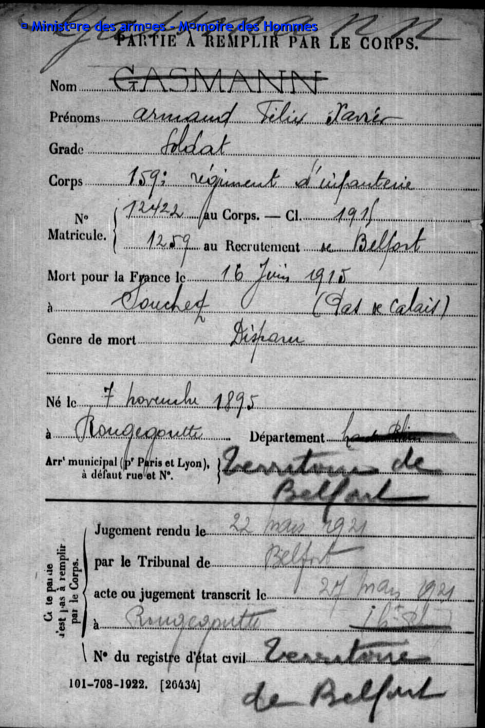 | Soldat GASSMANN Armand Félix Xavier 07.11.1895 - 16.05.1915 159ème Régiment d'Infanterie Gilt als vermisst in Souchez - Pas-de-Calais (F) |