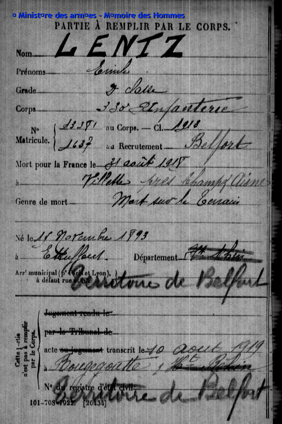2ème classe LENTZ Emile 15.11.1893 - 31.08.1918 330ème Régiment d'Infanterie Gefallen in Champs - Aisne (F) |