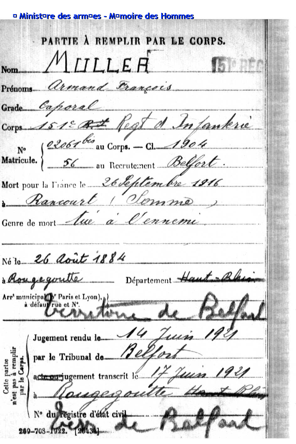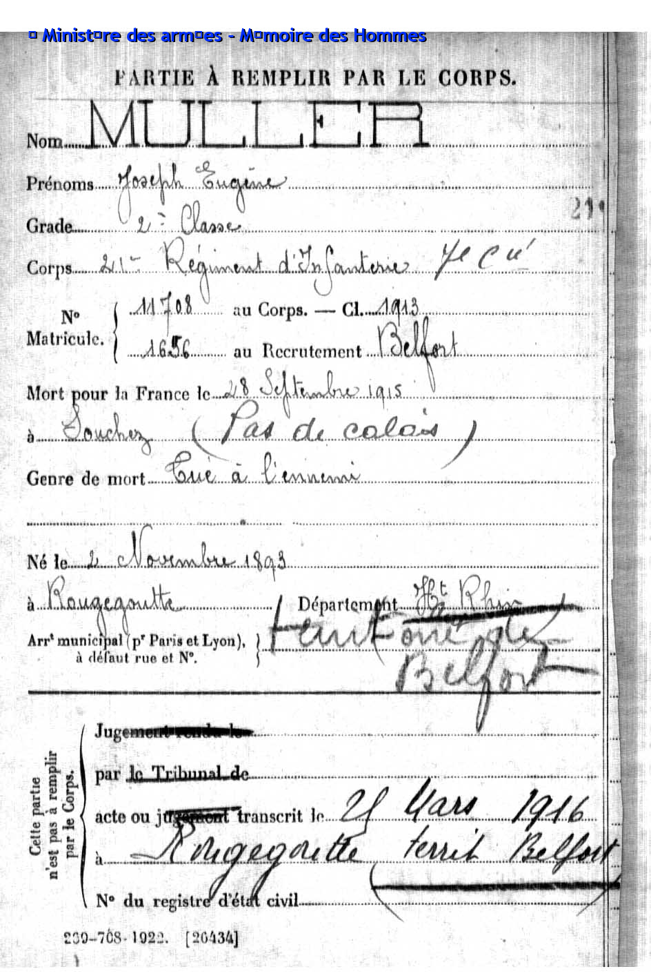 2ème classe MULLER Joseph Eugène 02.11.1893 - 28.09.1915 21ème Régiment d'Infanterie 7ème Compagnie Gefallen in Souchez - Pas-de-Calais (F) |