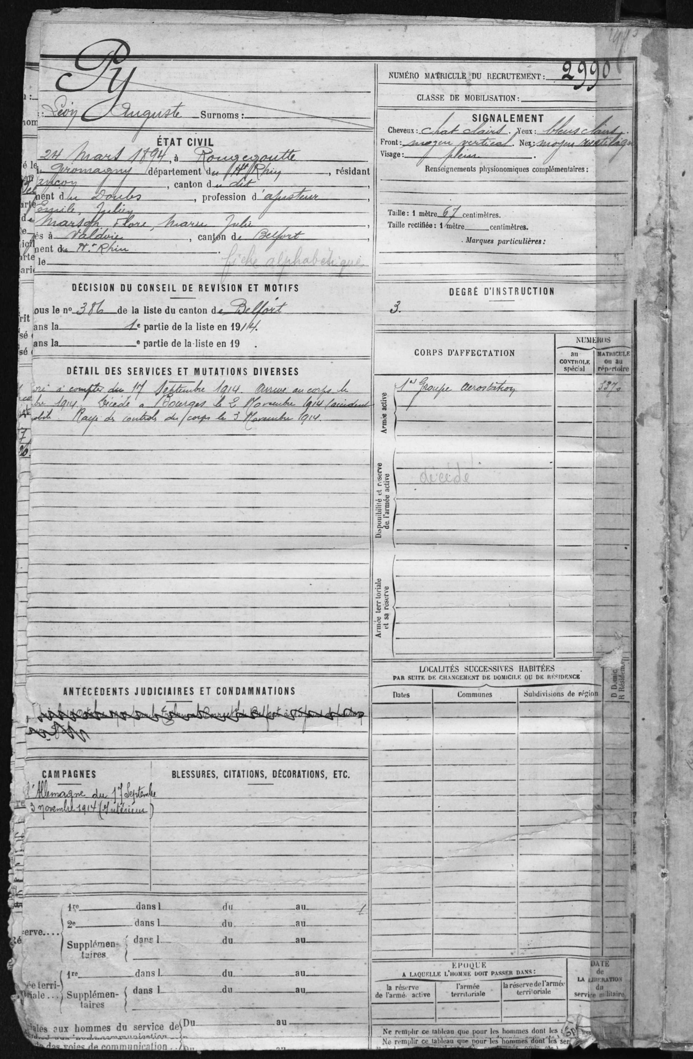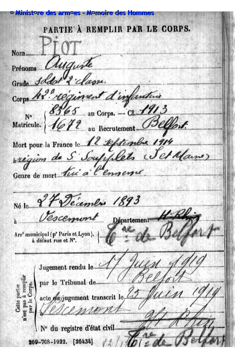 2ème classe PIOT Auguste 27.12.1893 - 13.09.1914 42ème Régiment d'Infanterie Gefallen in Saint-Soupplets - Marne (F) |