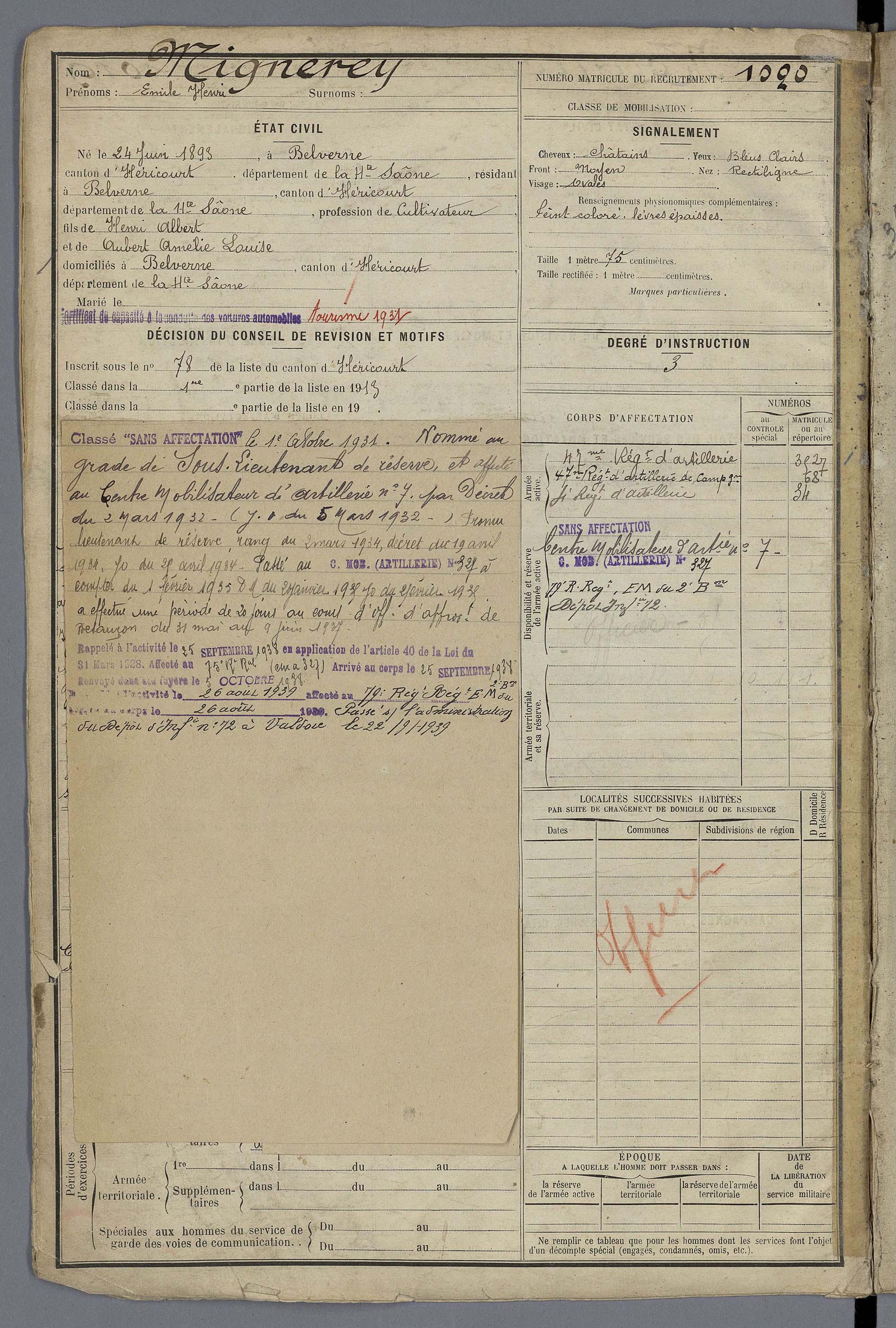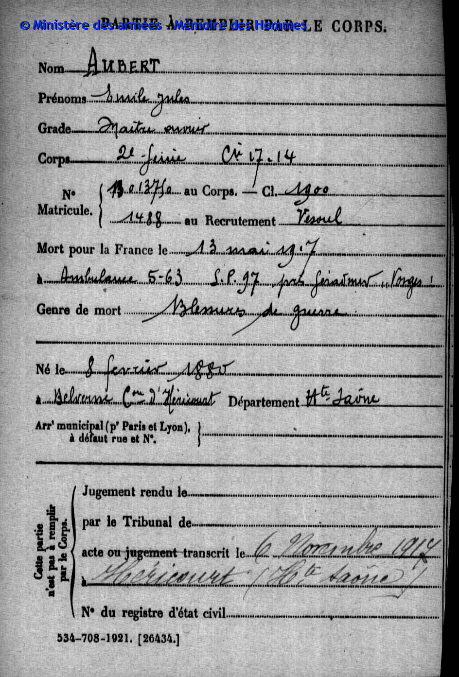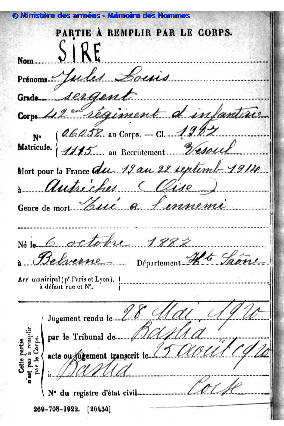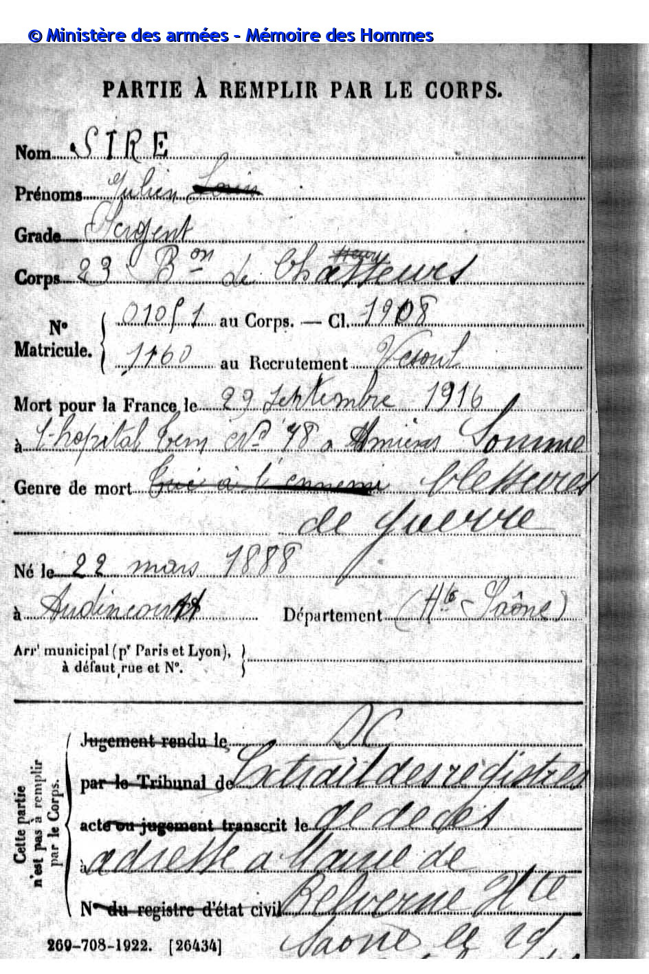 | Sergent SIRE Julien Louis 22.03.1888 - 29.09.1916 23ème Bataillon de Chasseurs Alpins Verstarb an seinen Wunden in Amiens - Somme (F) |