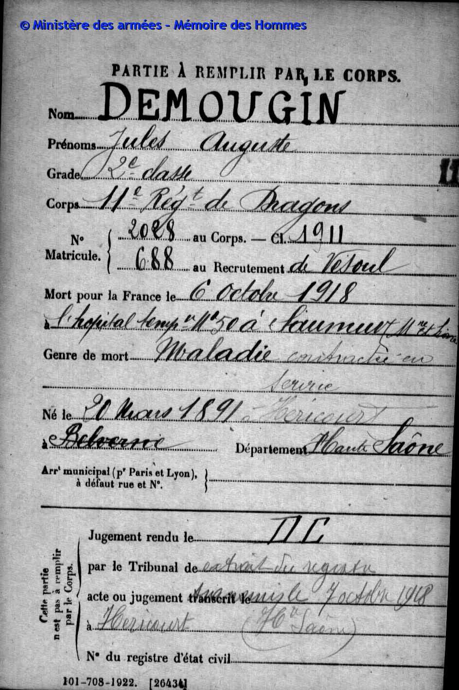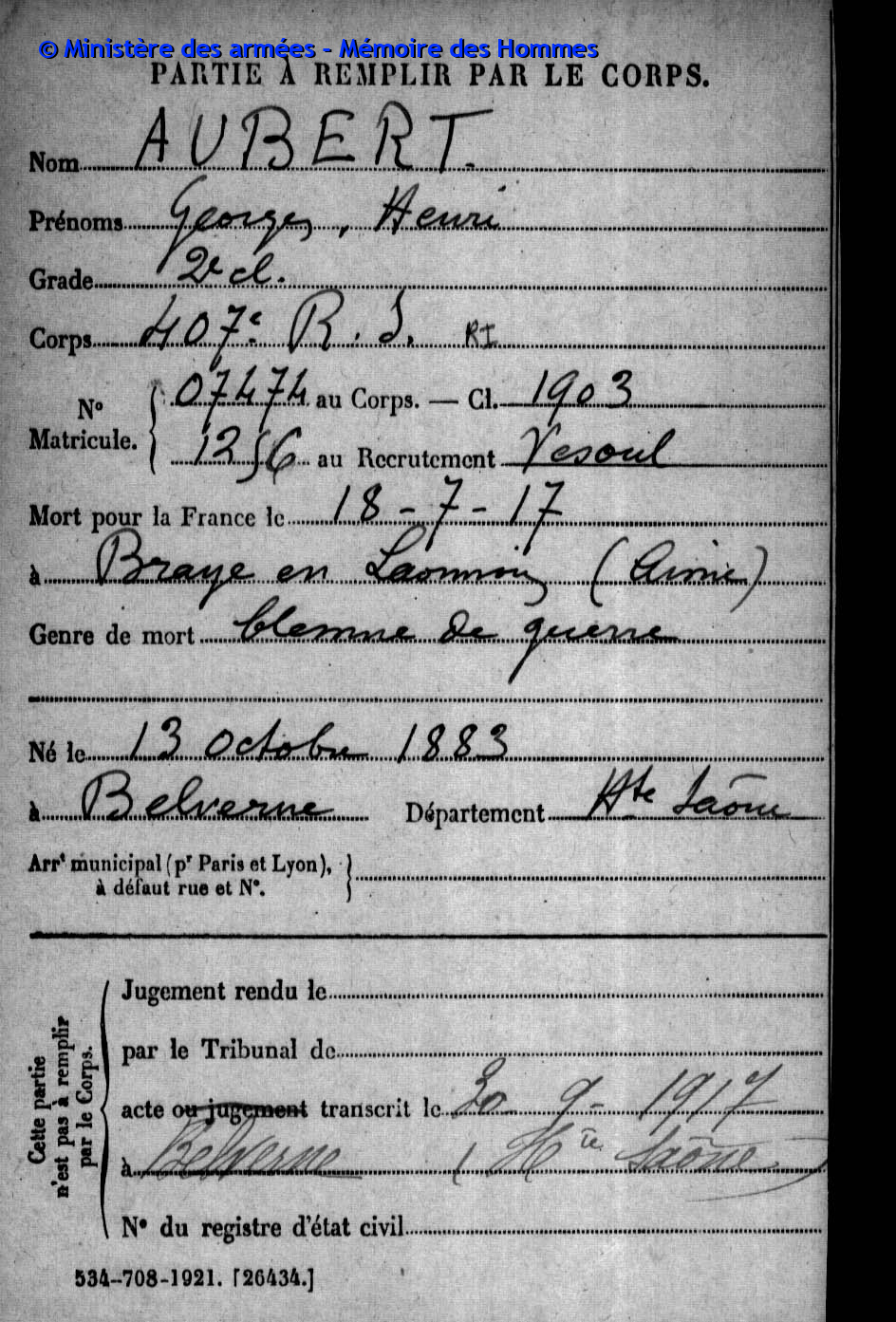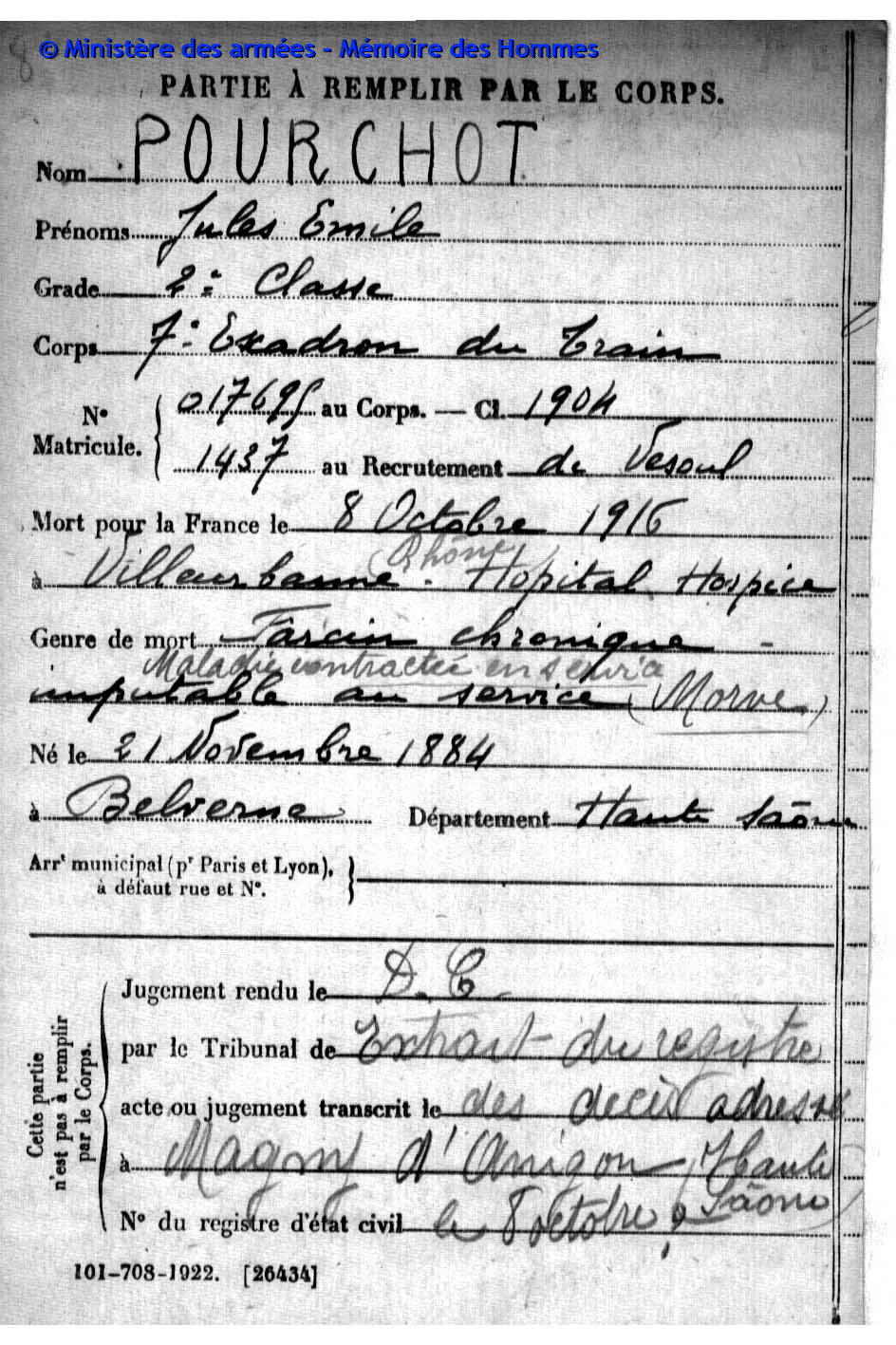 Auf dem Kriegerdenkmal des 6,15 Km2 kleinen Dorfes mit 145 Einwohner im Departement Haute-Saône (F) sind von den 11 verzeichneten Kriegsopfer, 8 mit Fabian Coulot verwandt.