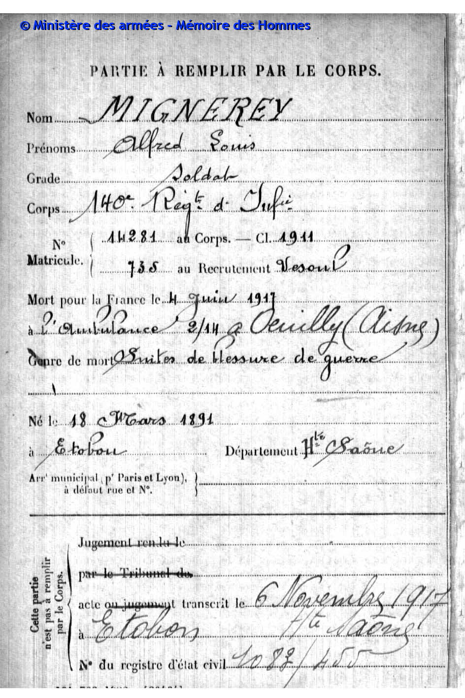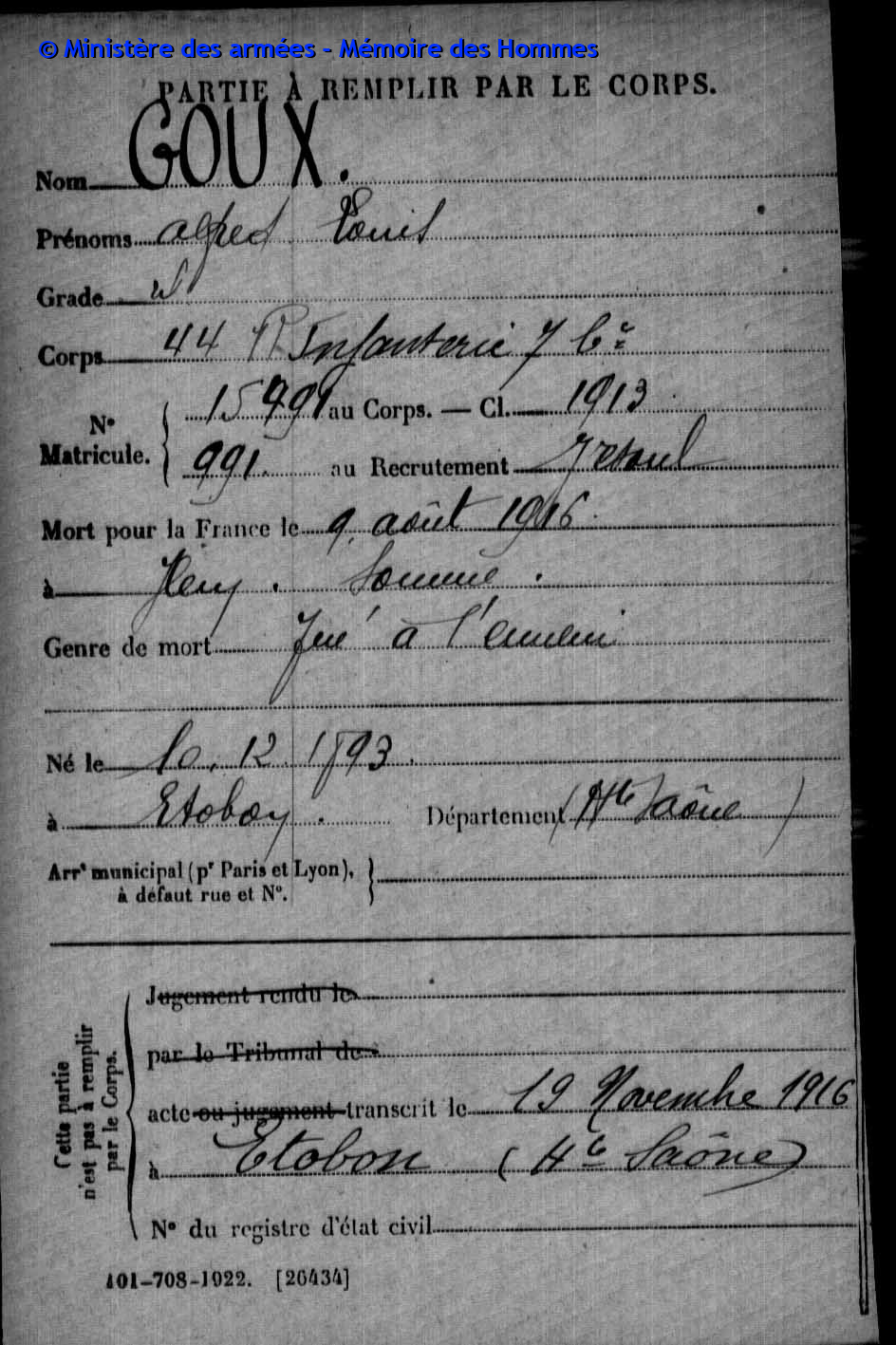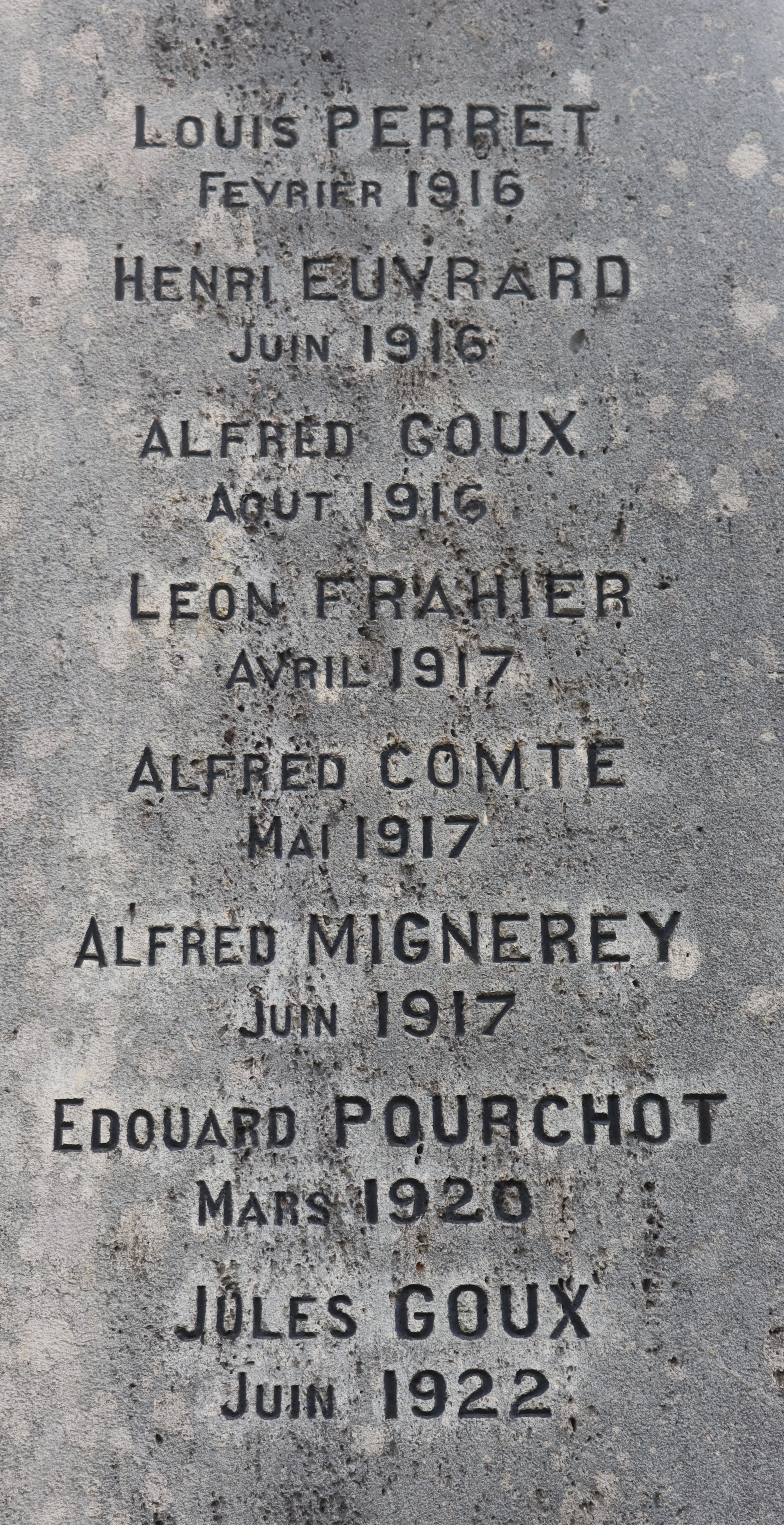 | Soldat GOUX Jules 30.11.1876 - 07.06.1922 42ème Régiment d'Infanterie Verstarb an Kriegsfolgen zu Hause in Etobon (F) |