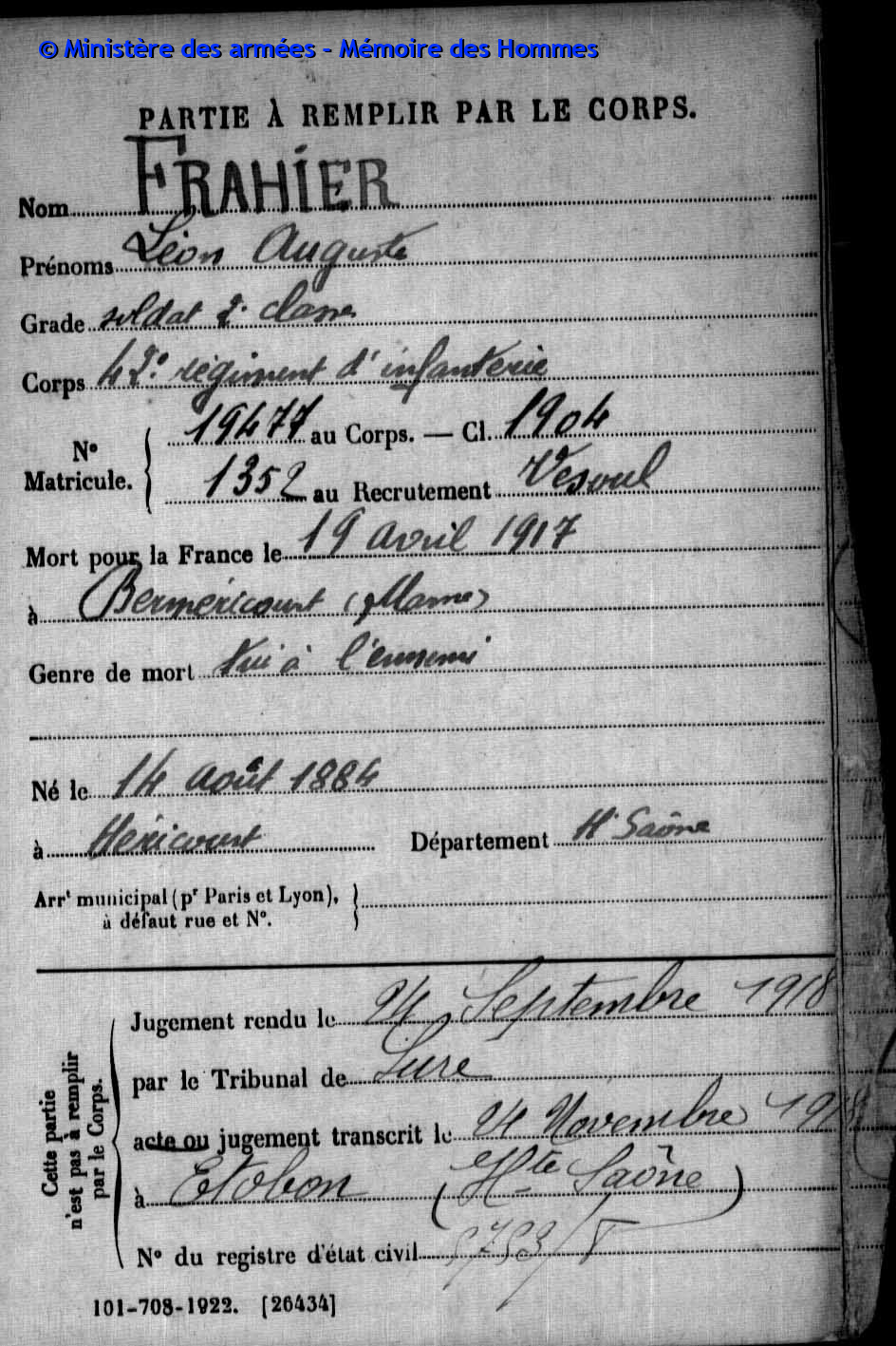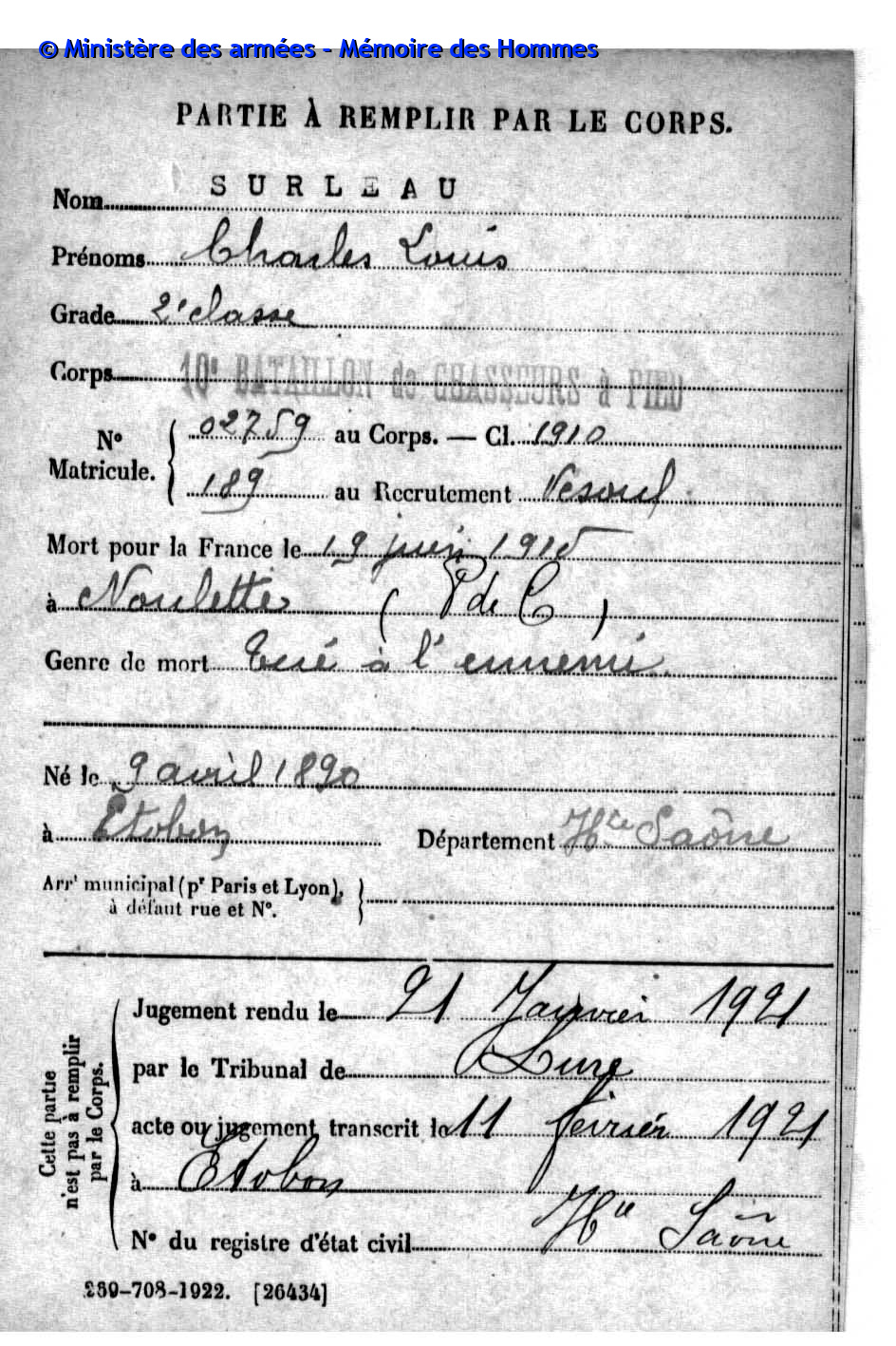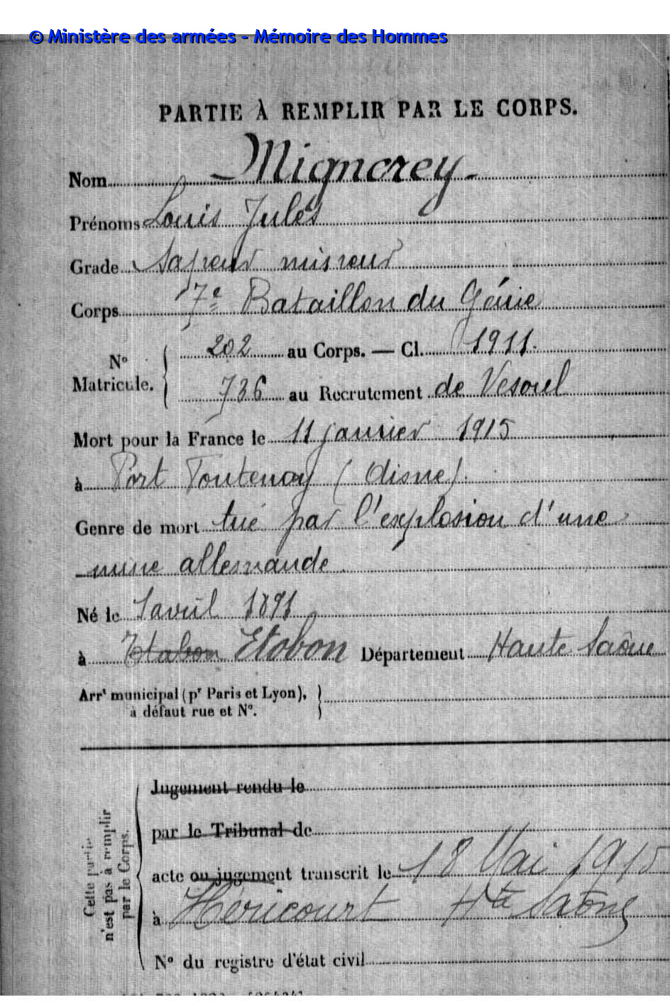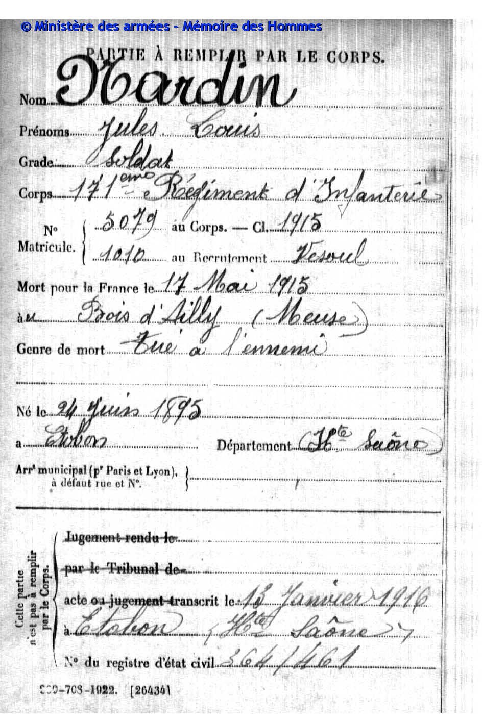 | Soldat NARDIN Jules Louis 24.06.1895 - 17.05.1915 171ème Régiment d'Infanterie Gefallen in Ailly - Meuse (F) |