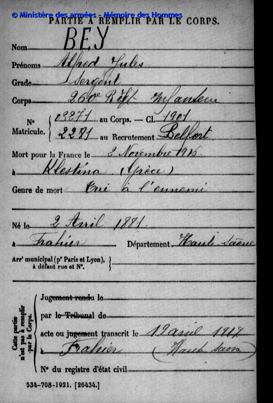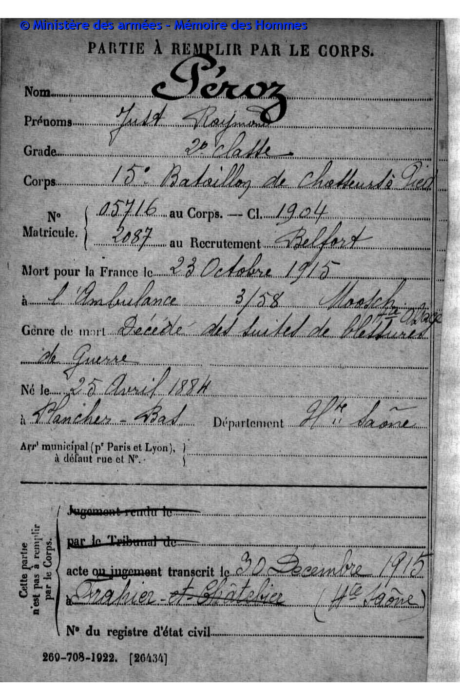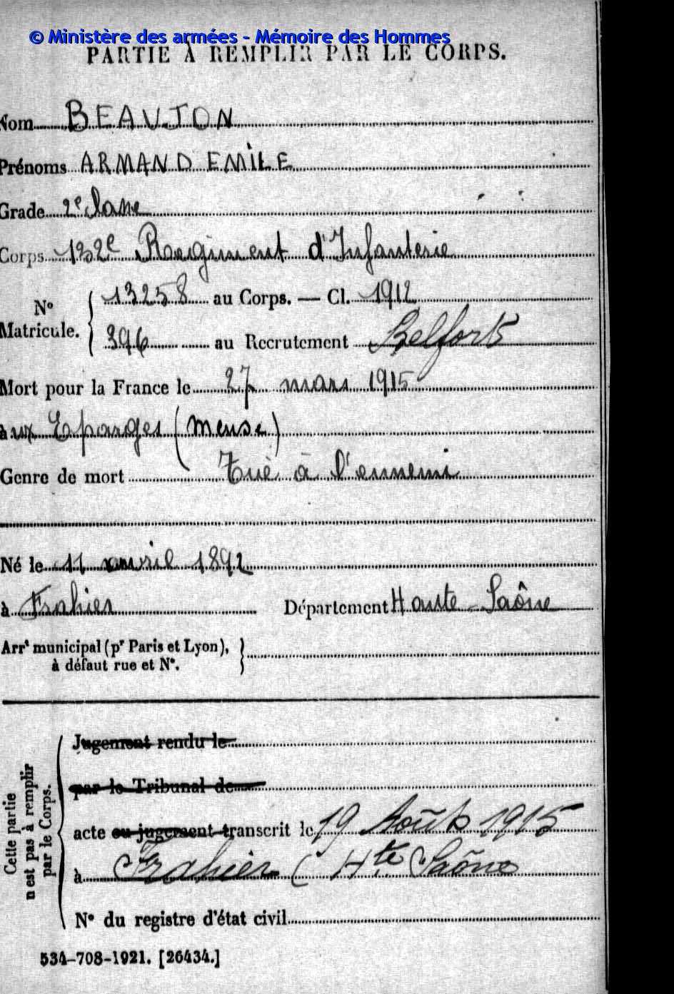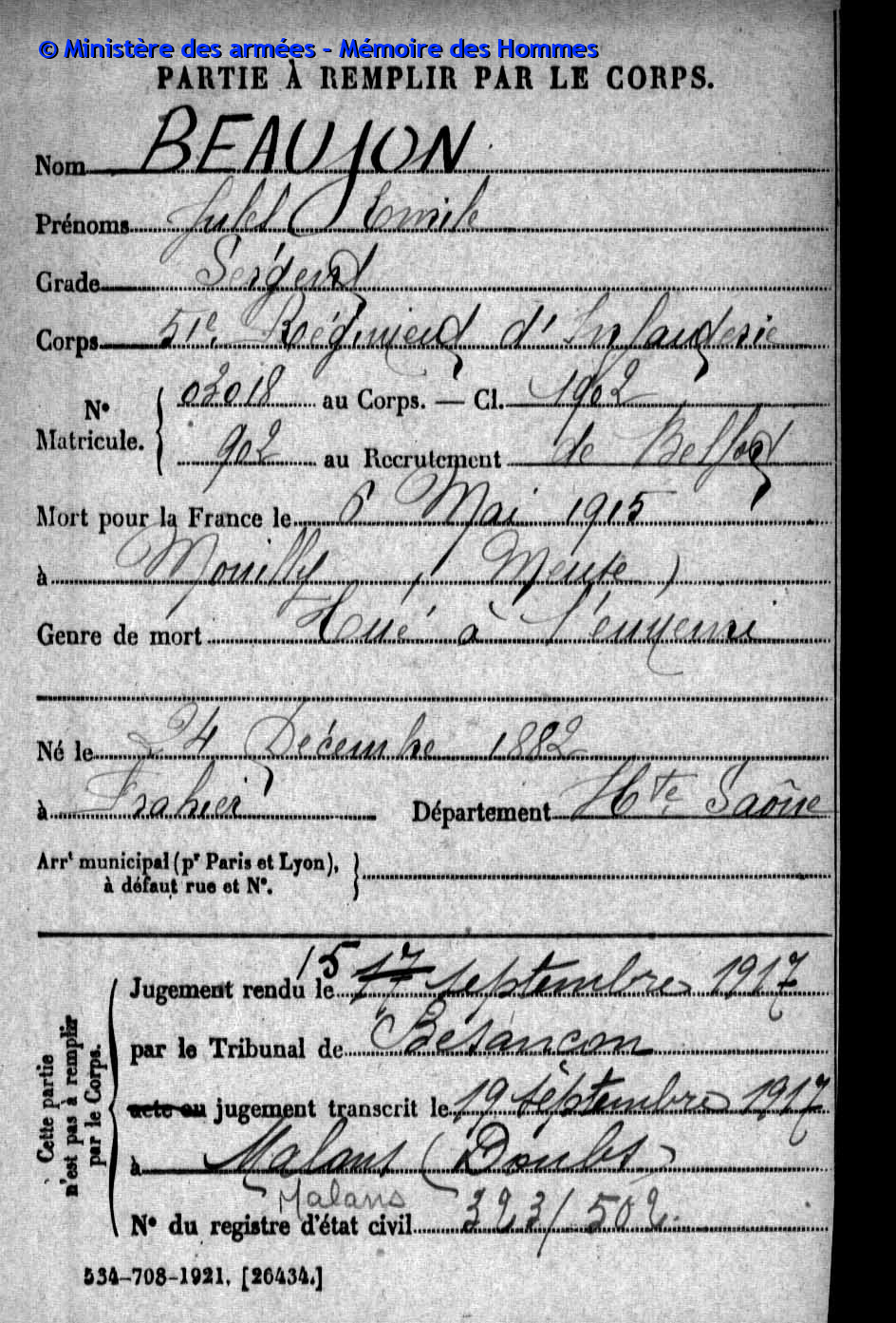 | Sergent BEAUJON Jules Emile 24.12.1882 - 06.05.1915 51ème Régiment d'Infanterie Gefallen in Mouilly - Meuse (F) |