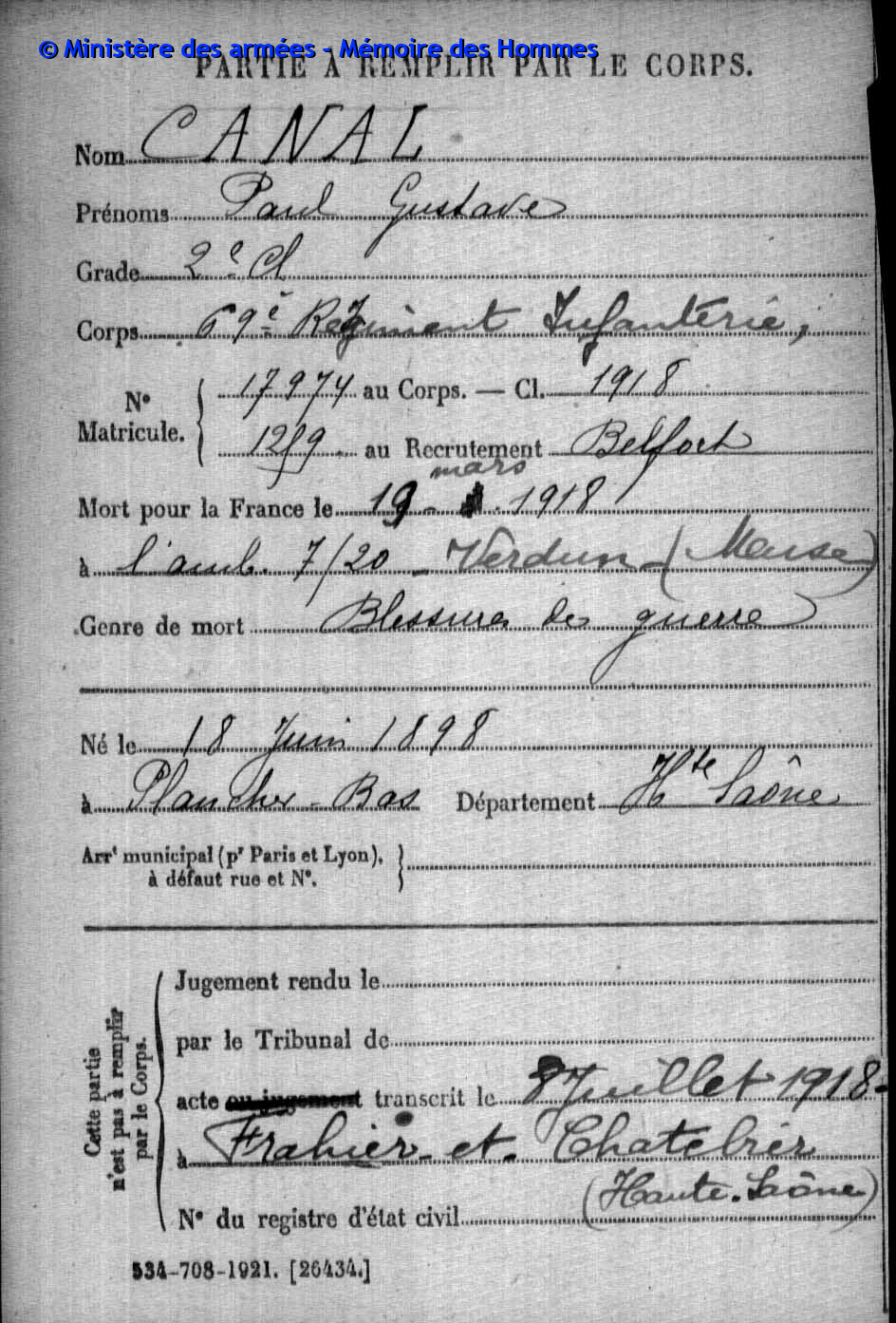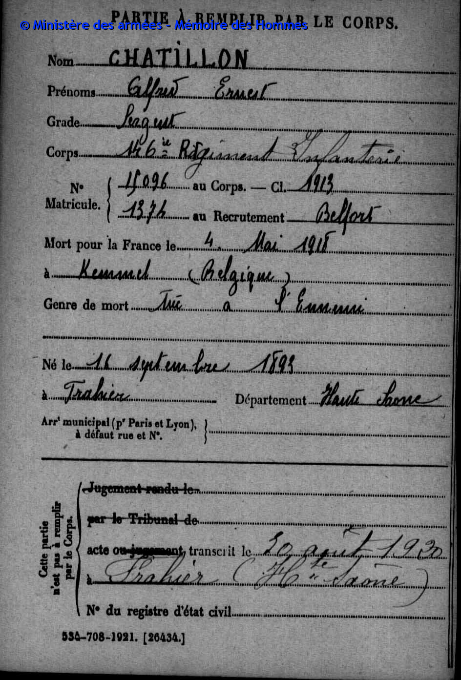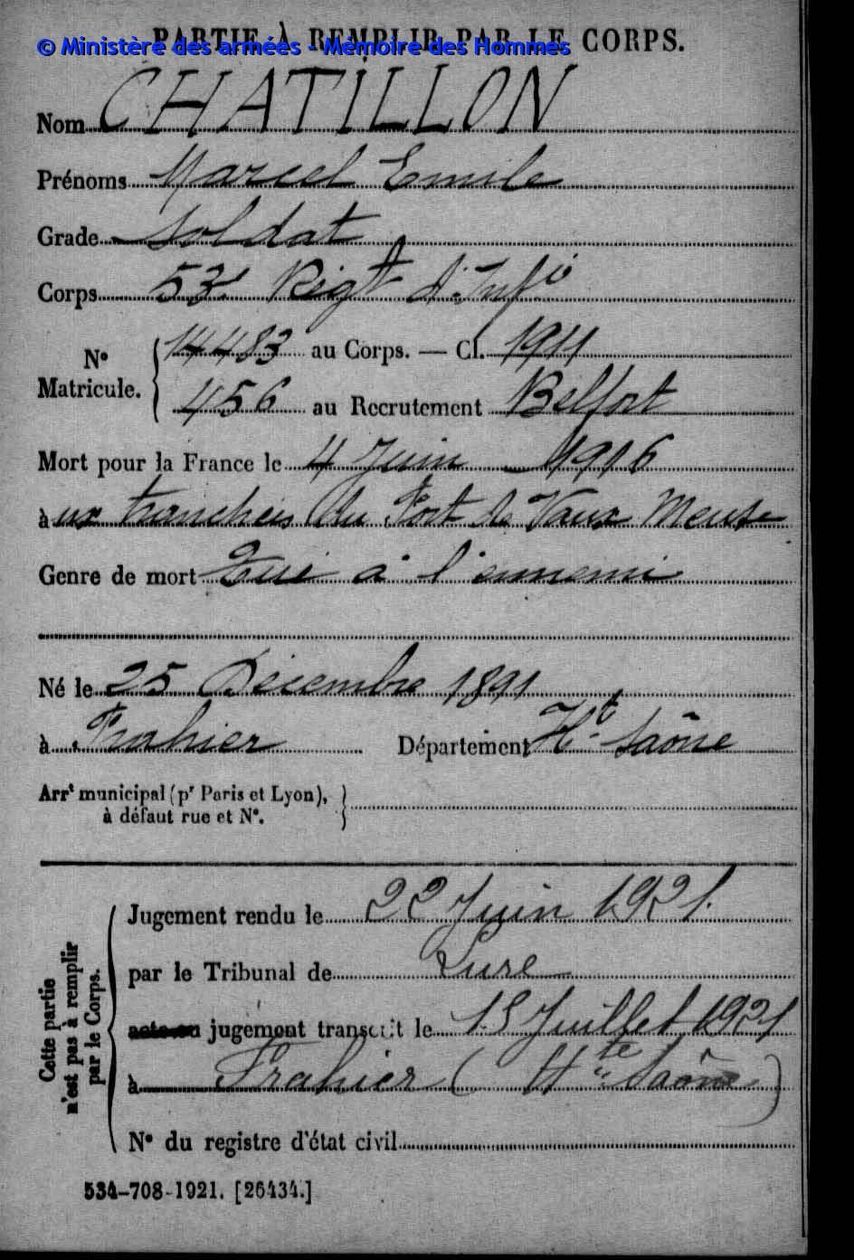 | Soldat CHATILLON Marcel Emile 25.12.1891 - 04.06.1916 53ème Régiment d'Infanterie Gefallen in Verdun (F) |