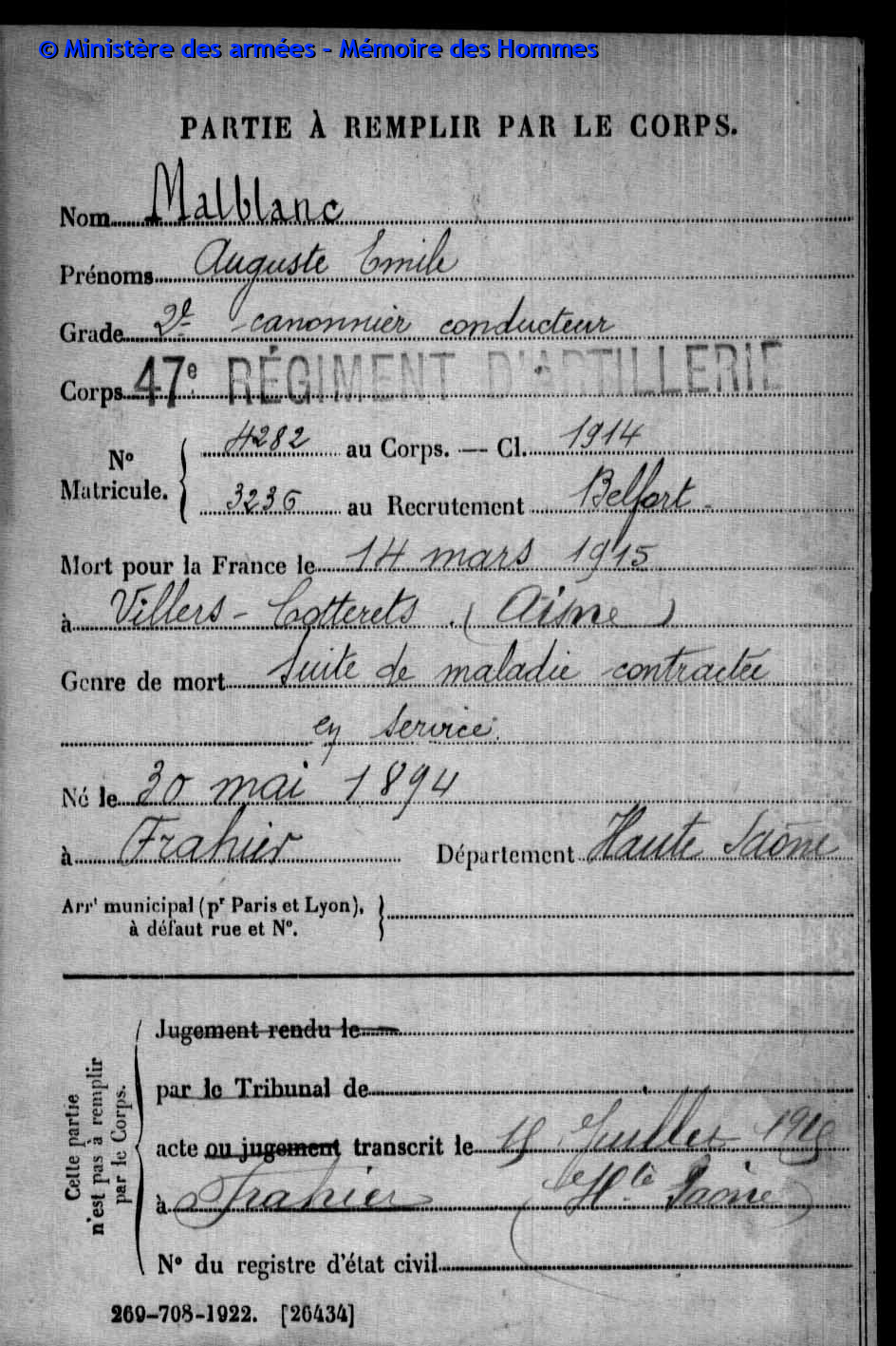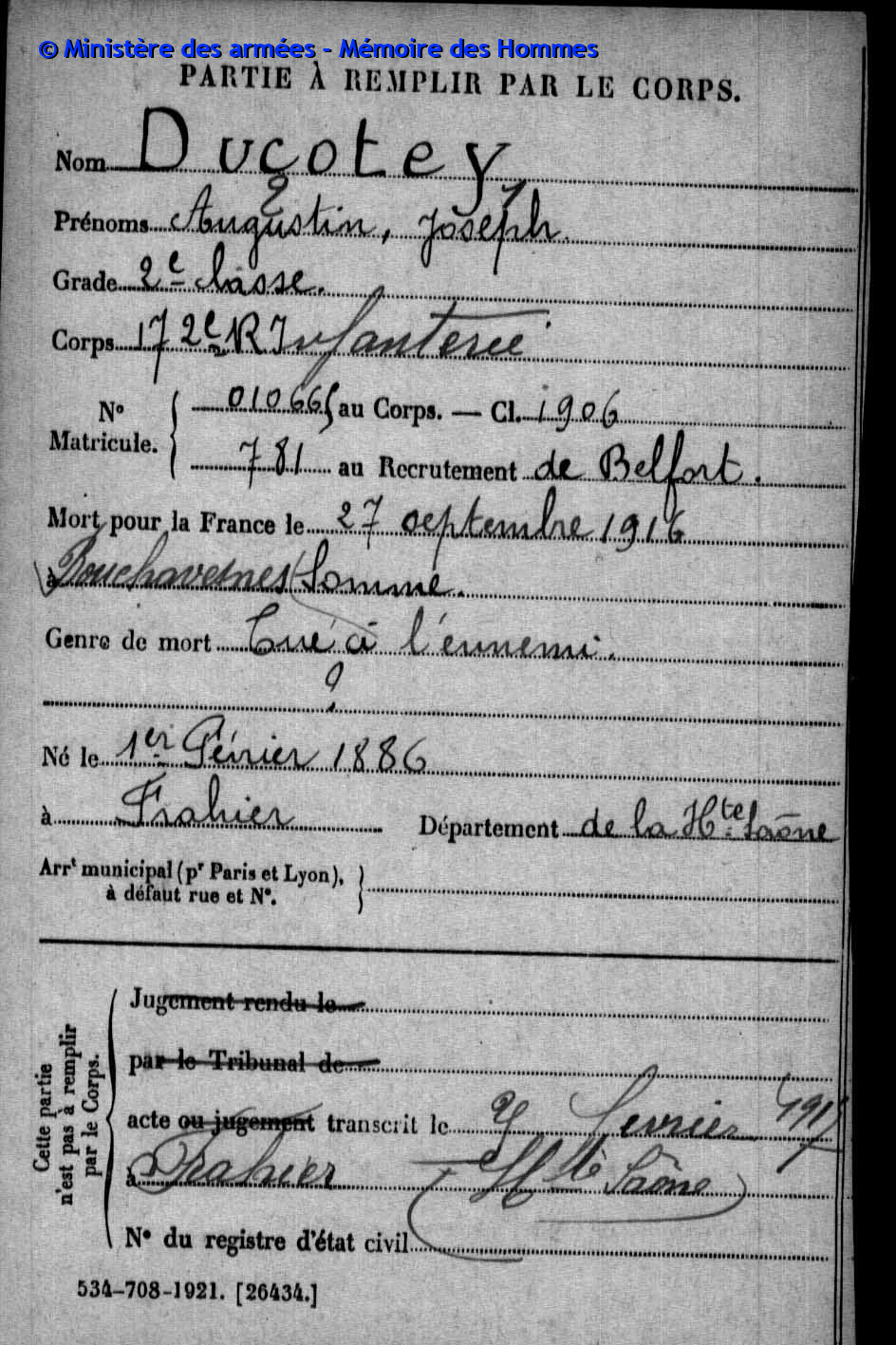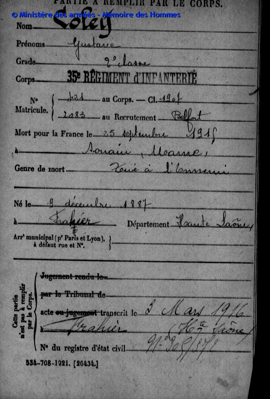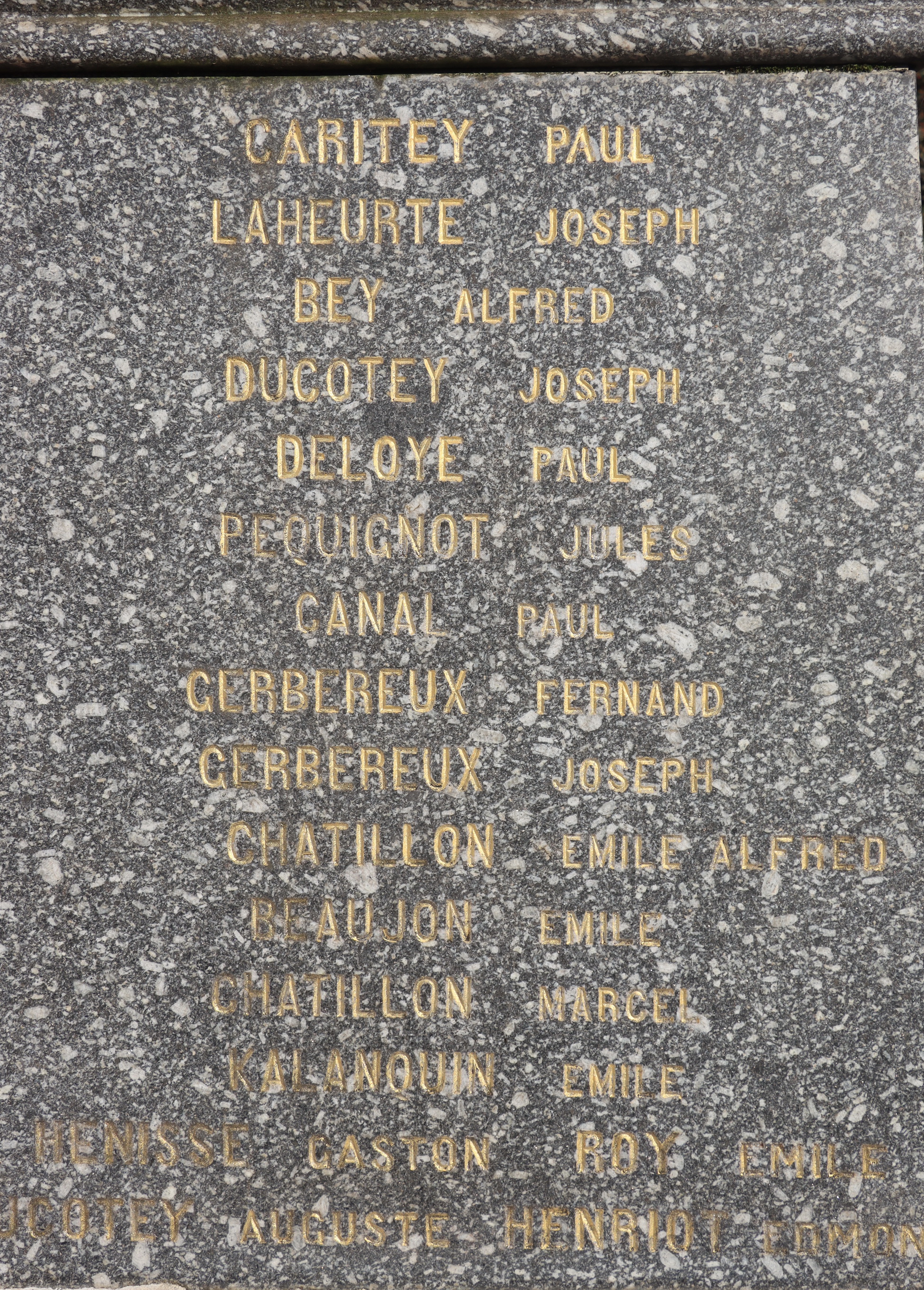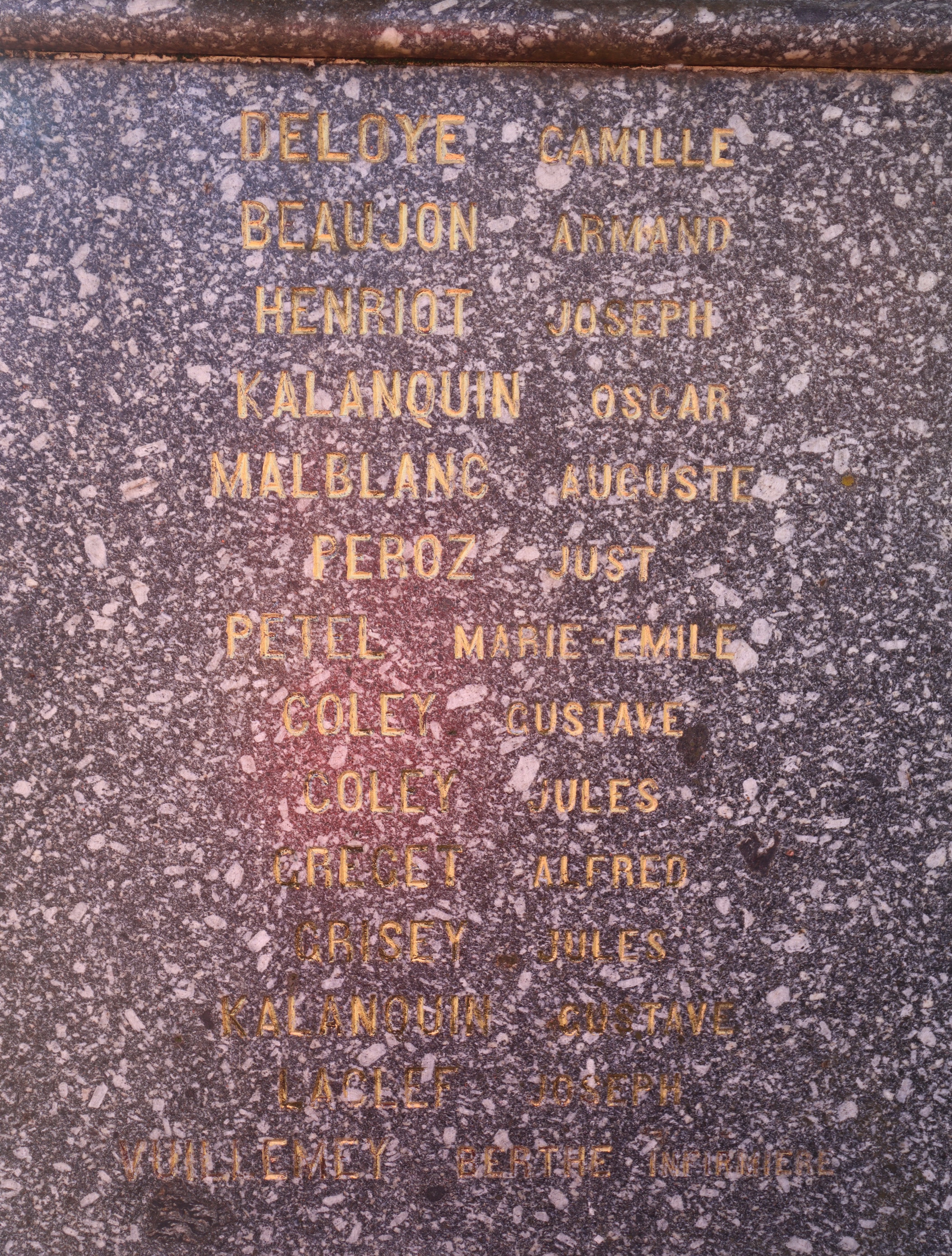 Auf dem Kriegerdenkmal der 17,39 Km2 grossen Gemeinde mit 1379 Einwohner im Departement Haute-Saòne (F) sind 46 Soldaten verzeichnet,davon sind 35 mit Fabian Coulot verwandt.