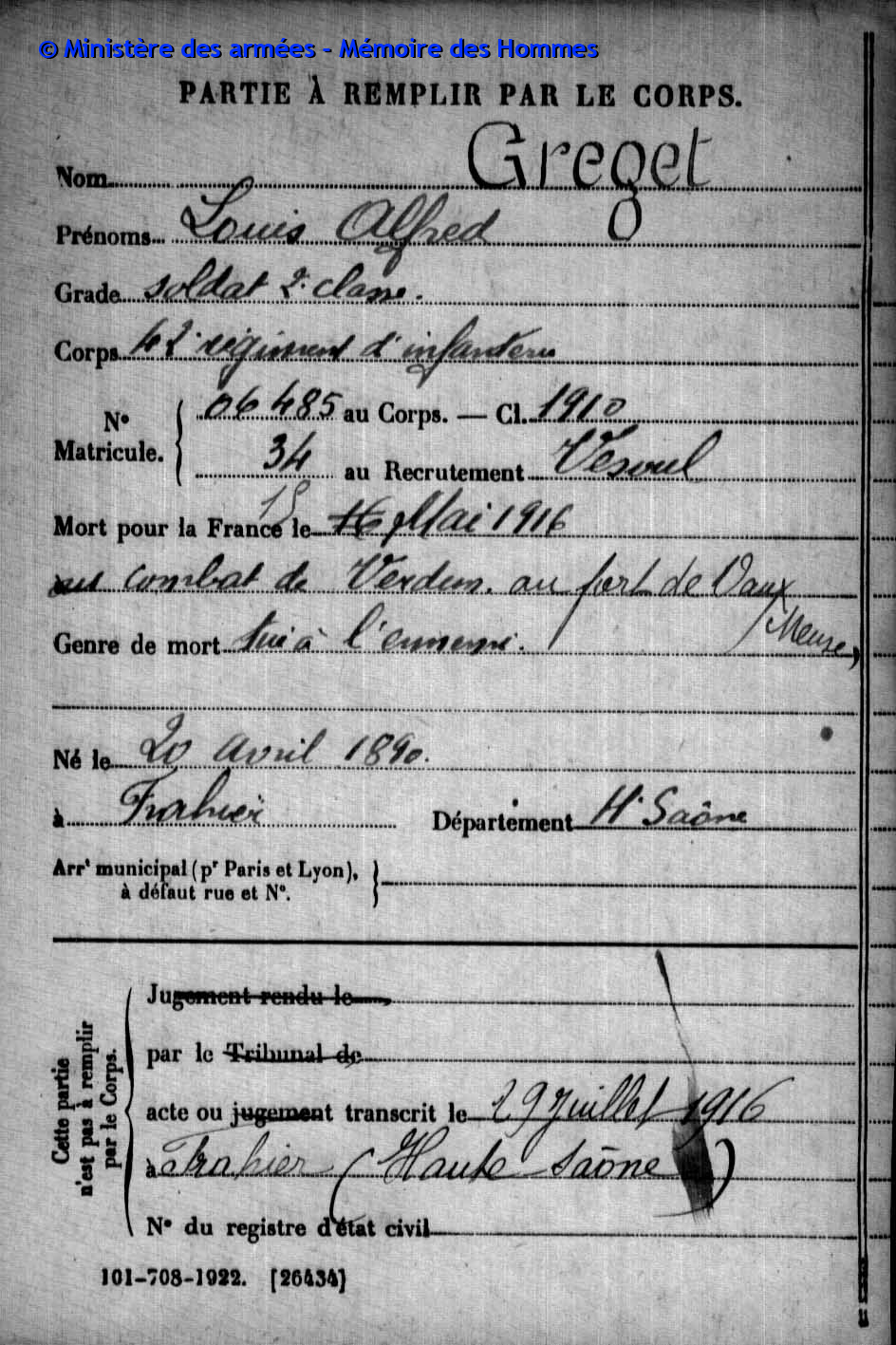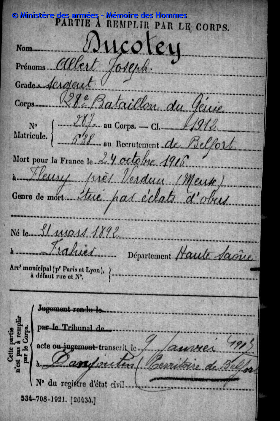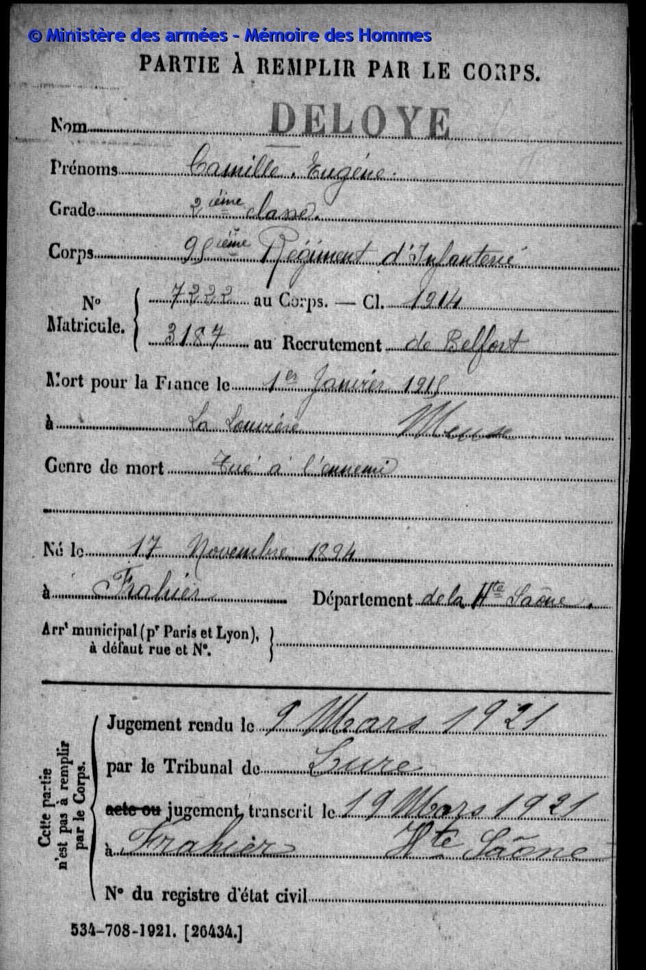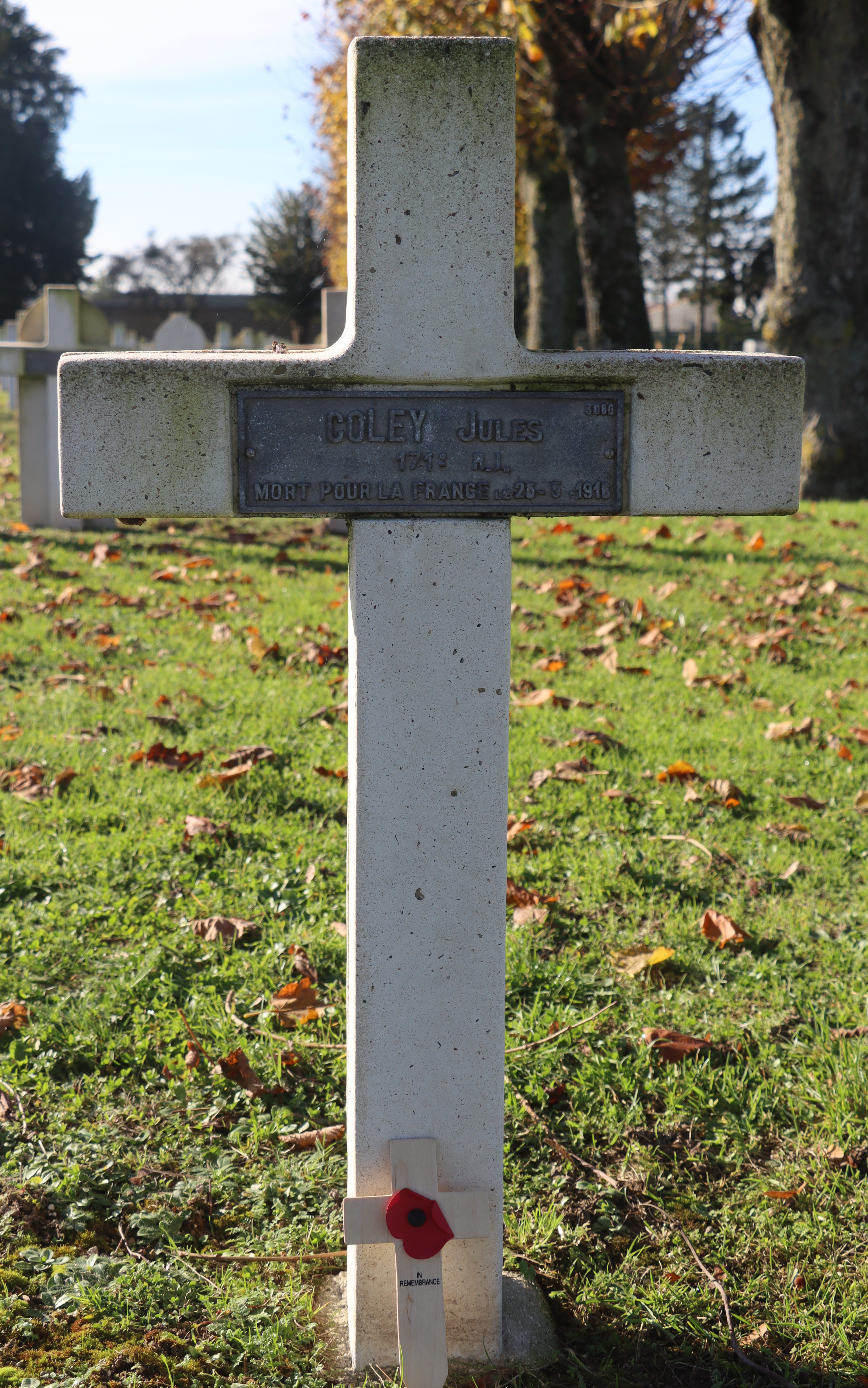 Auf dem Kriegerdenkmal der 17,39 Km2 grossen Gemeinde mit 1379 Einwohner im Departement Haute-Saòne (F) sind 46 Soldaten verzeichnet,davon sind 35 mit Fabian Coulot verwandt.
