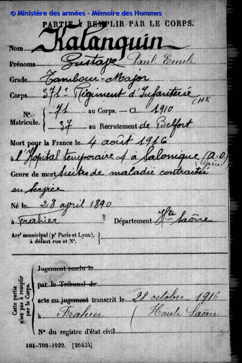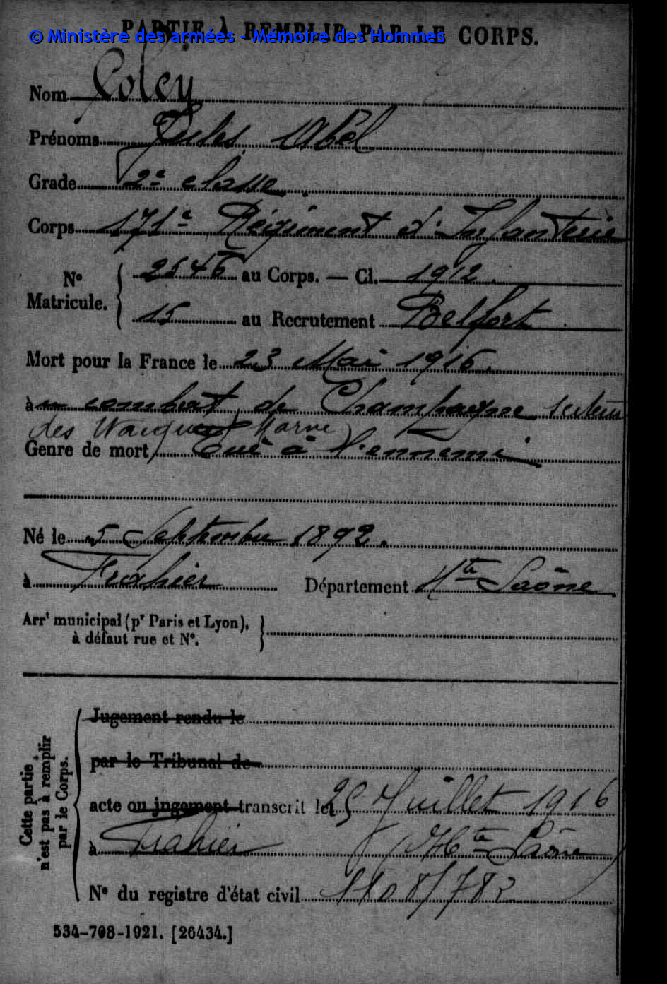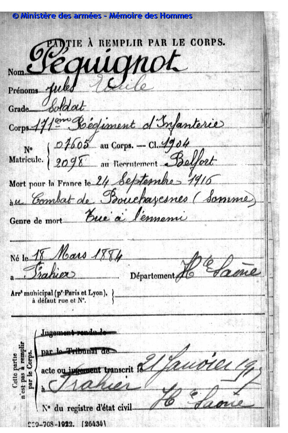 | Soldat PEGUIGNOT Jules Emile 18.03.1884 - 24.09.1916 171ème Régiment d'Infanterie Gefallen in Bouchavesnes - Somme (F) |