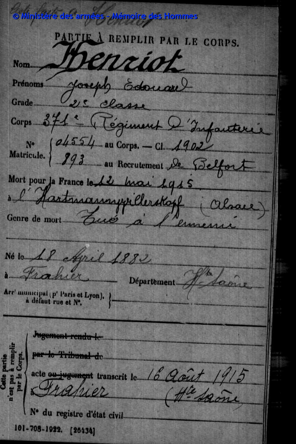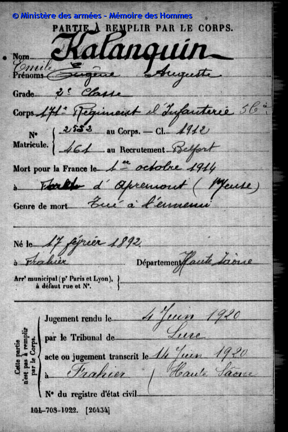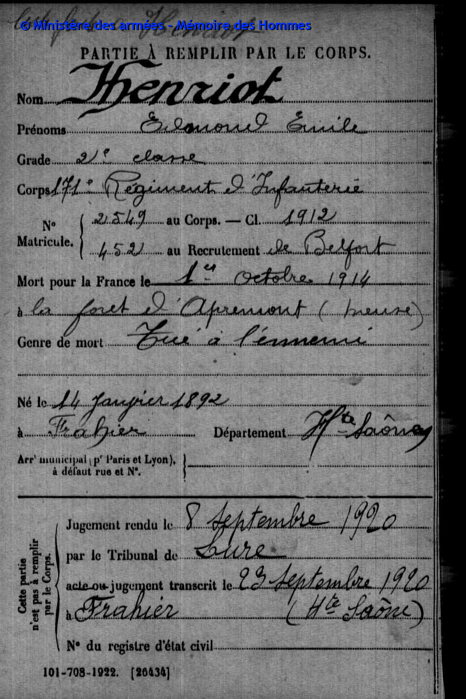 2ème classe HENRIOT Edmond Emile 14.01.1892 - 01.10.1914 171ème Régiment d'Infanterie Gefallen in Apremont - Meuse (F) |