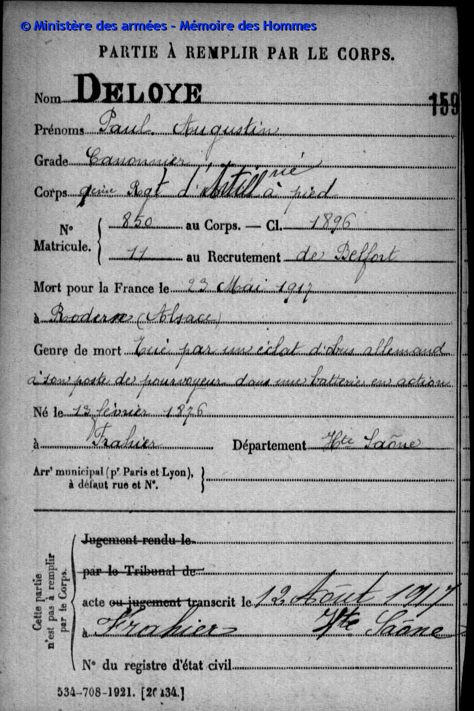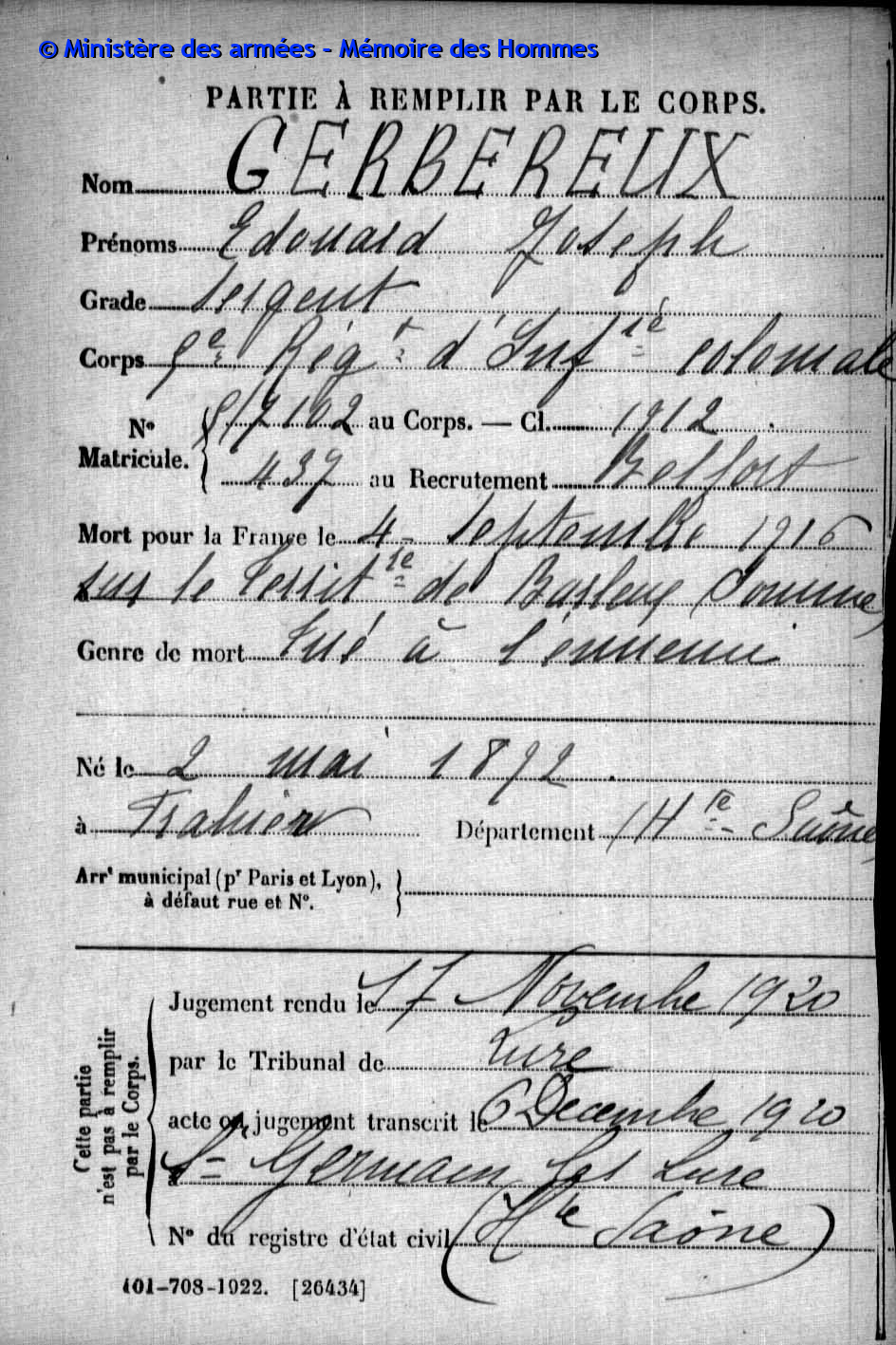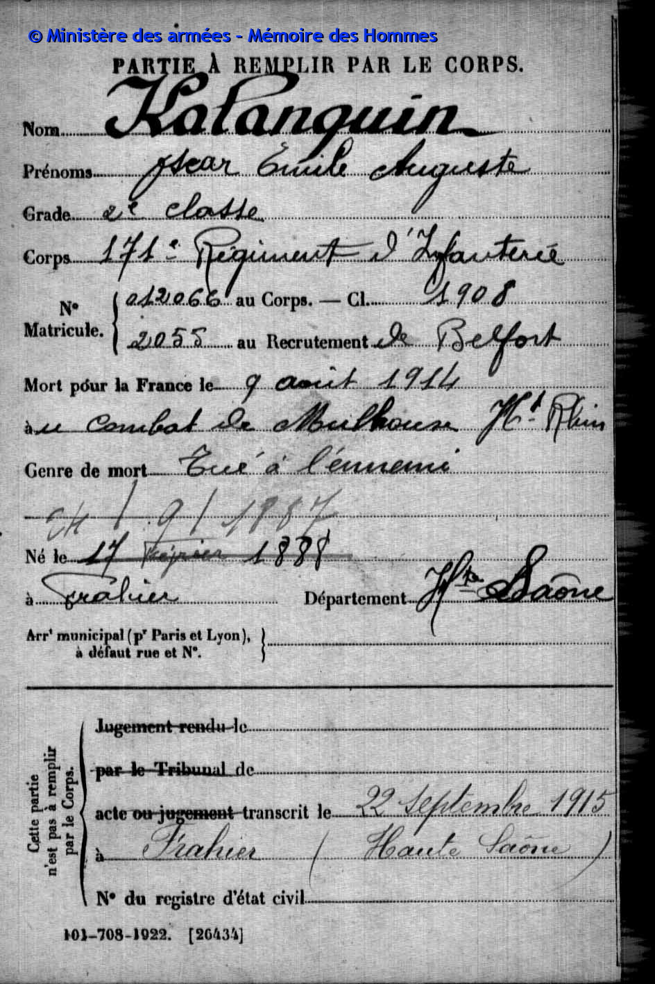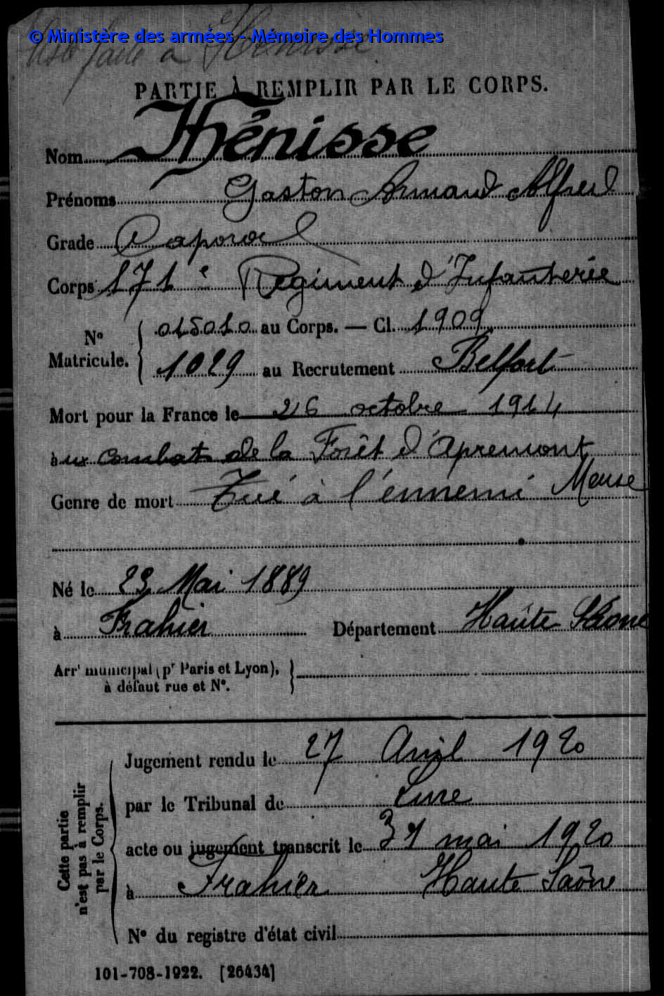 2ème classe HENRIOT Edmond Emile 14.01.1892 - 01.10.1914 171ème Régiment d'Infanterie Gefallen in Apremont - Meuse (F) |