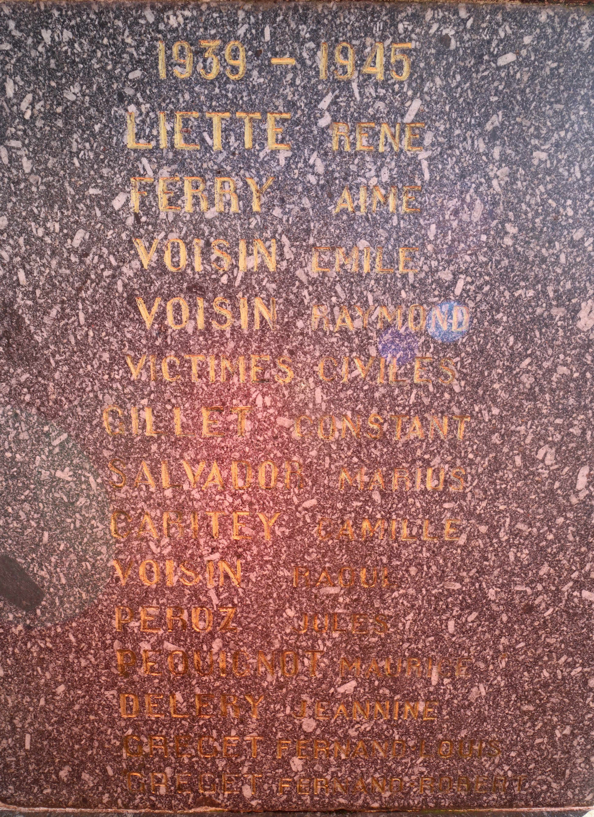 | Knabe GREGET Fernand Robert 26.02.1936 - 29.09.1944 ziviles Kriegsopfer mit seinem Vater Tödlich verwundet durch Granatsplitter von Beschuss der eigenen französischen Artillerie über dem Dorf |