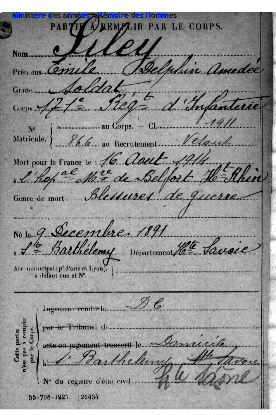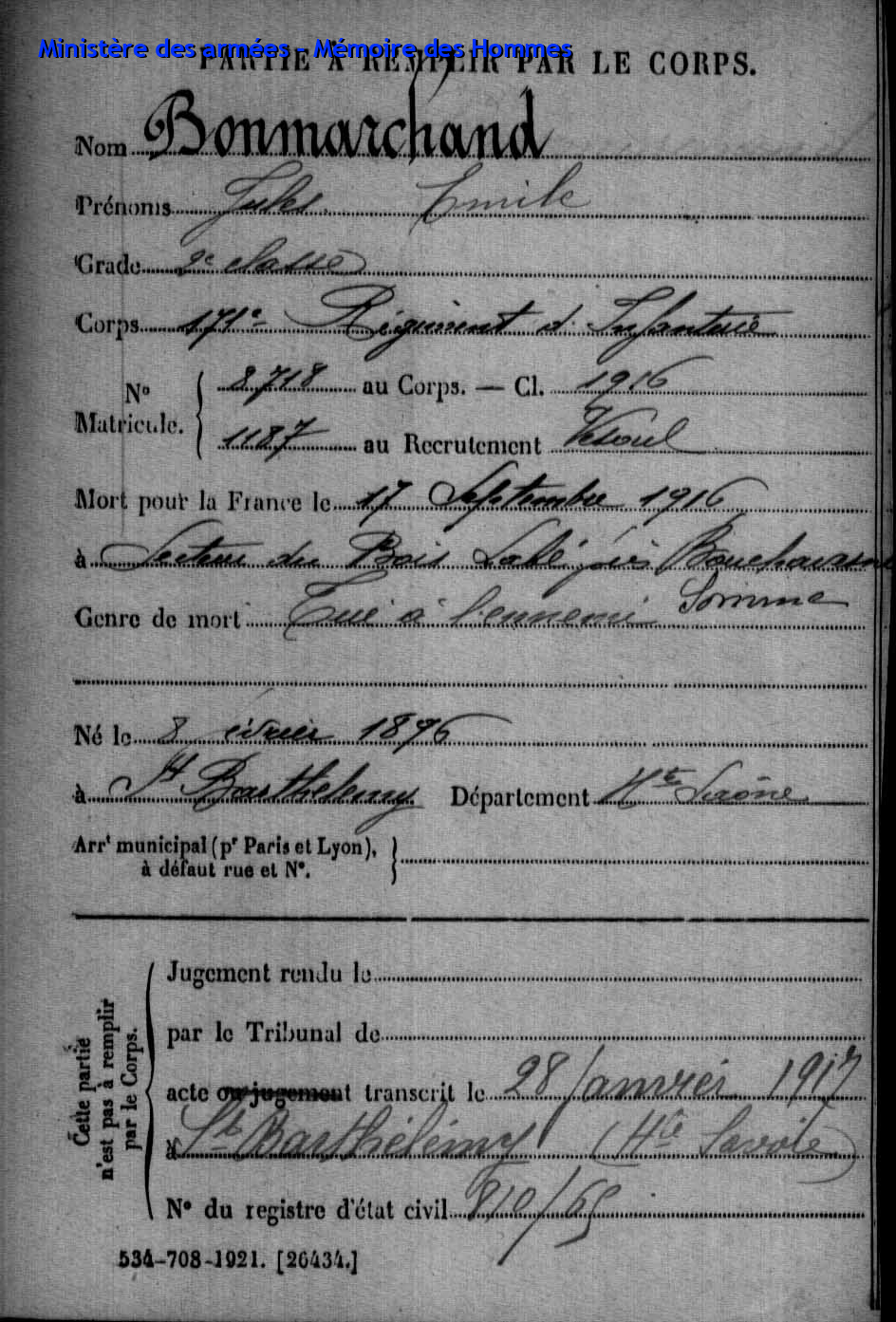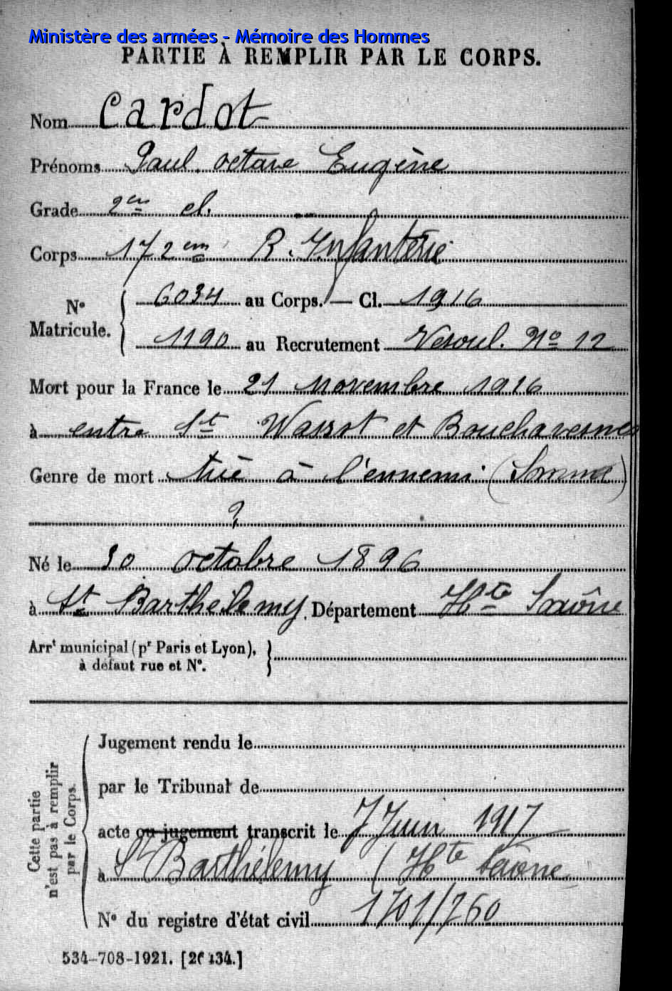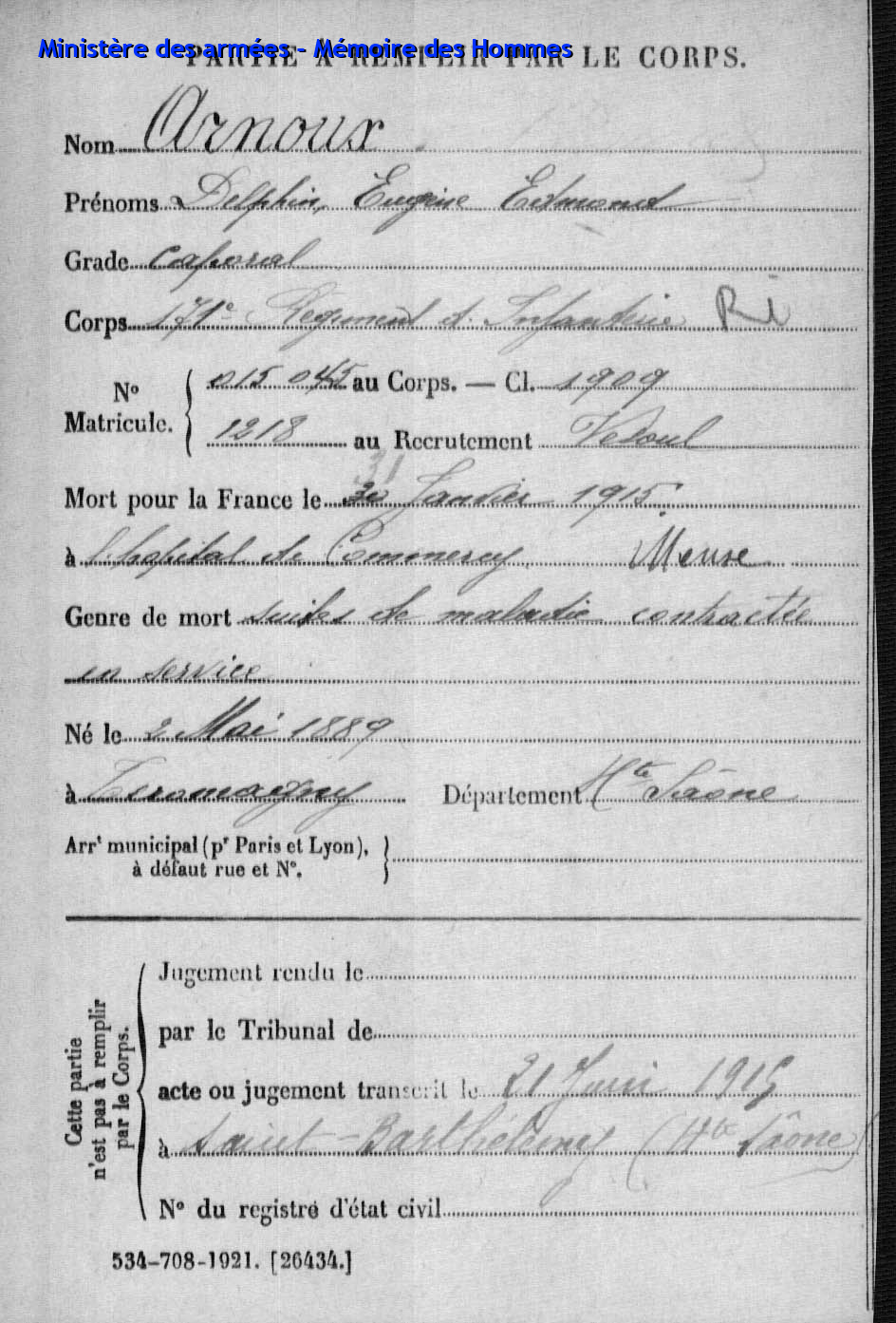 | Soldat GARNIER Alfred Delphin Joseph 05.06.1880 - 13.03.1920 13ème Section des Secrétaires d'Etat Major et du Recrutement Commissariat de l'Armee de Terre Starb an Kriegsfolgen zu Hause in Saint-Barthelemy (F) |