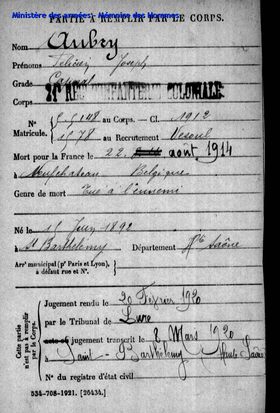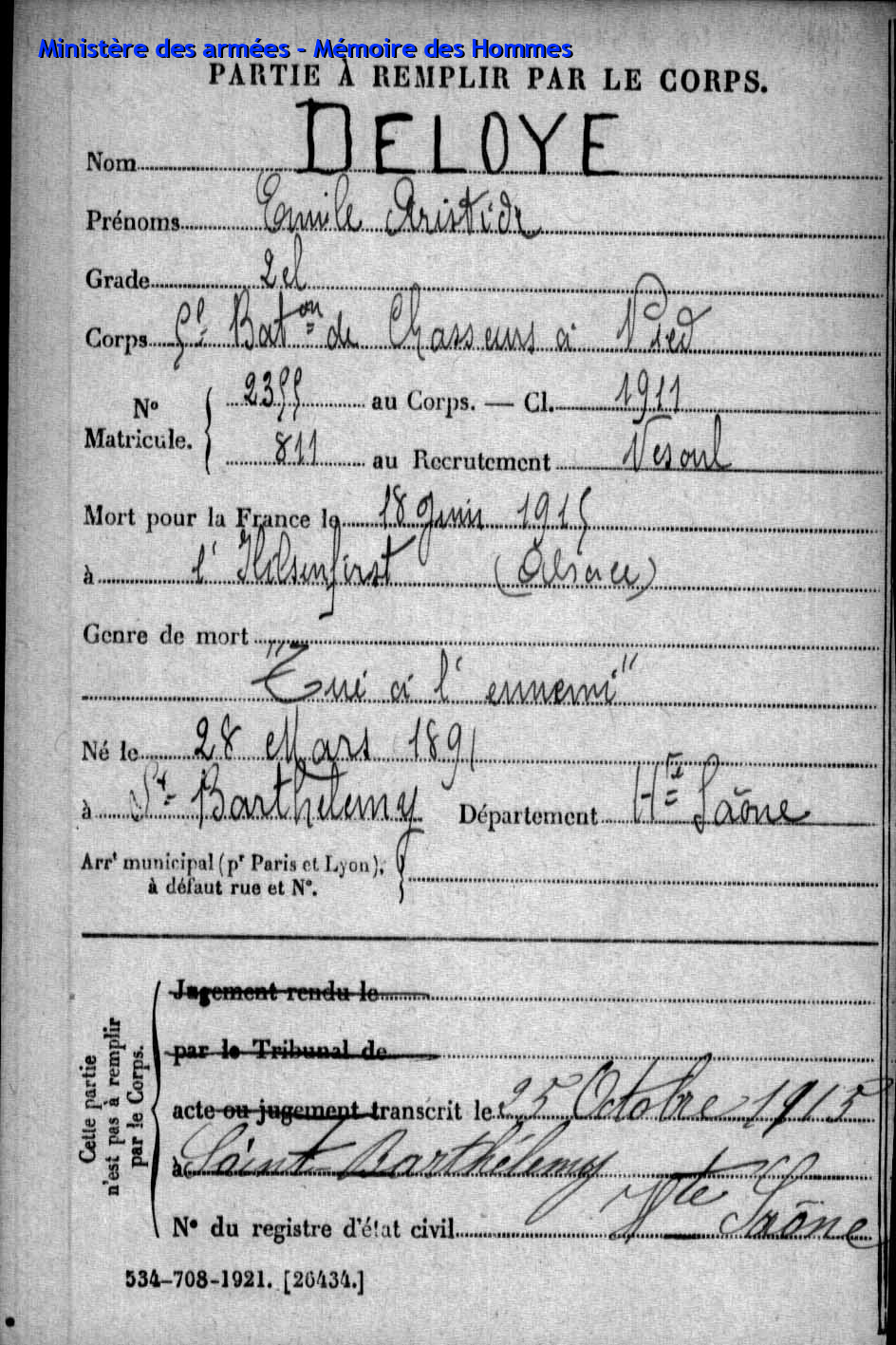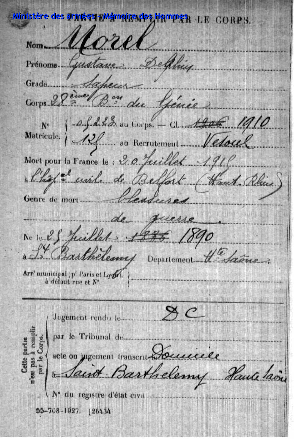 | Soldat GARNIER Alfred Delphin Joseph 05.06.1880 - 13.03.1920 13ème Section des Secrétaires d'Etat Major et du Recrutement Commissariat de l'Armee de Terre Starb an Kriegsfolgen zu Hause in Saint-Barthelemy (F) |