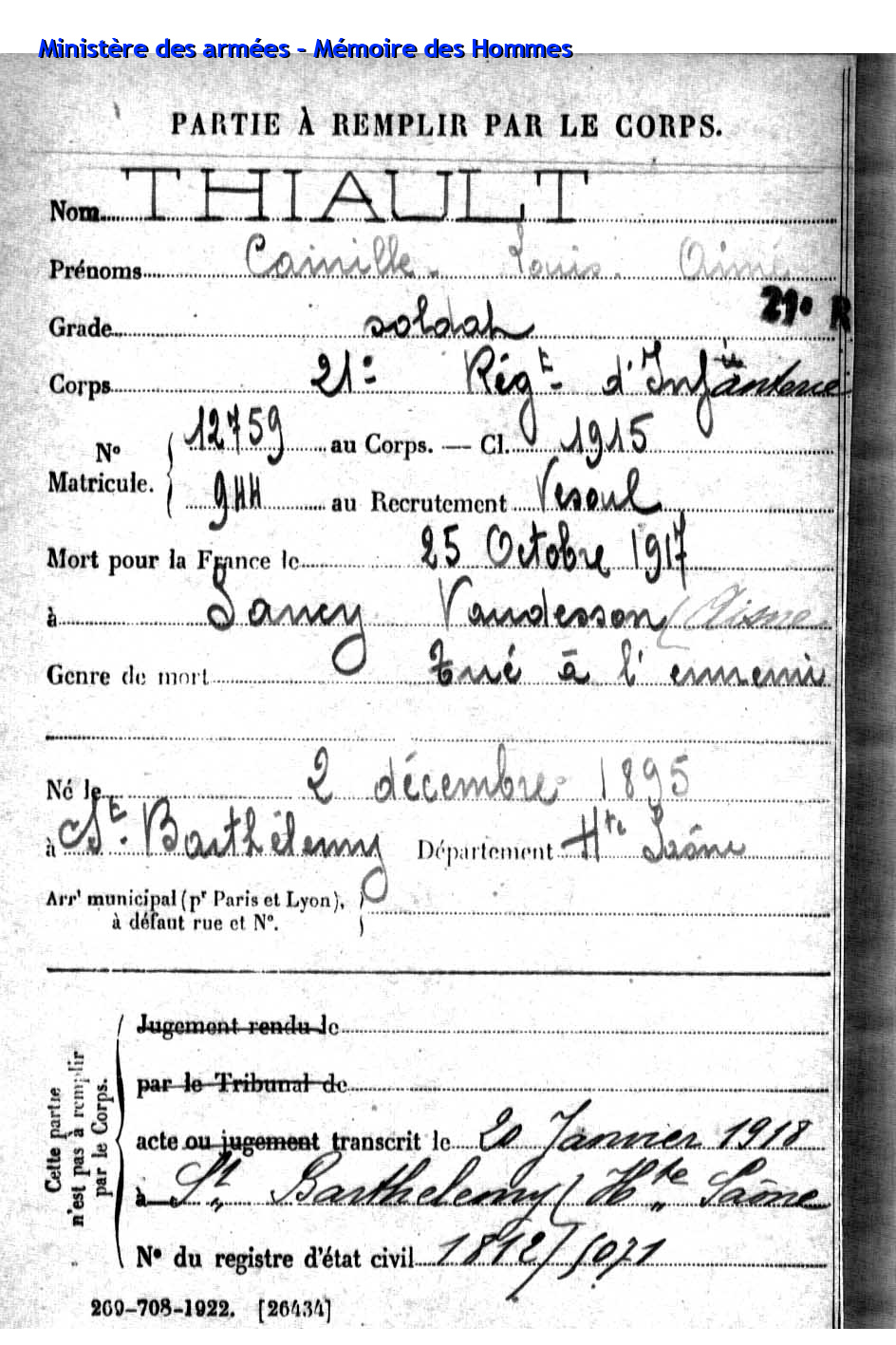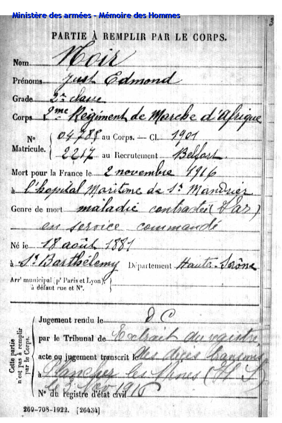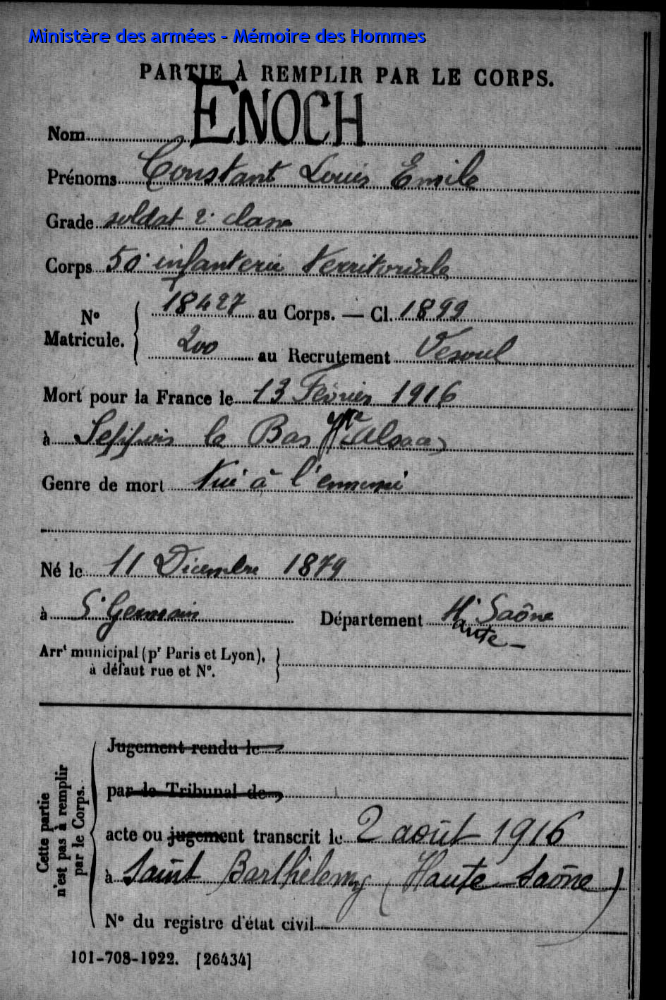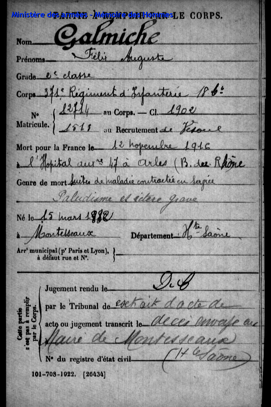 | Soldat GARNIER Alfred Delphin Joseph 05.06.1880 - 13.03.1920 13ème Section des Secrétaires d'Etat Major et du Recrutement Commissariat de l'Armee de Terre Starb an Kriegsfolgen zu Hause in Saint-Barthelemy (F) |